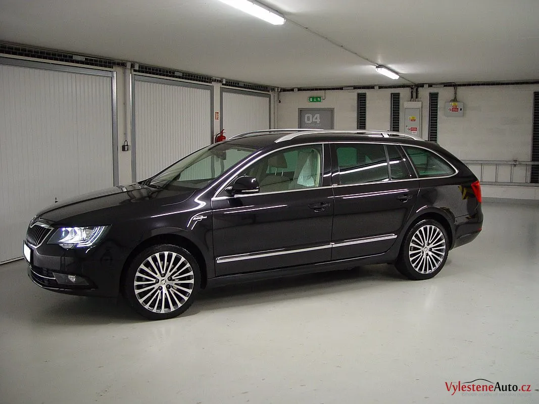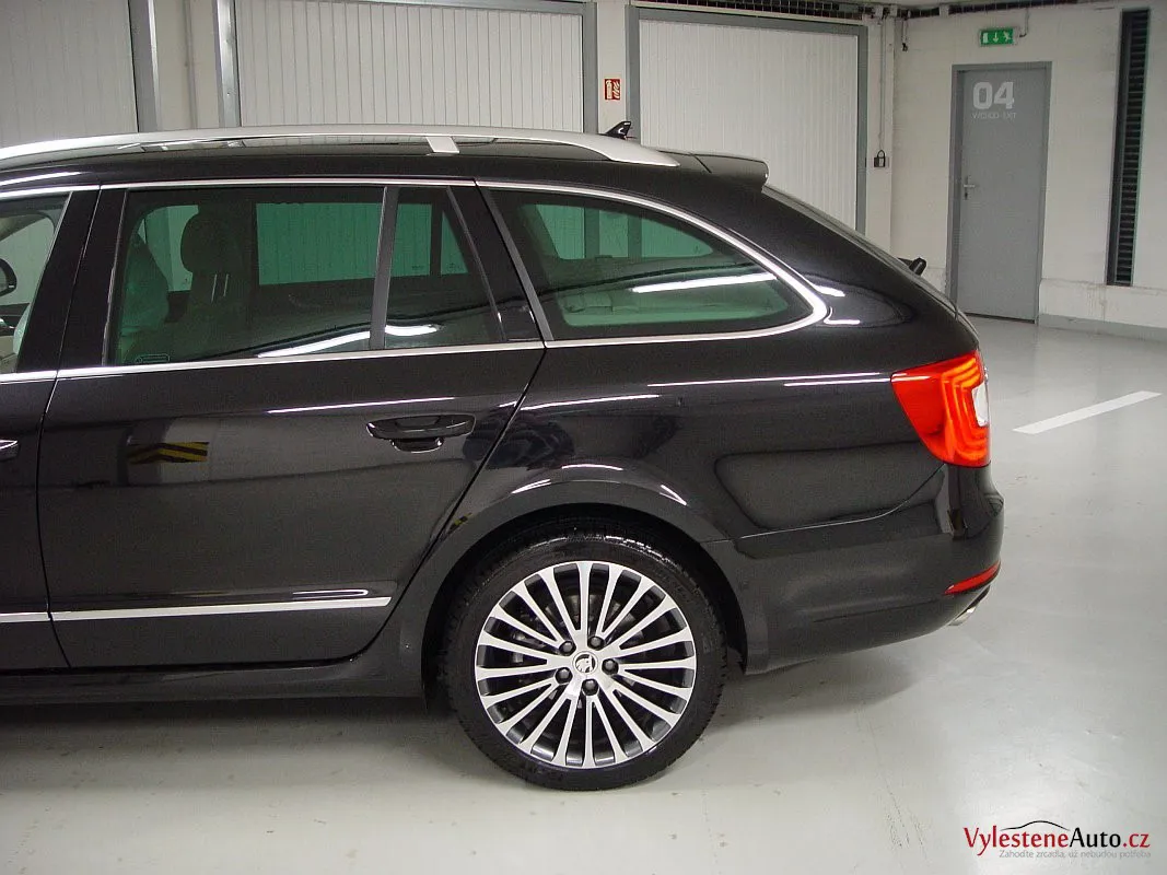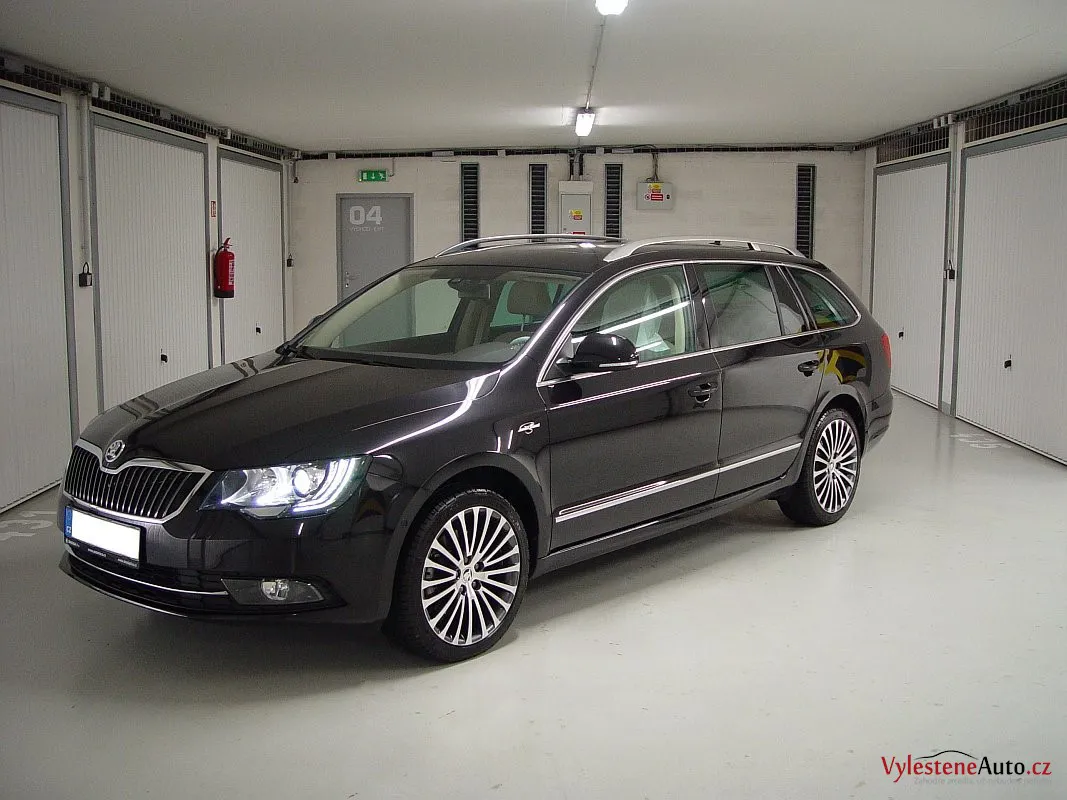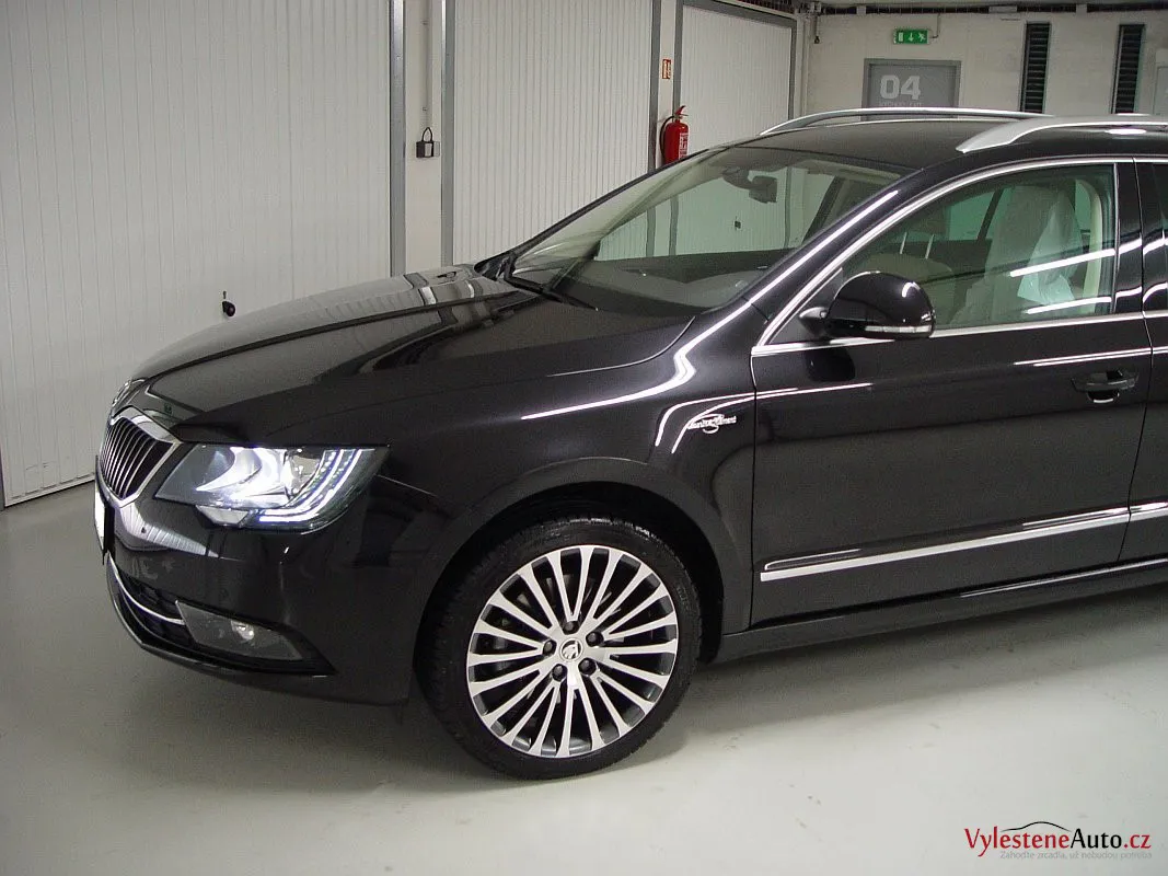 Lahůdková Škoda Superb Laurin&Klement, vybavená turbodieslovým motorem, pohonem všech kol a automatickou převodovkou. Zatímco exteriér zdobí černá perleťová metalíza a originální litá kola, interiér oplývá bílou kůží, chromovanými díly a dřevem.