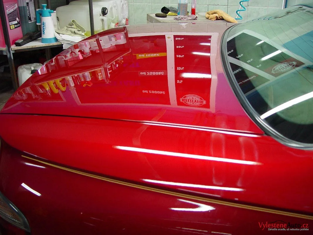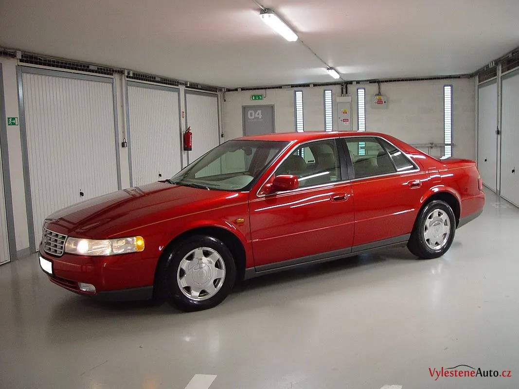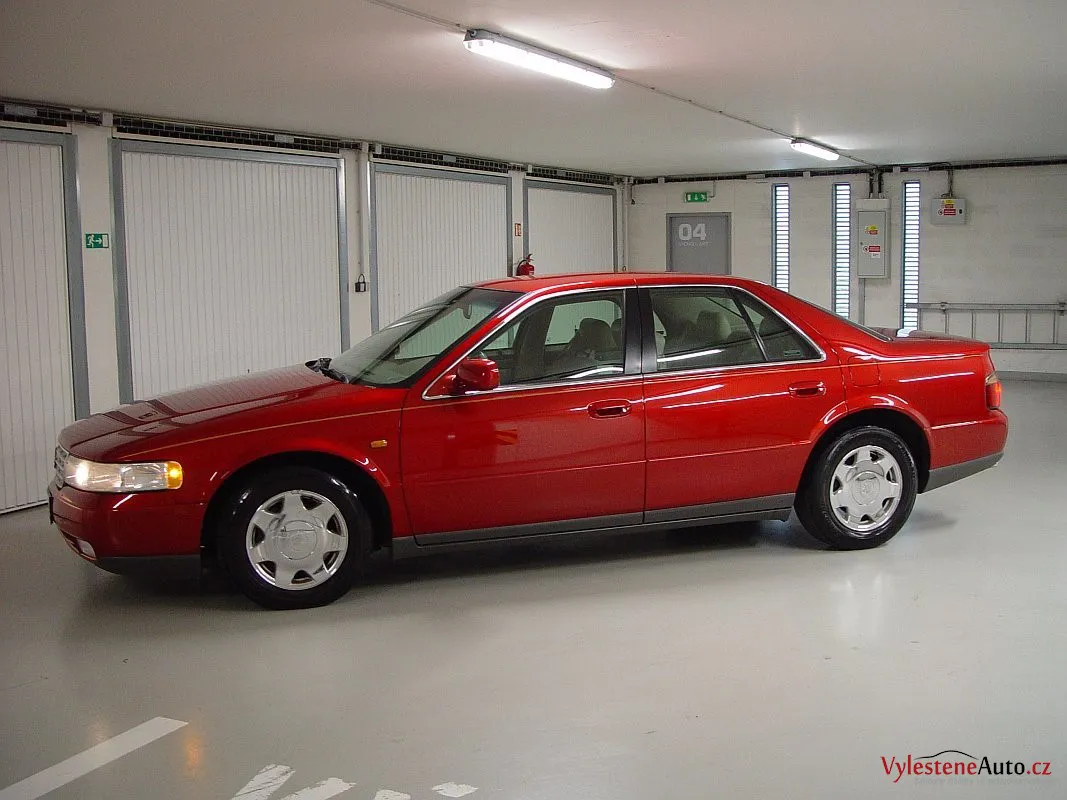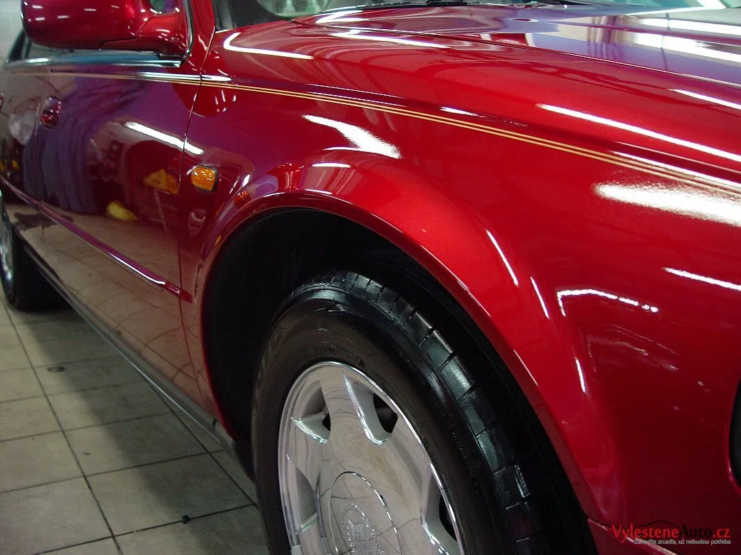 Nádherný Cadillac SLS, nalakovaný červenou metalízou s elegantní dvojitou linkou na bocích, chromovanými koly a čtyřmi výfuky.