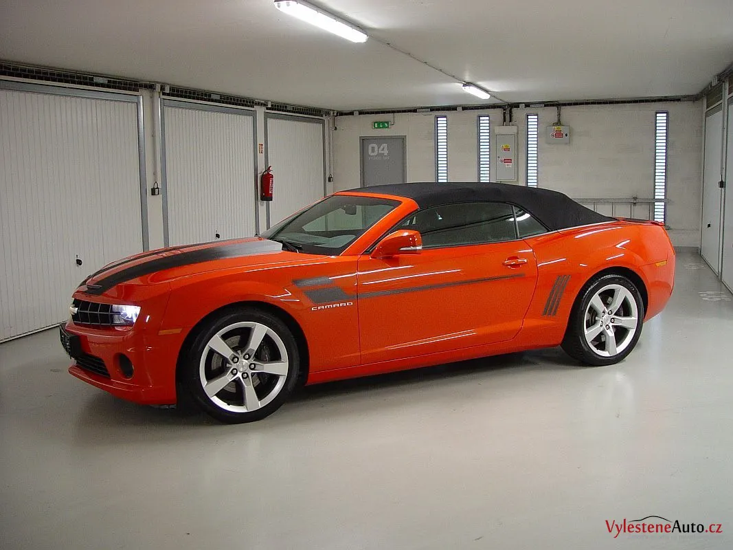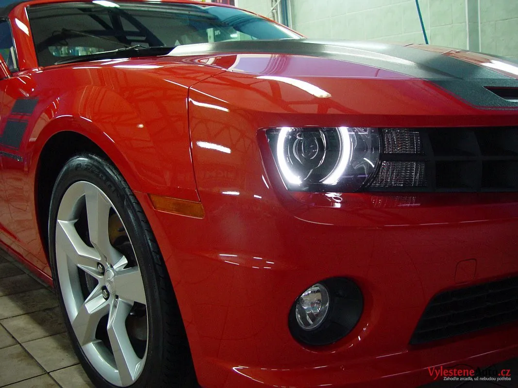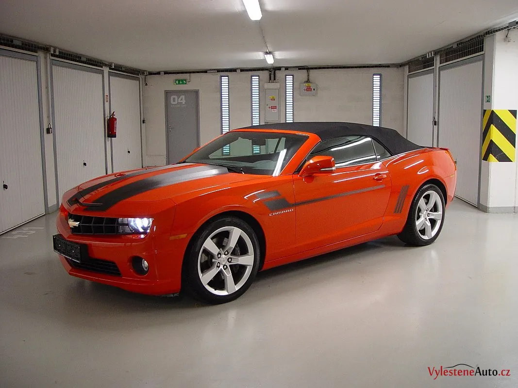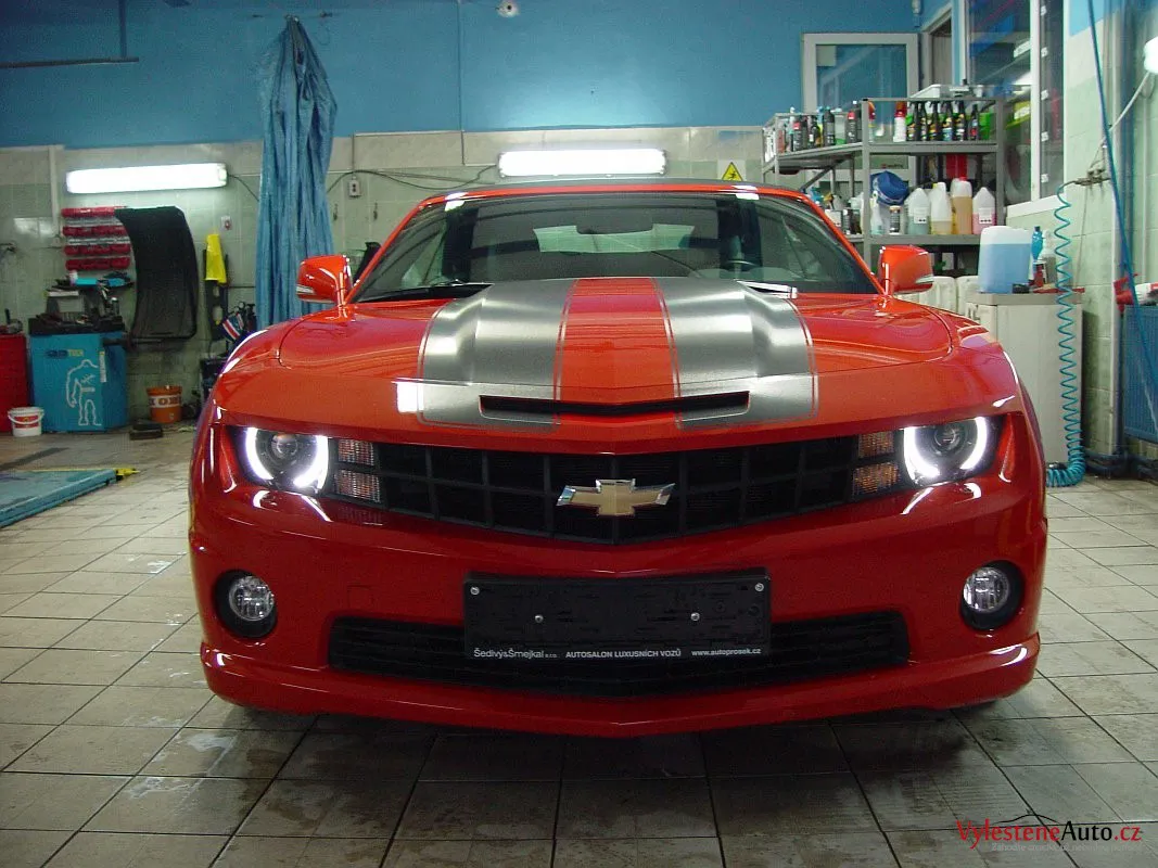 Další nádherný stroj, po kterém jsme mohli prohnat naše leštičky - Chevrolet Camaro s benzinovým motorem 6.2 V8, elektrizujícím oranžovým lakem a laděným výfukem Borla.