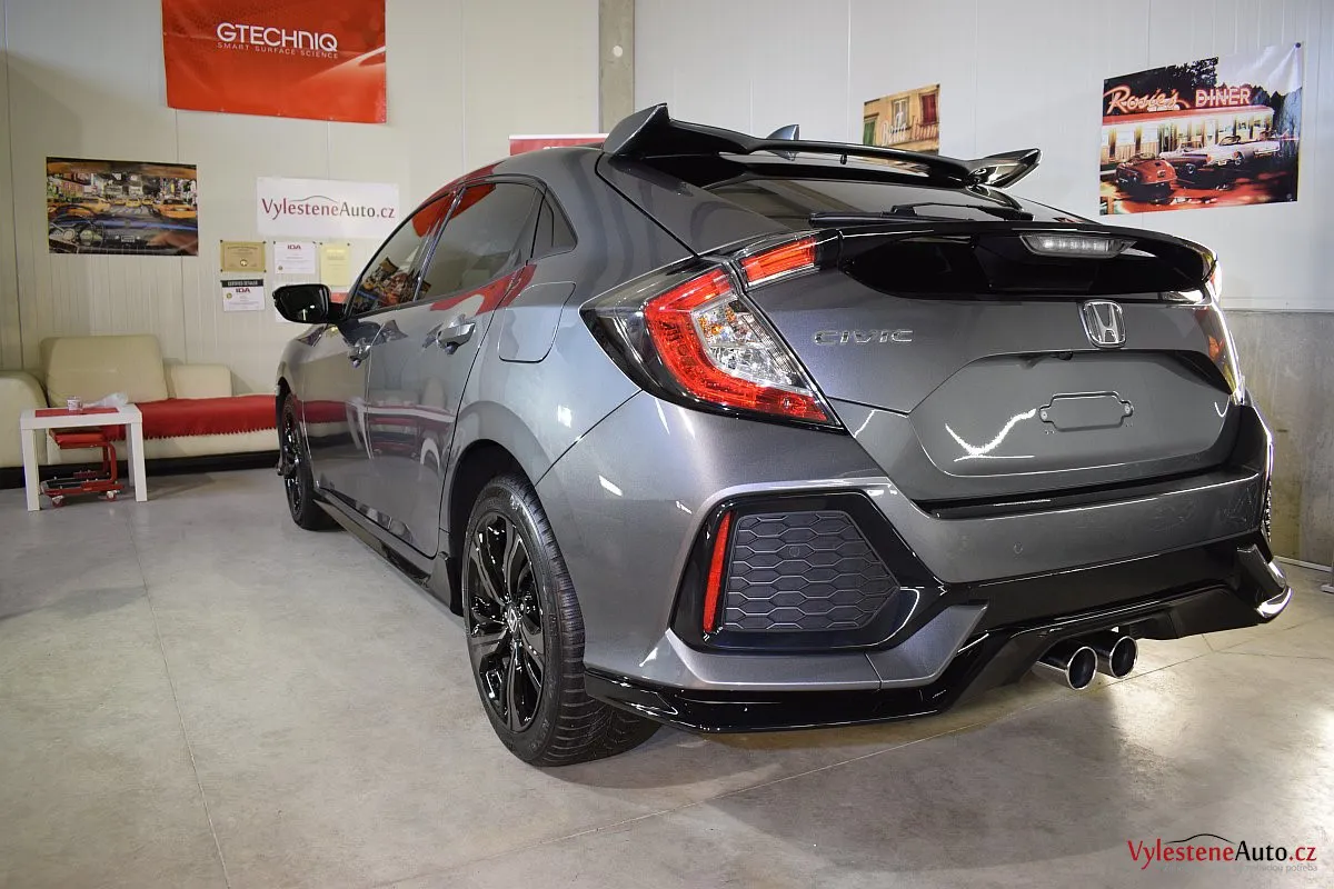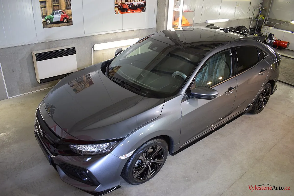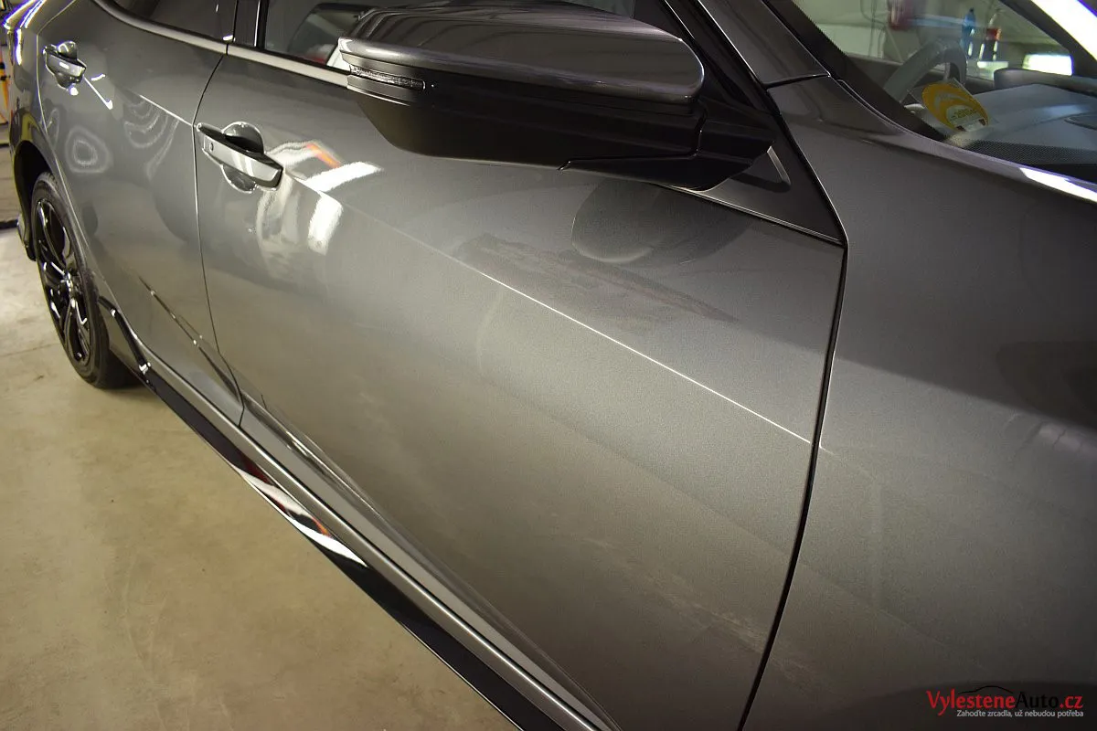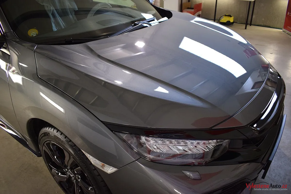 Honda Civic Turbo, poháněná benzinovým turbomotorem a nalakovaná nenápadnou šedou metalízou. K nám si přijela pro renovaci laku a ochranu špičkovým nano voskem od Gtechniq s výdrží až 8 měsíců. Použili jsme rovnou 5 vrstev.