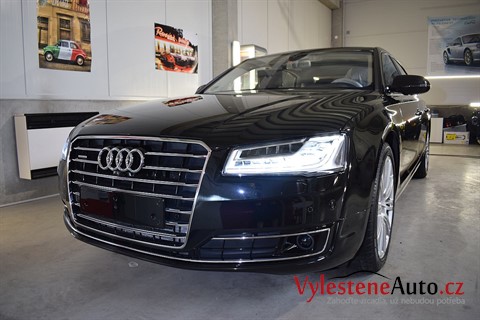 Monumentální Audi A8 v prodloužené verzi L, nalakované krásnou perleťovou metalízou. U nás se zastavilo pro vícekrokovou renovaci a komplexní nanokeramickou ochranu karoserie od Gtechniq, která má výdrž až 5 let.