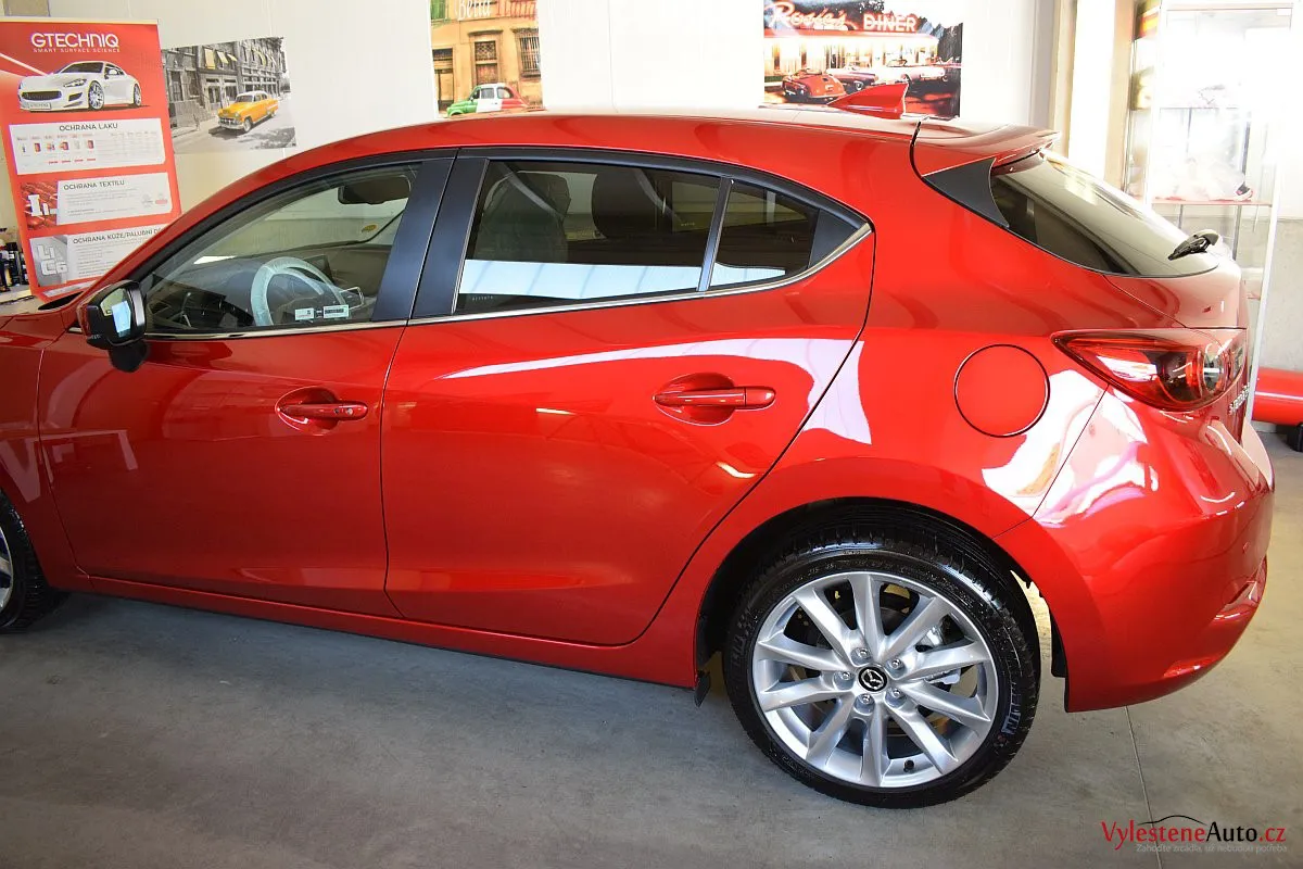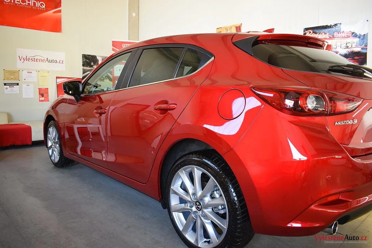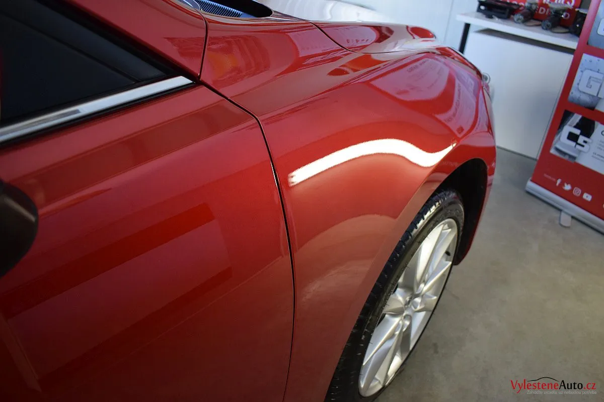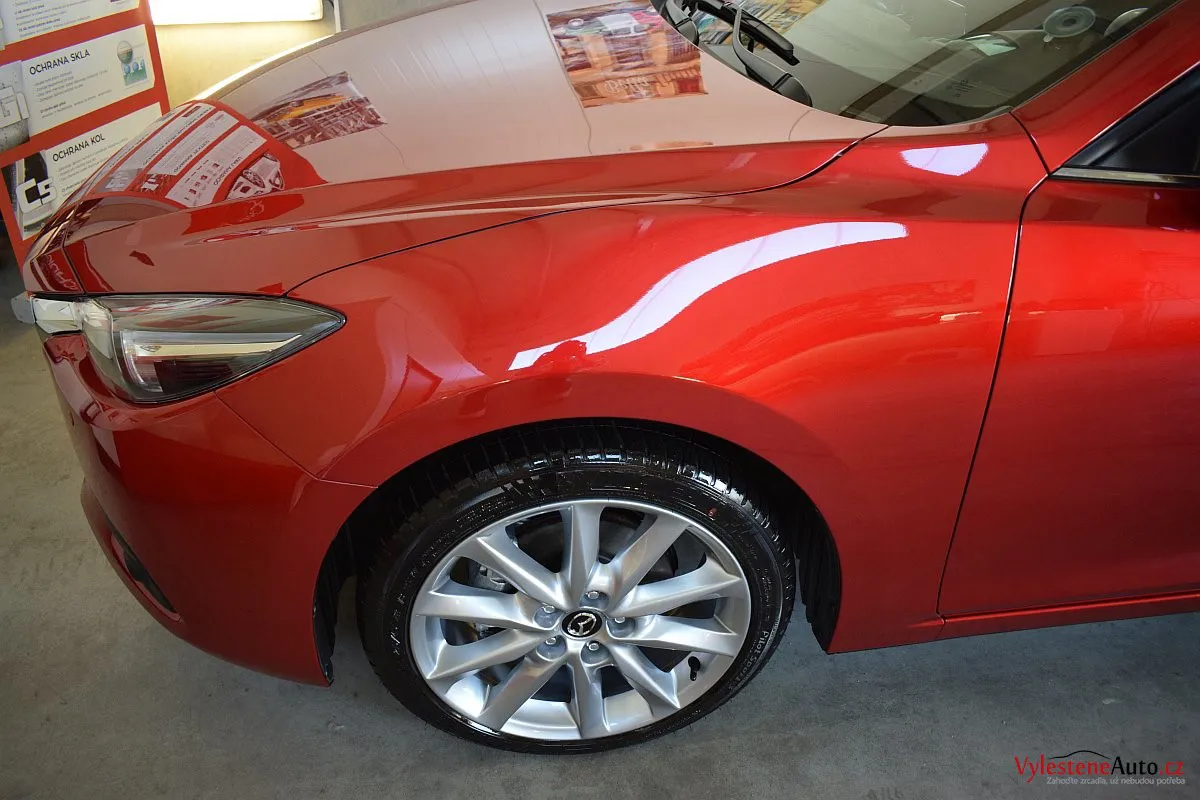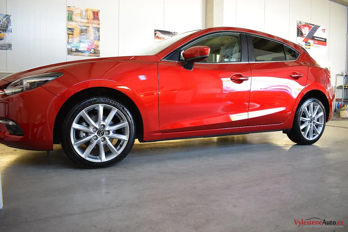 Krásná Mazda 3, poháněná vymazleným motorem Skyactive a nalakovaná krásnou červenou metalízou si k nám přijela pro renovaci a nanokeramickou ochranu laku s výdrží až 5 let od Gtechniq. Nanokeramika si našla cestu také na litá kola, kryt motoru, kryty světlometů, všechna skla, zrcátka i koncovky výfuku.