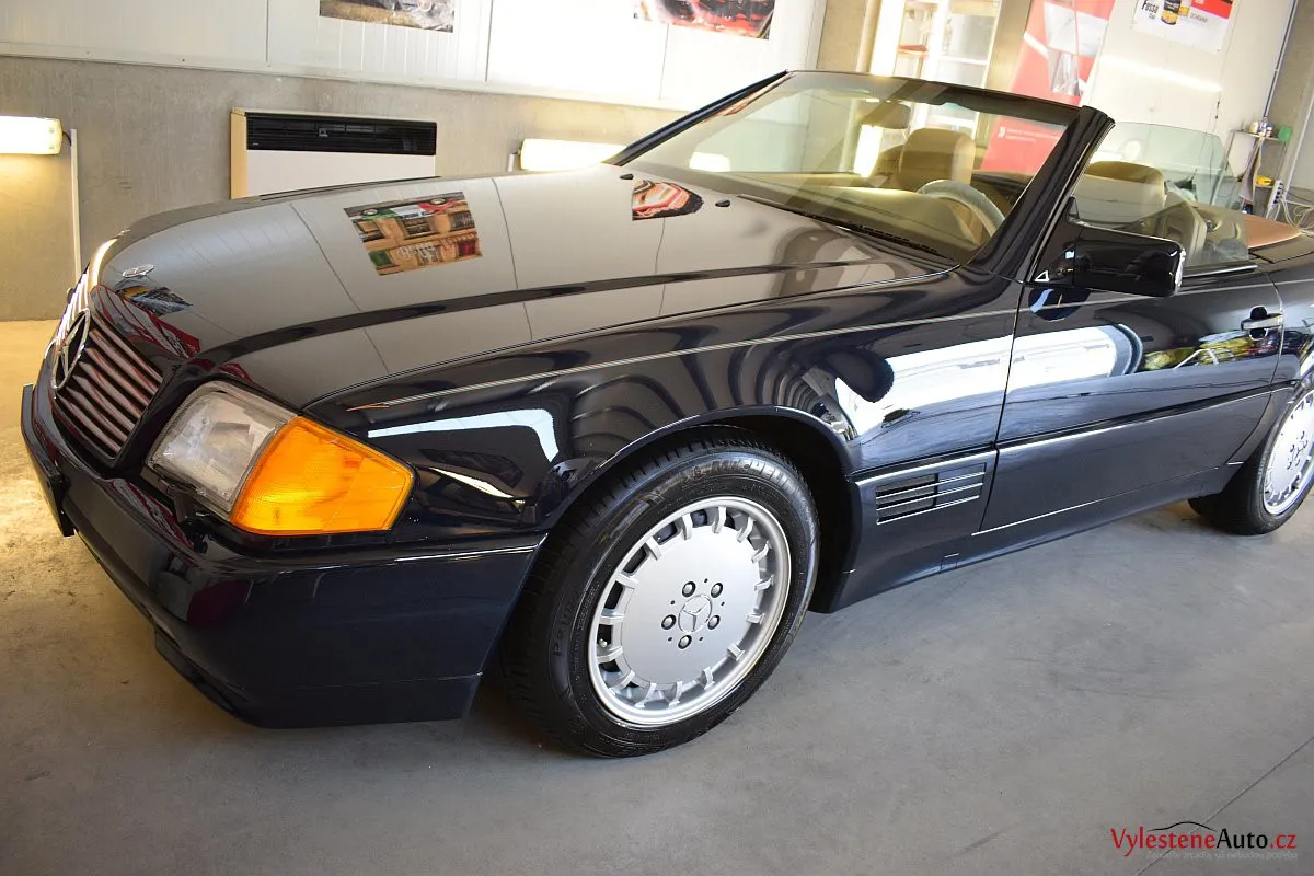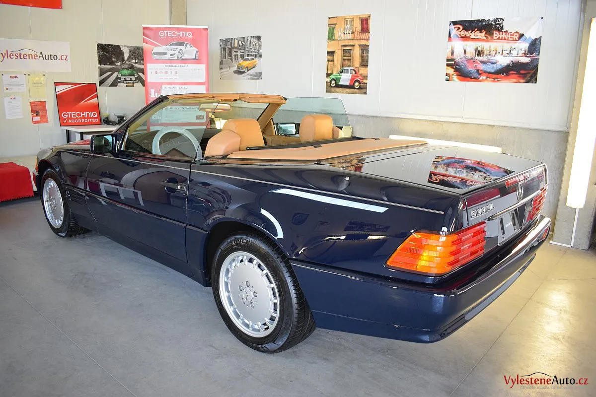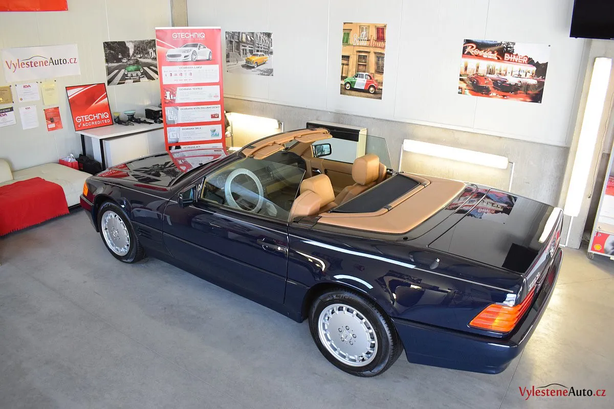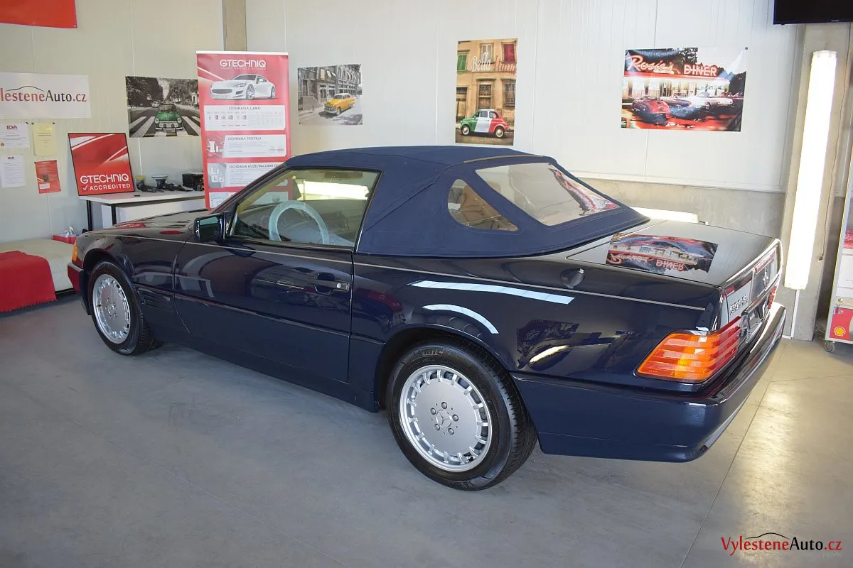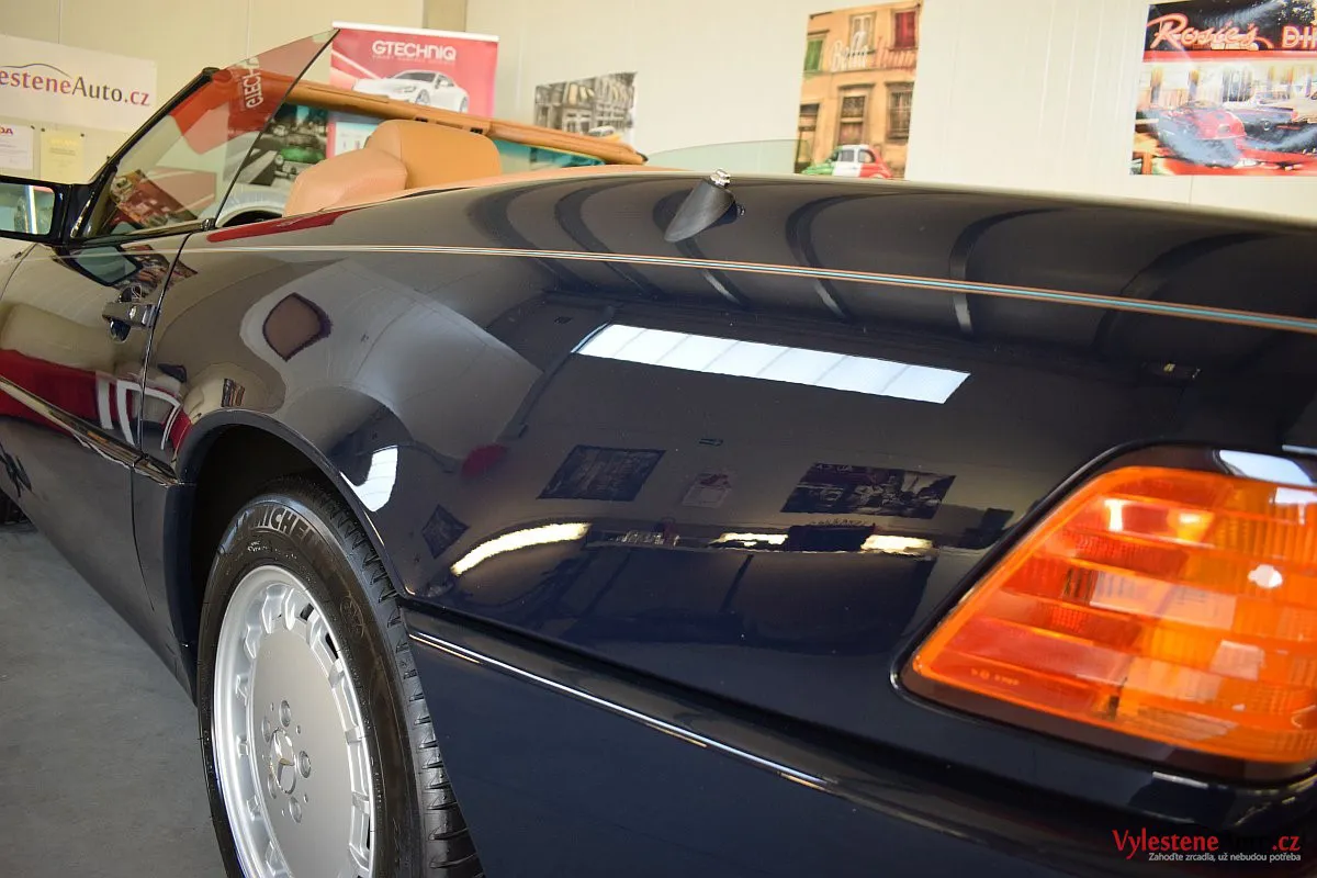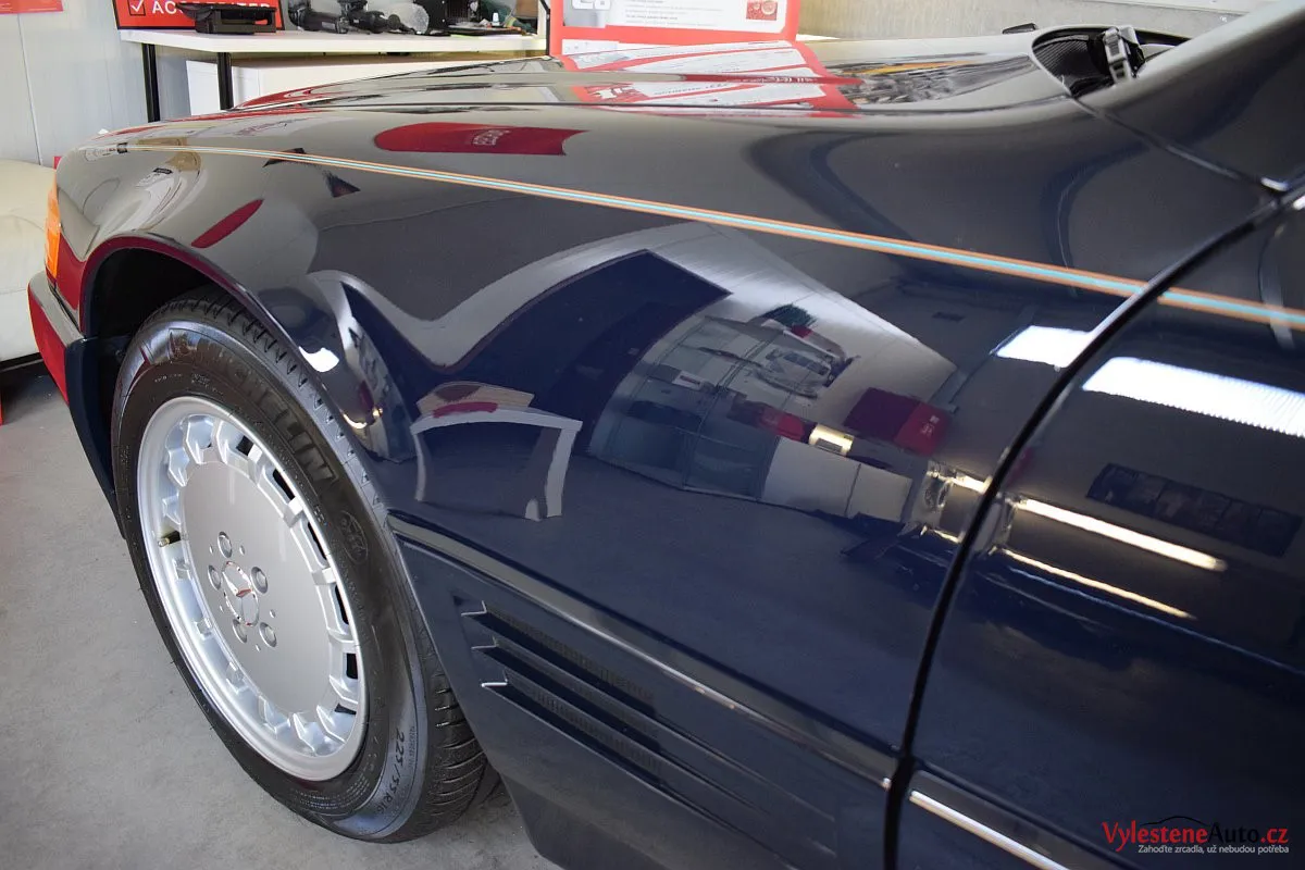 V dnešní době už klasik - nádherný Mercedes 500 SL, nalakovaný nemetalickou modrou barvou, vyšperkovaný světlým koženým interiérem a v tehdejší době ještě úžasnou plátěnou střechou. Pod kapotou se skrývá plnotučný osmiválec o obsahu 5 litrů - tedy dost na 5 moderních "eko" pohonných jednotek. K nám si přijel pro vícekrokovou renovaci a ochranu laku.