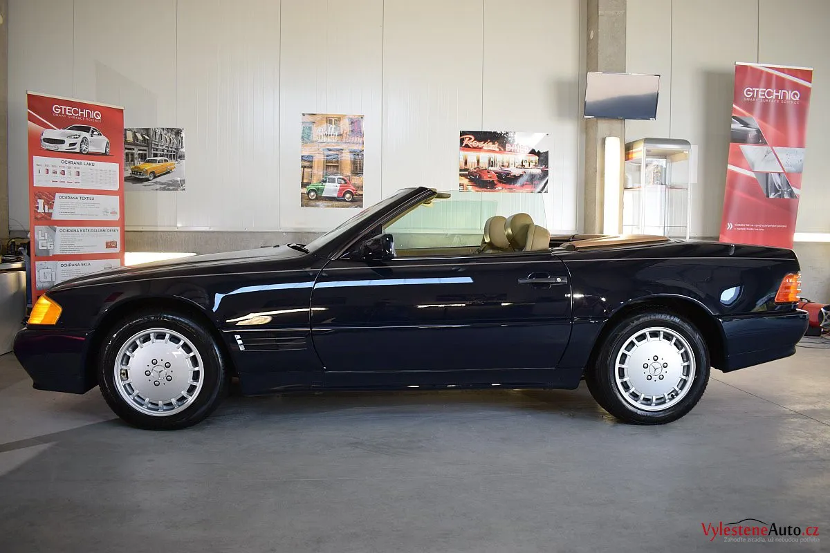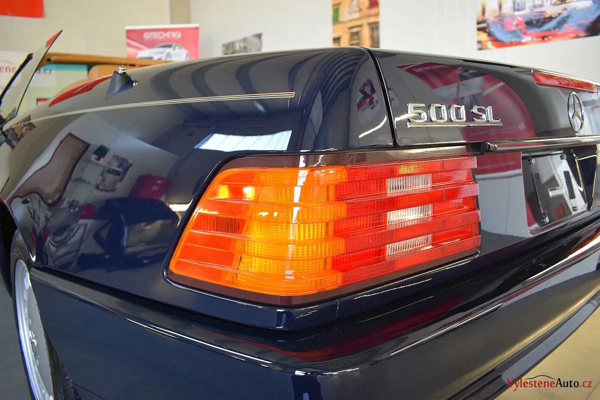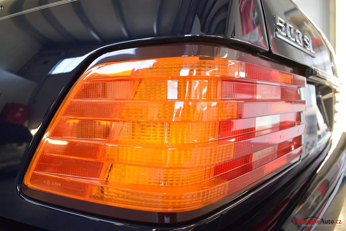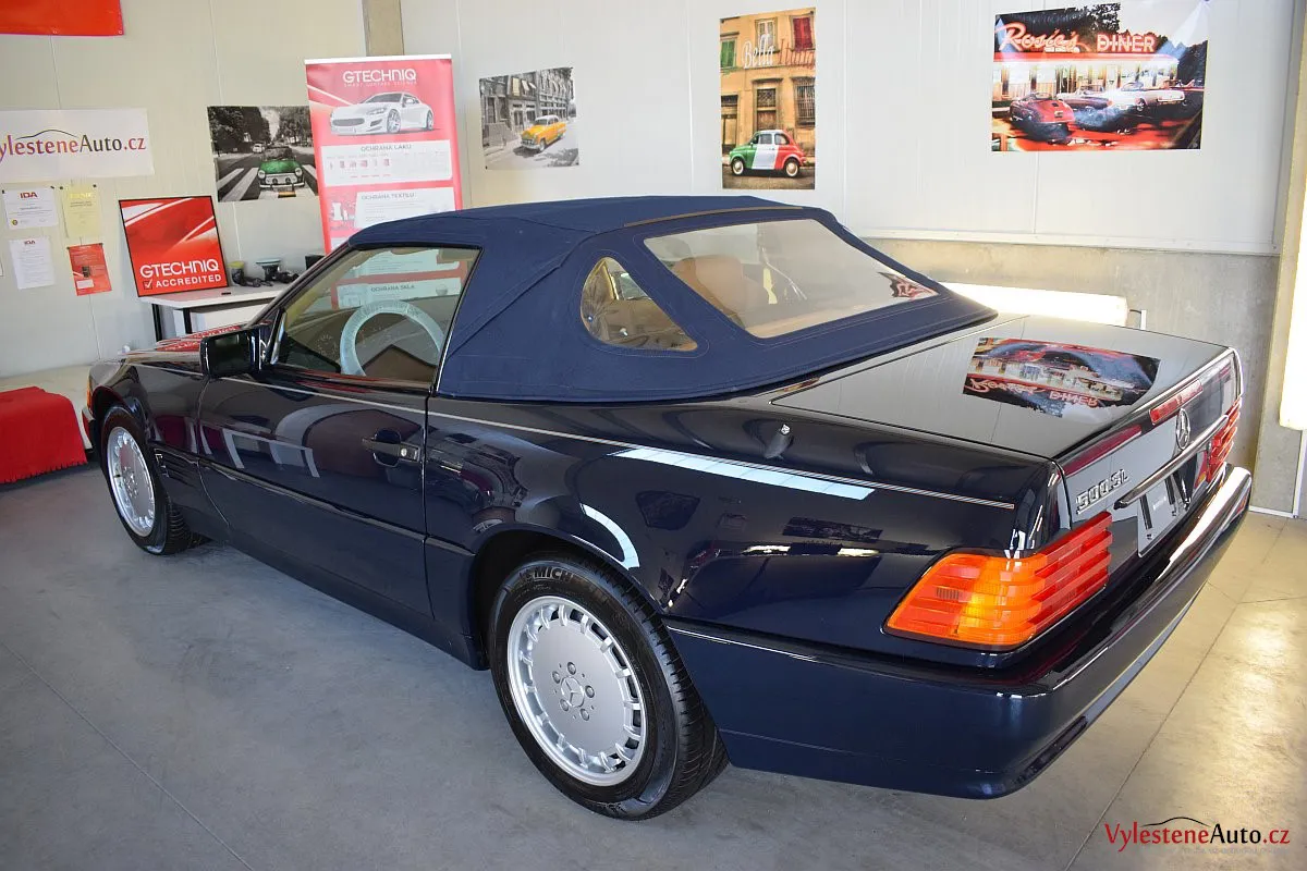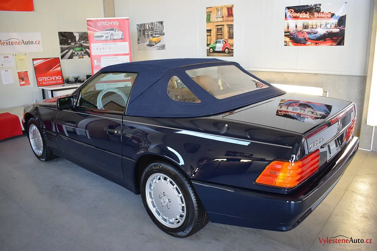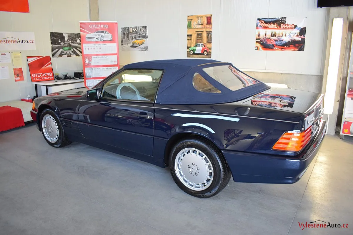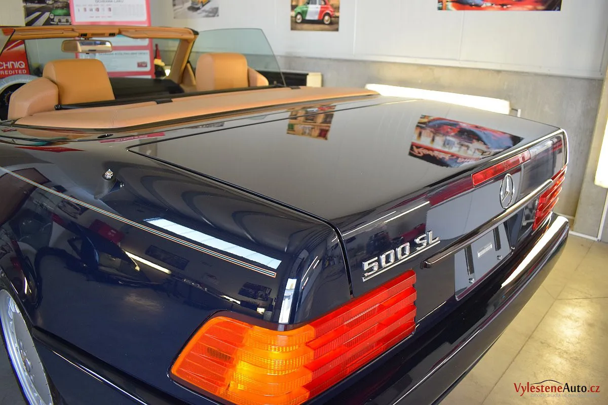 V dnešní době už klasik - nádherný Mercedes 500 SL, nalakovaný nemetalickou modrou barvou, vyšperkovaný světlým koženým interiérem a v tehdejší době ještě úžasnou plátěnou střechou. Pod kapotou se skrývá plnotučný osmiválec o obsahu 5 litrů - tedy dost na 5 moderních "eko" pohonných jednotek. K nám si přijel pro vícekrokovou renovaci a ochranu laku.
