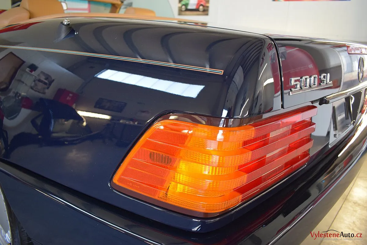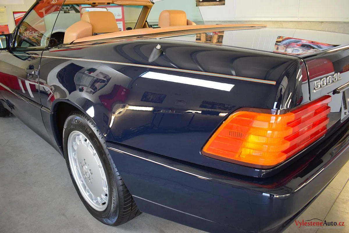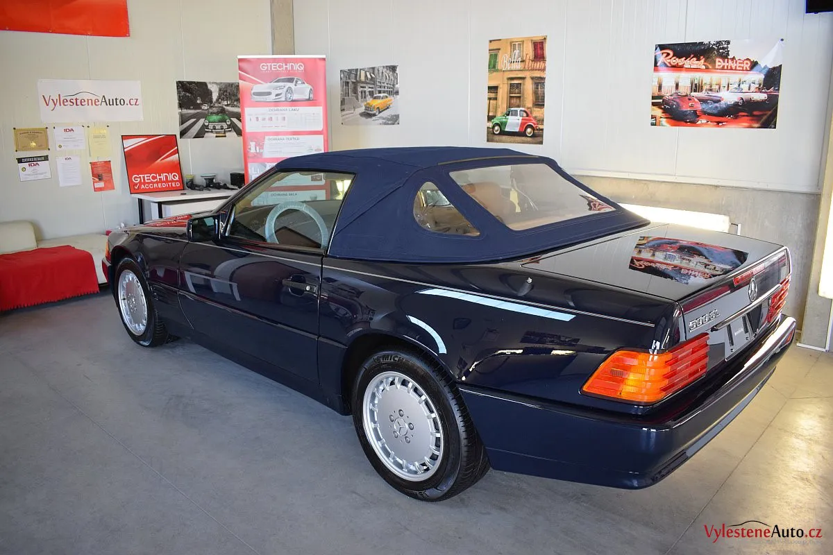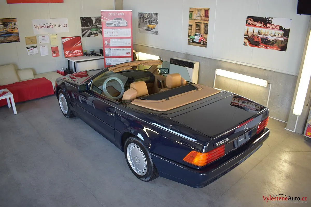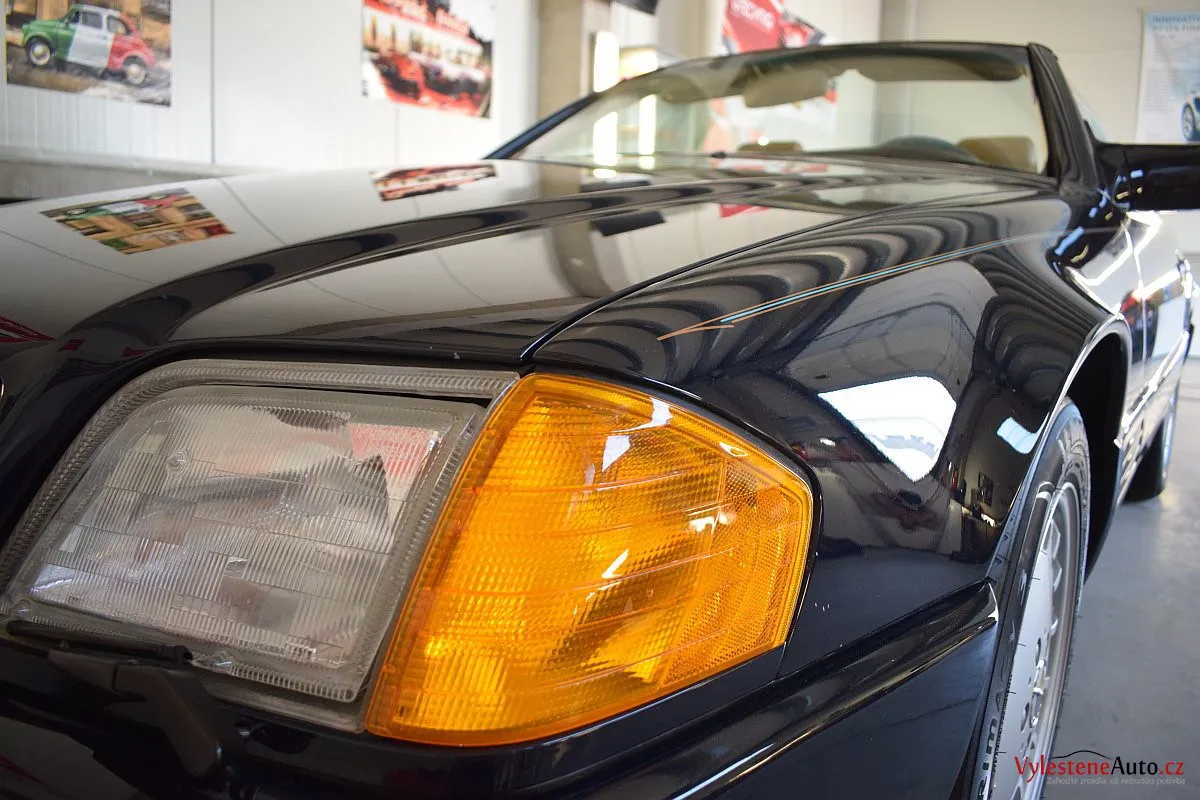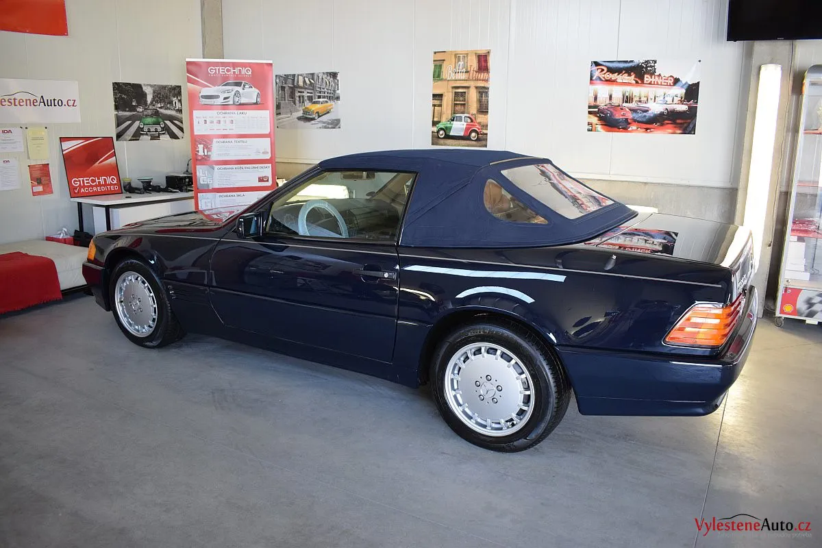 V dnešní době už klasik - nádherný Mercedes 500 SL, nalakovaný nemetalickou modrou barvou, vyšperkovaný světlým koženým interiérem a v tehdejší době ještě úžasnou plátěnou střechou. Pod kapotou se skrývá plnotučný osmiválec o obsahu 5 litrů - tedy dost na 5 moderních "eko" pohonných jednotek. K nám si přijel pro vícekrokovou renovaci a ochranu laku.
