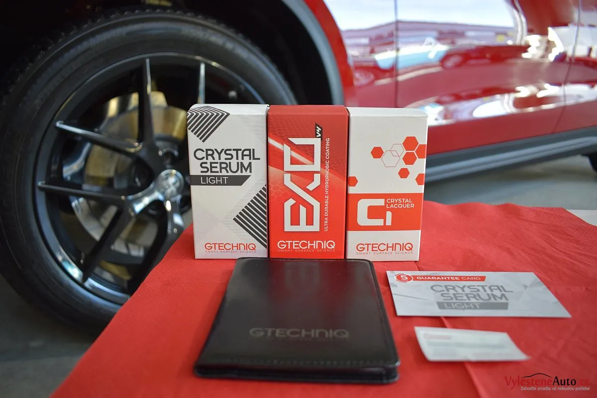 Použili jsme Gtechniq Crystal Serum Light s výdrží až 5 let a zárukou. Kromě laku jsme ošetřili litá kola, skla a plastové díly.