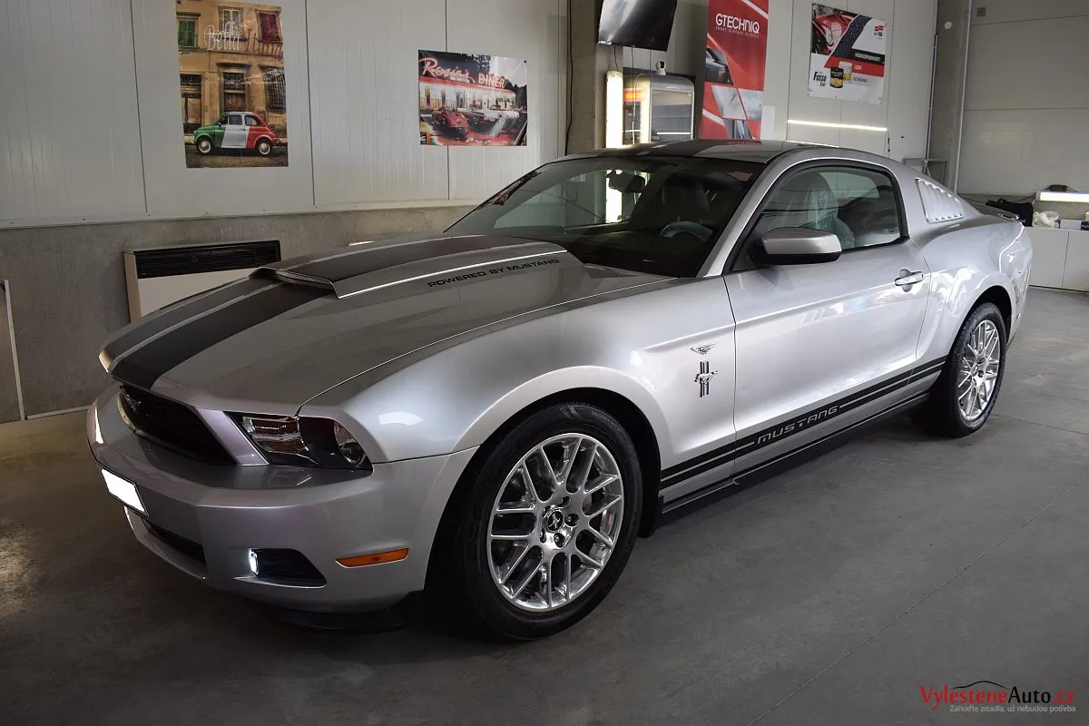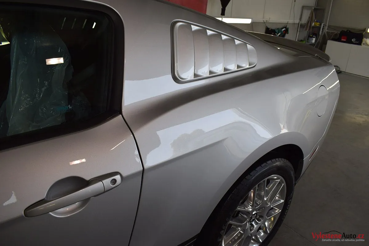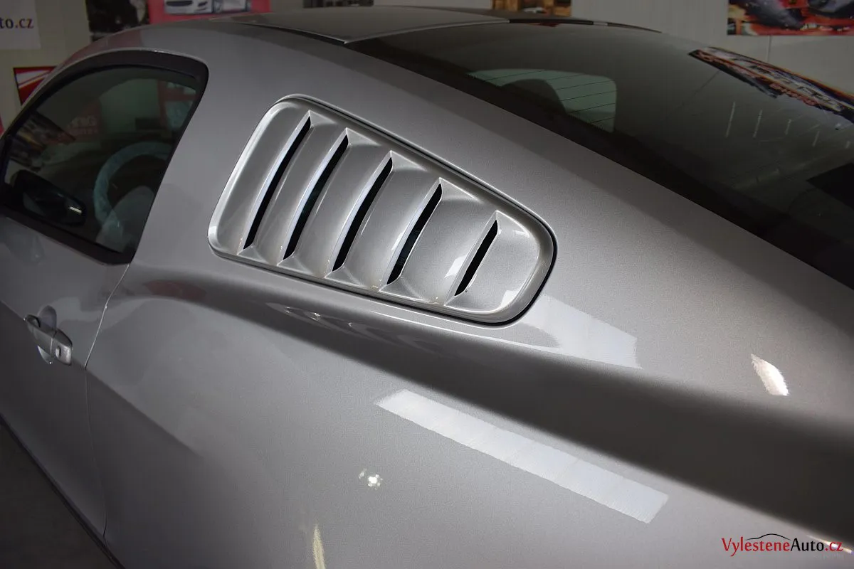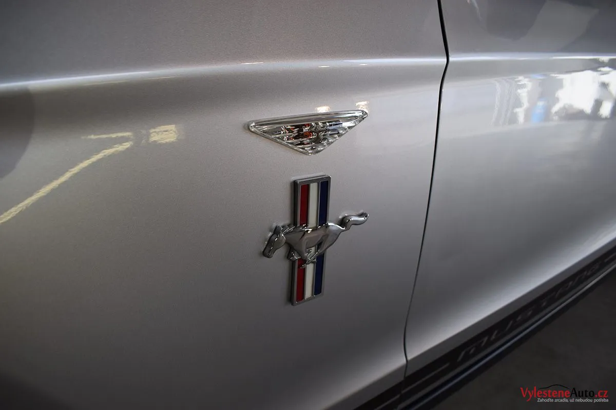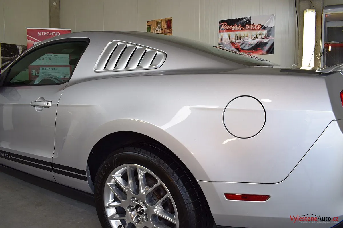 Stříbřitá ikona - Ford Mustang s klasickými tvary, mřížkami na zadních sklech a pořádnou boulí na kapotě.
