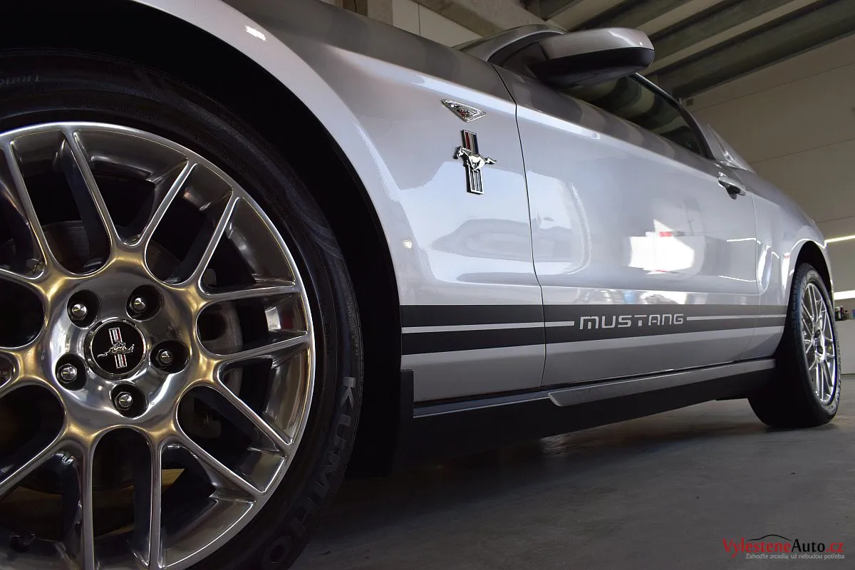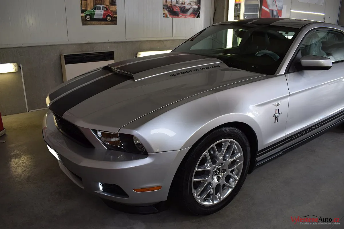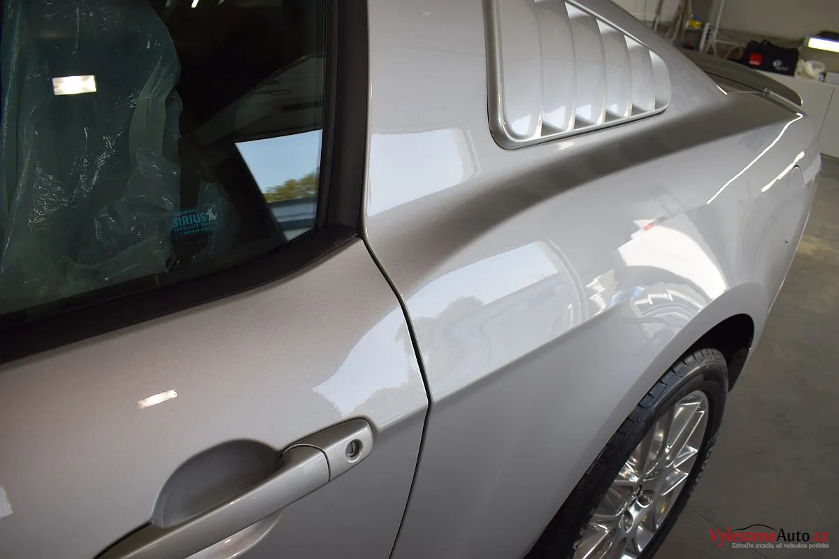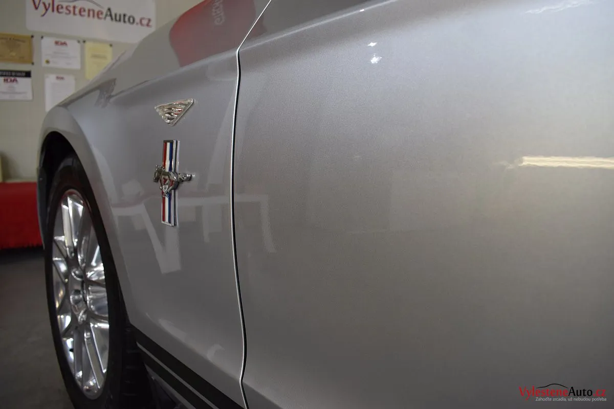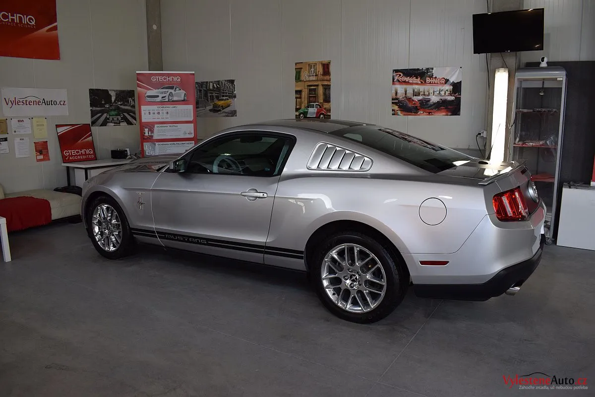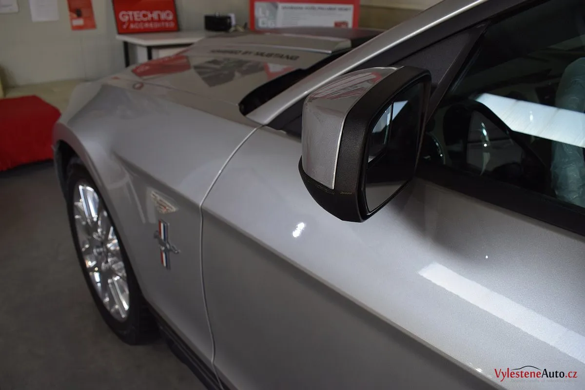 Stříbřitá ikona - Ford Mustang s klasickými tvary, mřížkami na zadních sklech a pořádnou boulí na kapotě.