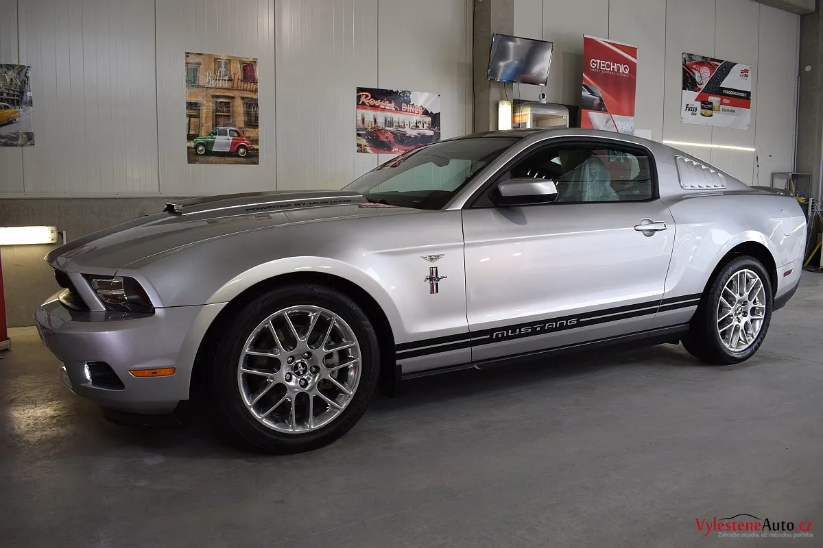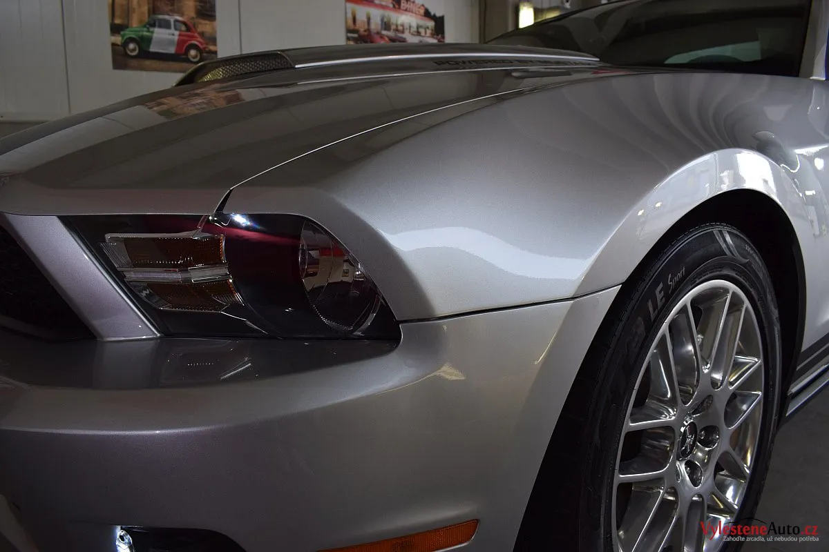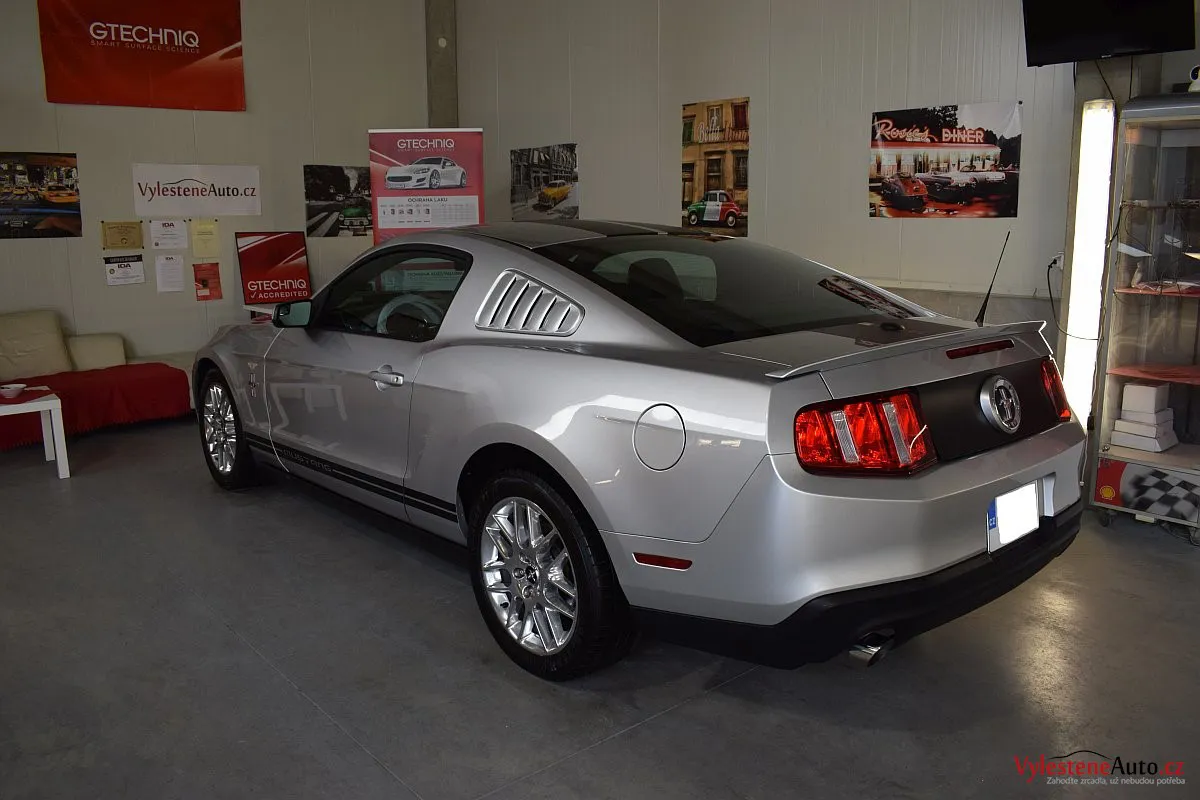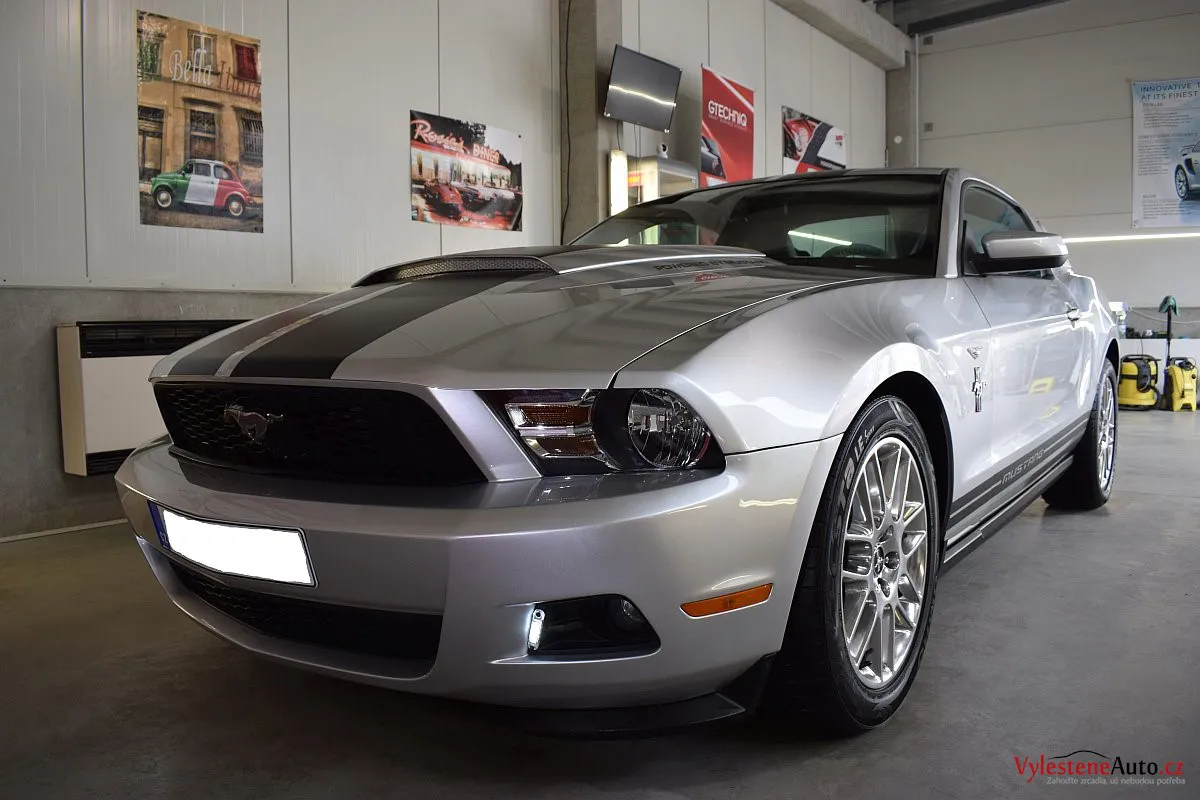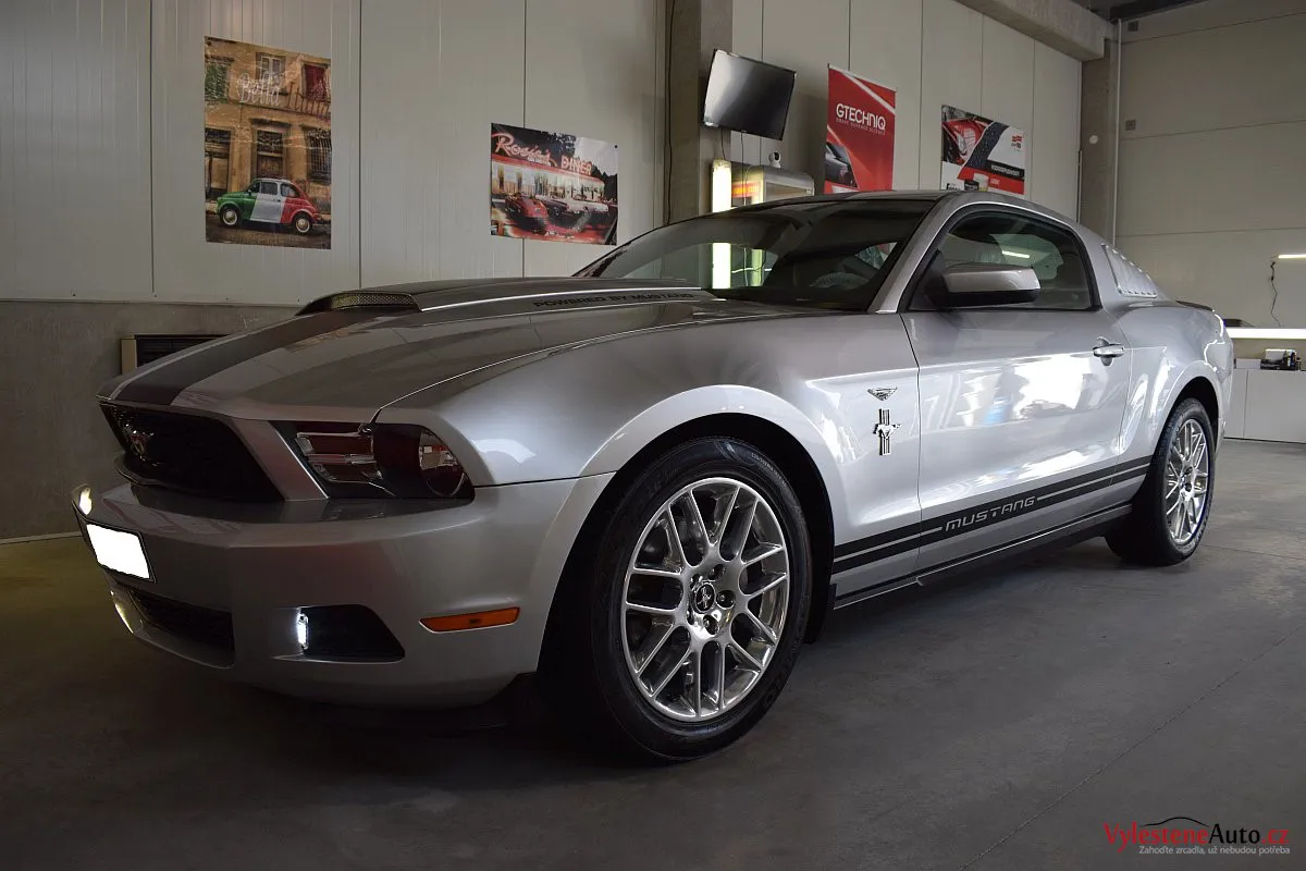 Stříbřitá ikona - Ford Mustang s klasickými tvary, mřížkami na zadních sklech a pořádnou boulí na kapotě.