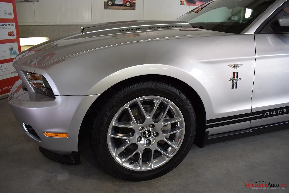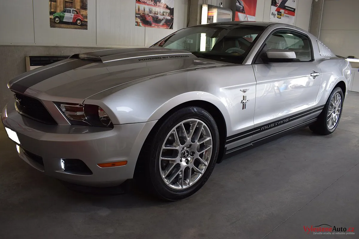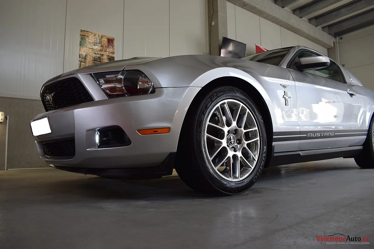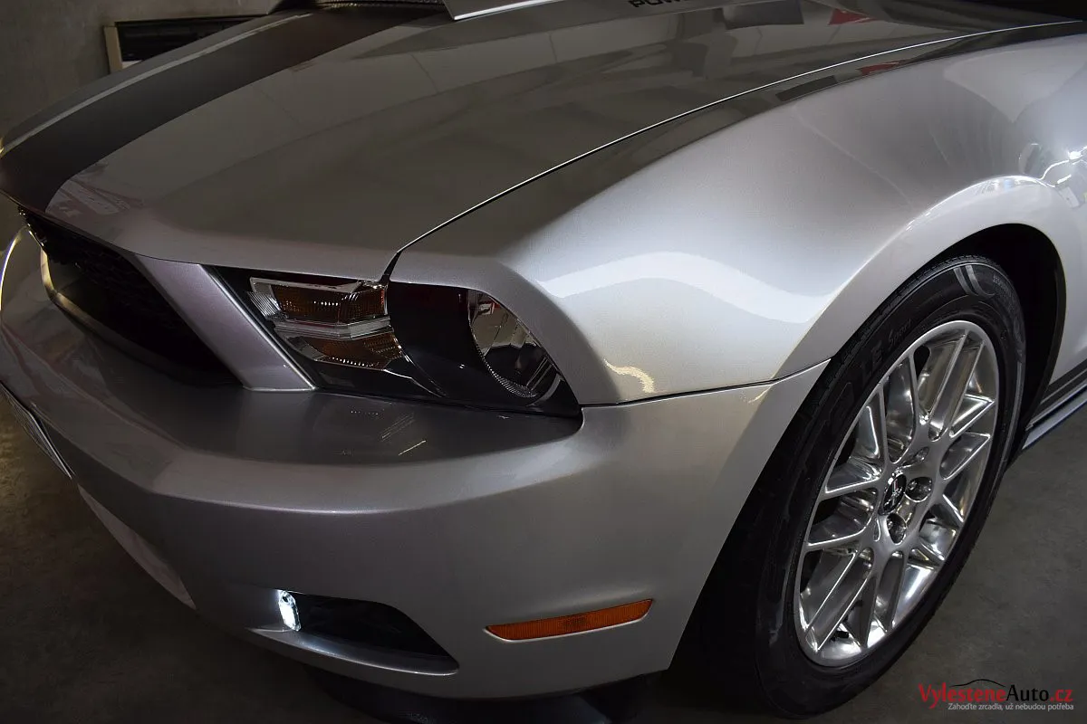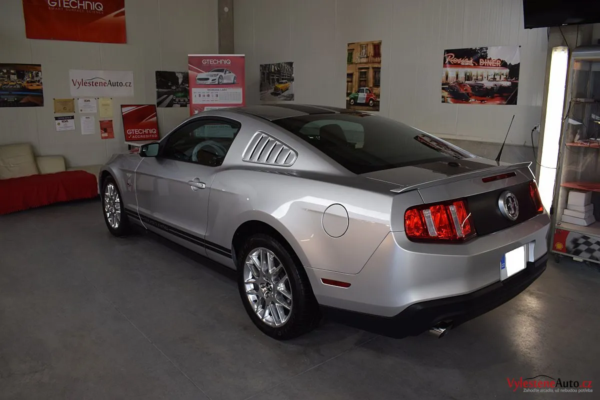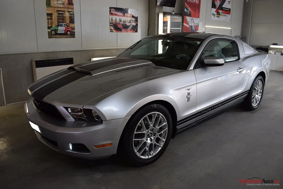 Stříbřitá ikona - Ford Mustang s klasickými tvary, mřížkami na zadních sklech a pořádnou boulí na kapotě.