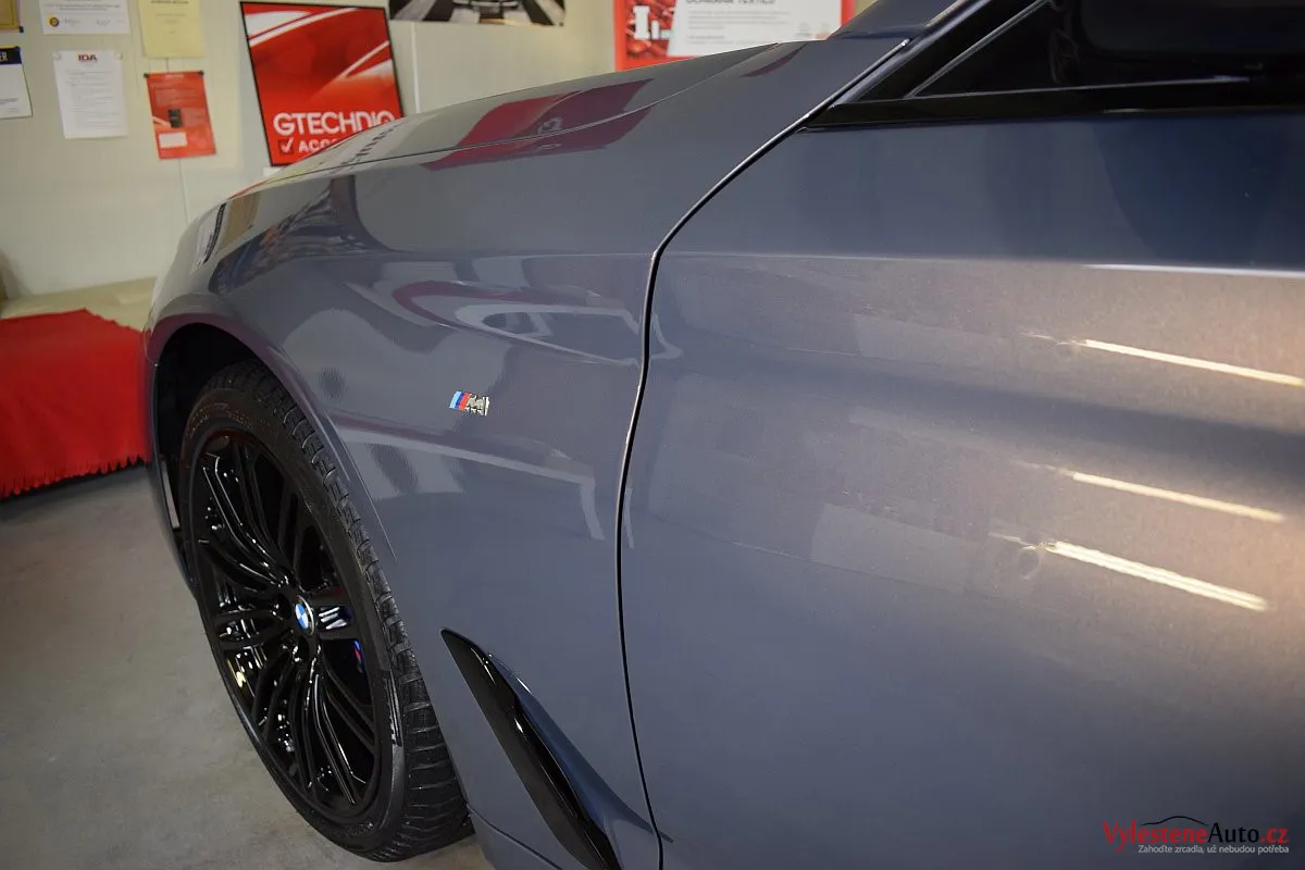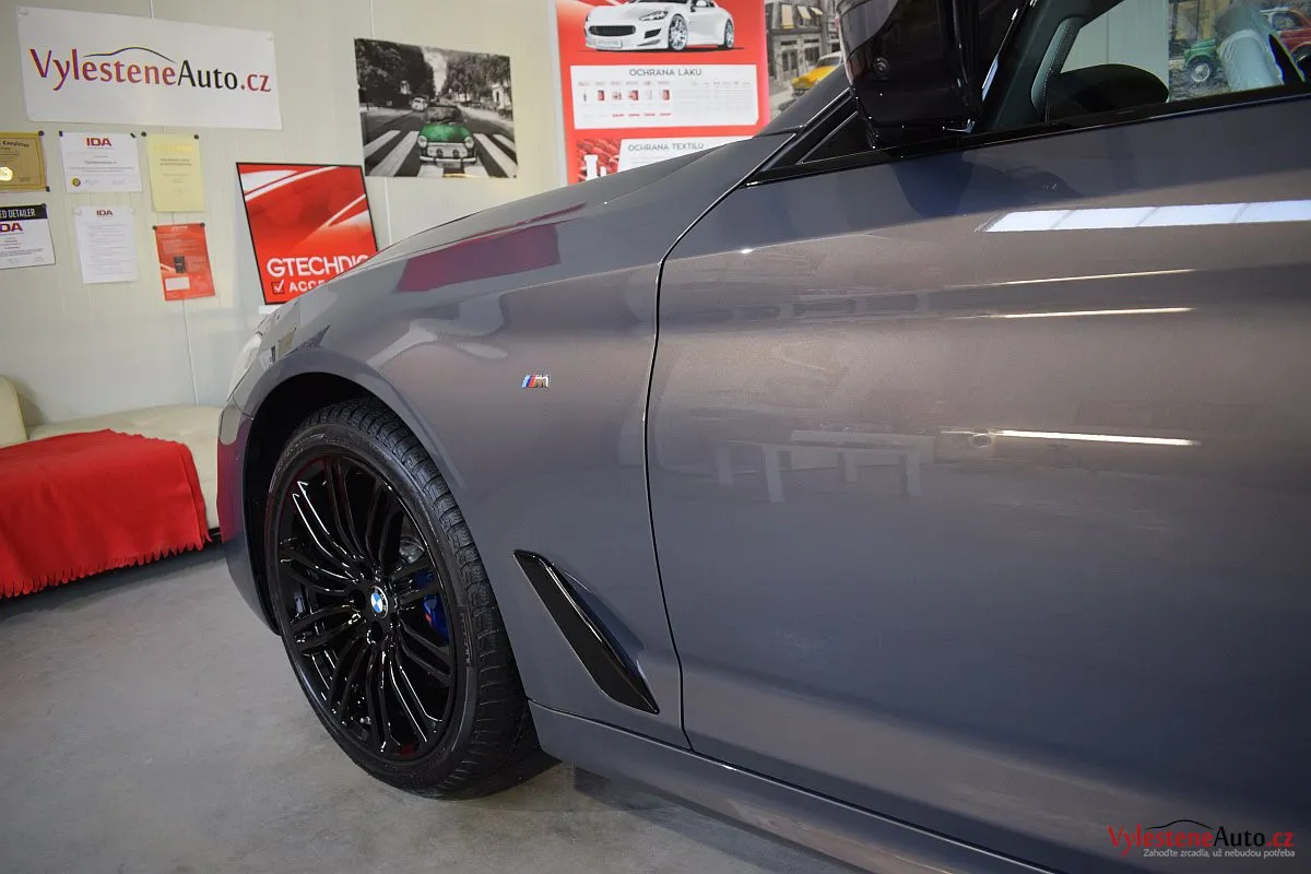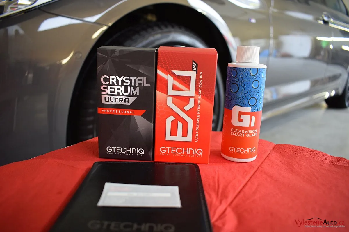 Kromě karoserie samotné jsme nanokeramikou Gtechniq ošetřili také všechna skla a zrcátka, litá kola, brzdové třmeny, motor, spodní stranu kapoty, zádveří, kryty světlometů, klíček a SPZ.