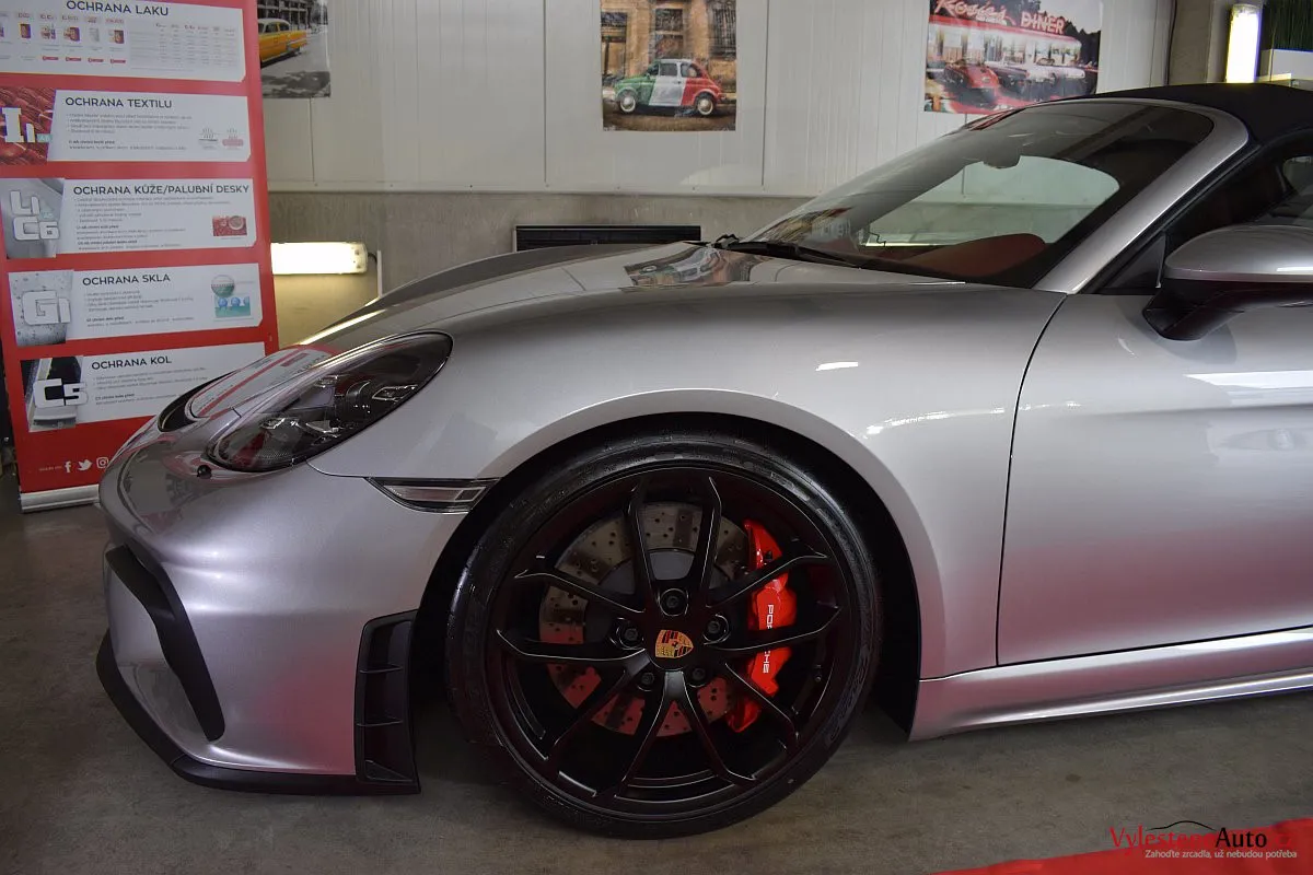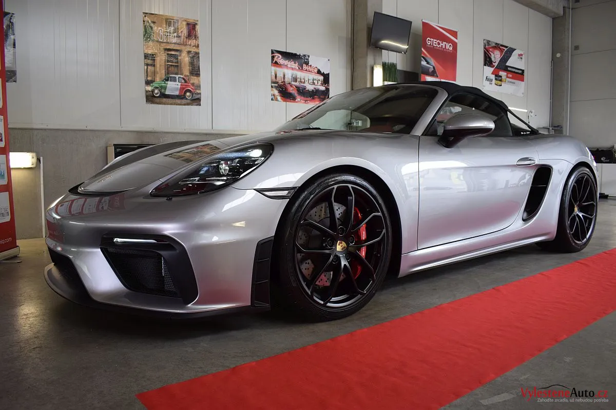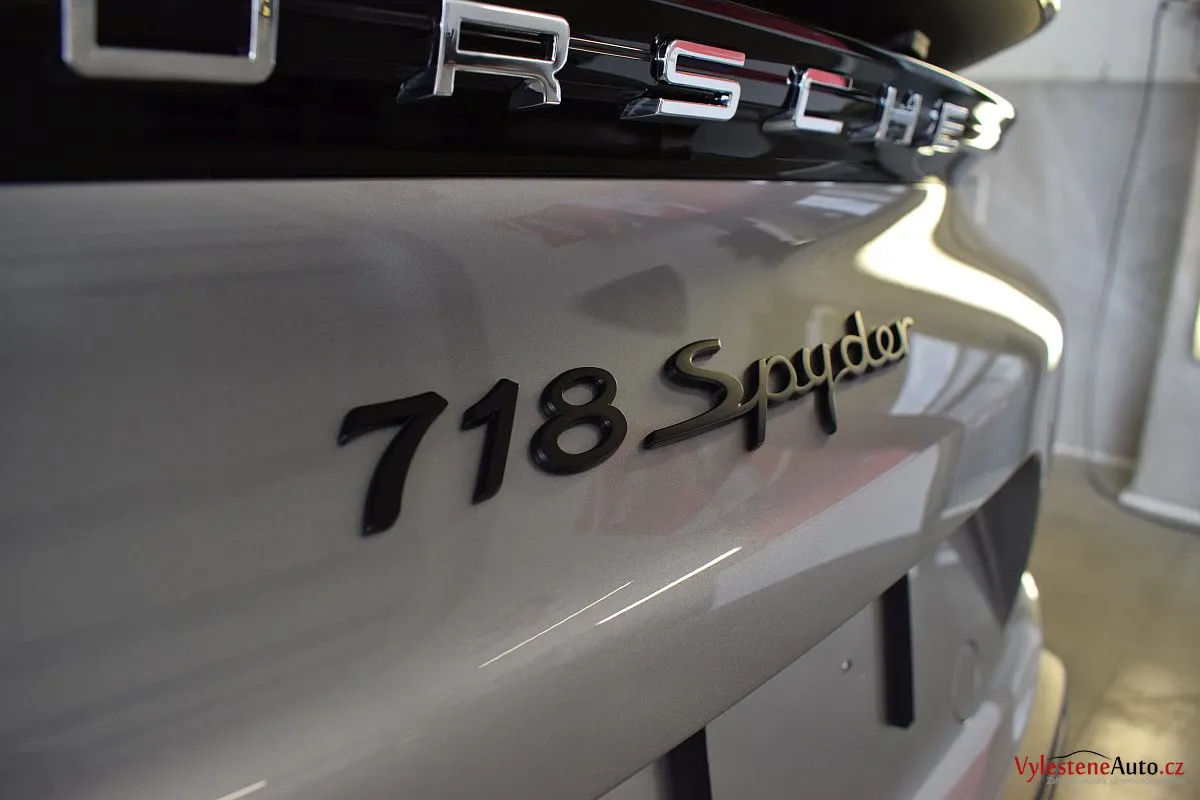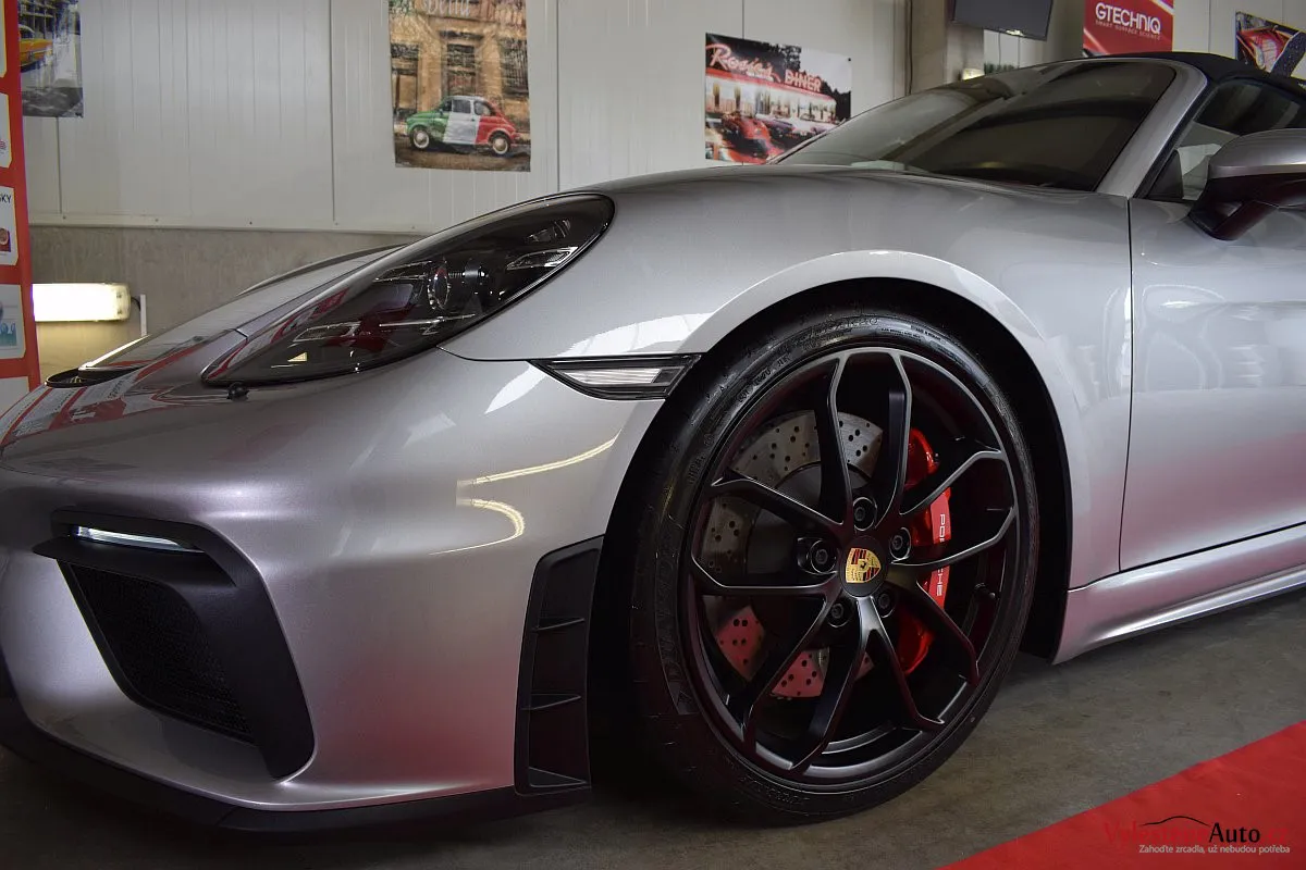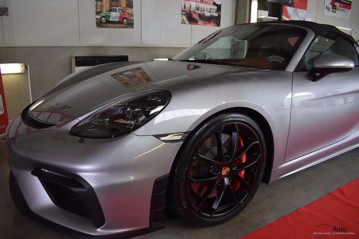 Nádherný návrat Porsche ke kořenům - stříbřitý 718 Spyder - lehoučký, dvoumístný sporťák, poháněný atmosférickým boxerem 4.0 s manuální převodovkou. Vypiplaný podvozek Bilstein, zvýšený přítlak a úžasný zvuk.