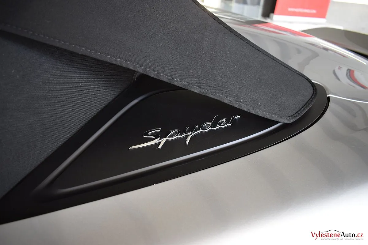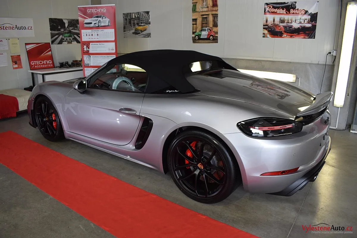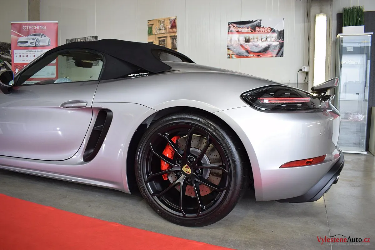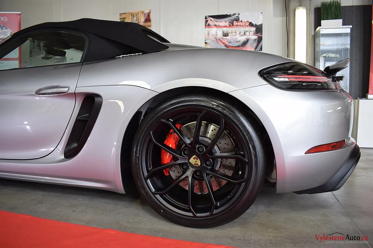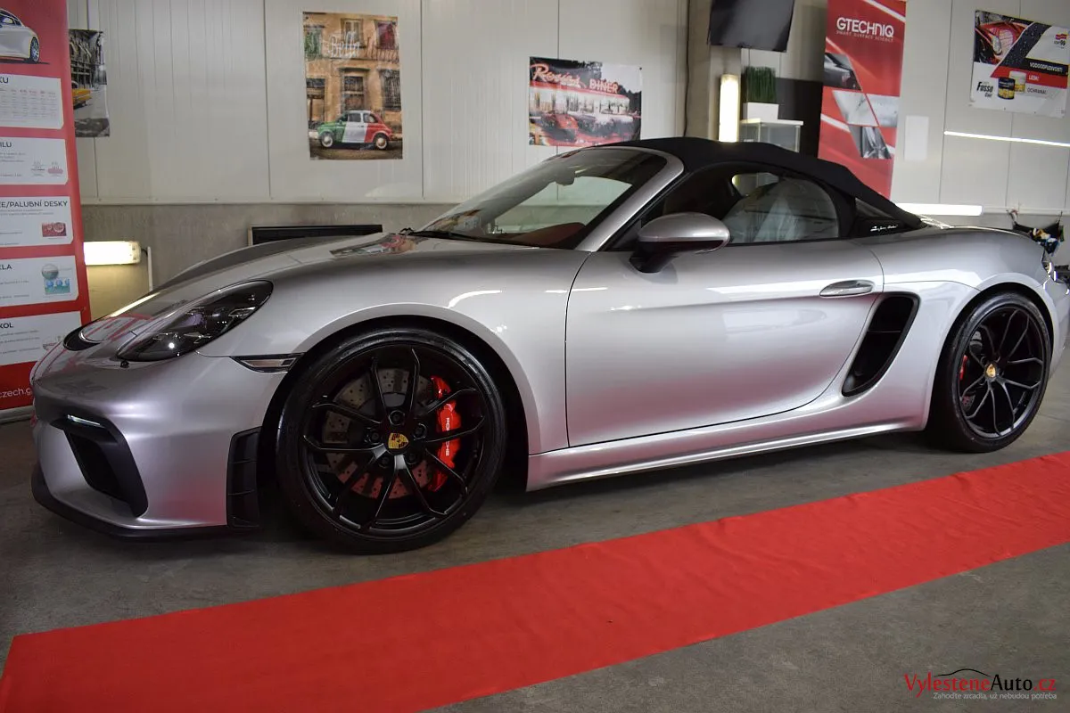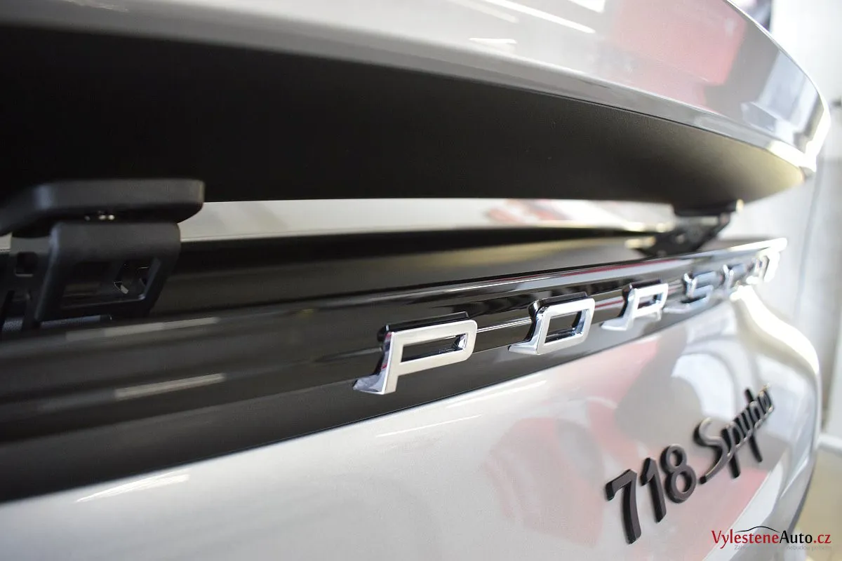 Nádherný návrat Porsche ke kořenům - stříbřitý 718 Spyder - lehoučký, dvoumístný sporťák, poháněný atmosférickým boxerem 4.0 s manuální převodovkou. Vypiplaný podvozek Bilstein, zvýšený přítlak a úžasný zvuk.