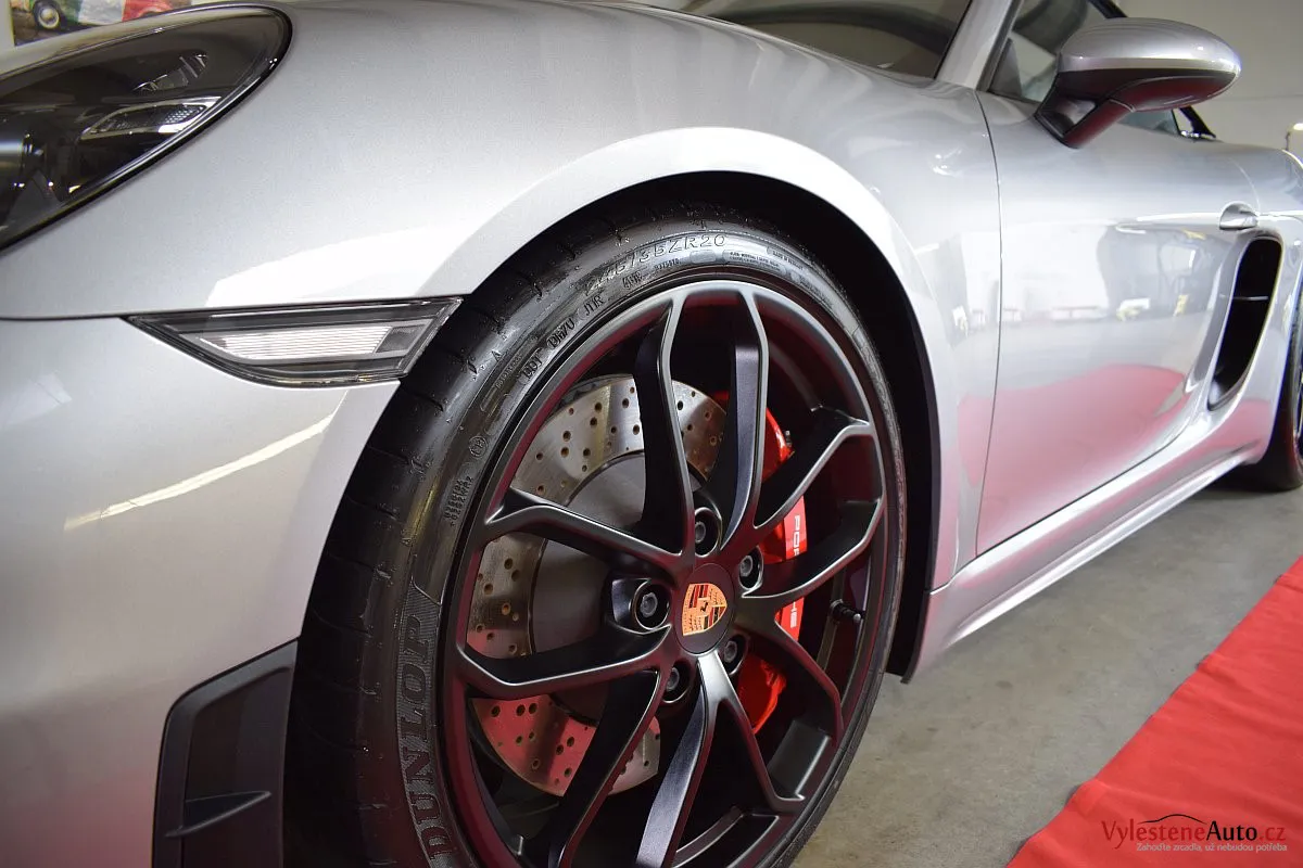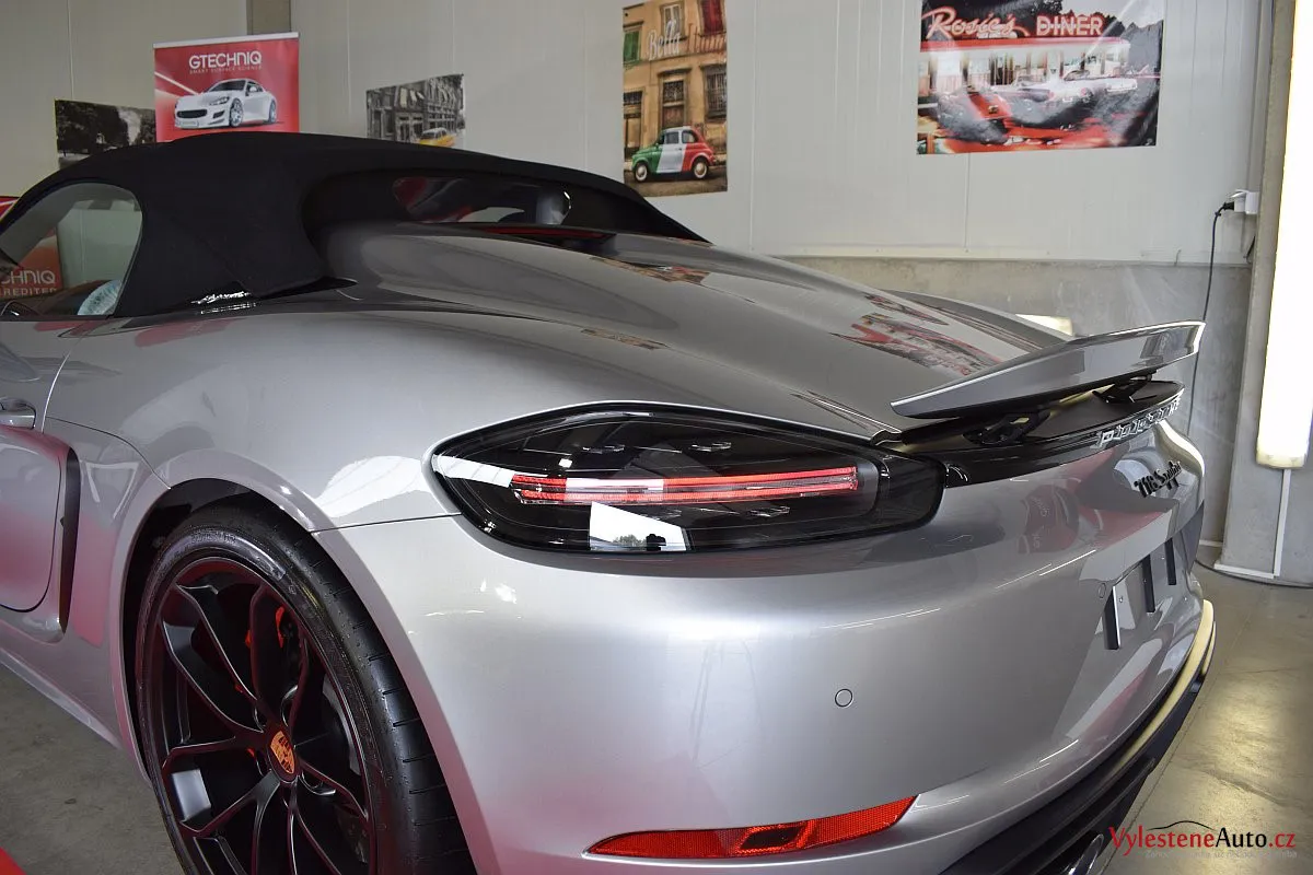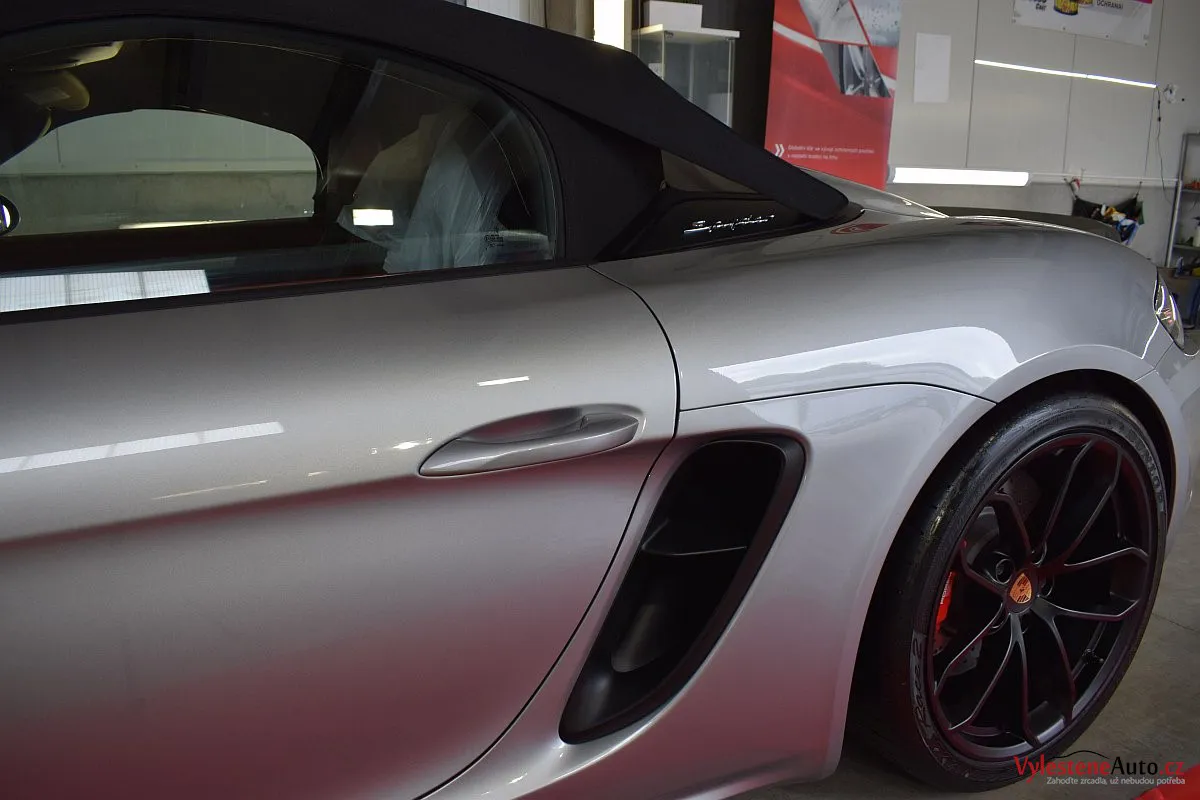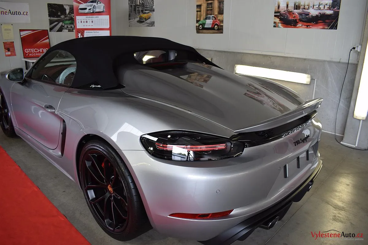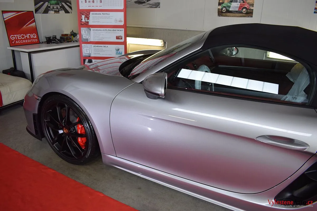 Nádherný návrat Porsche ke kořenům - stříbřitý 718 Spyder - lehoučký, dvoumístný sporťák, poháněný atmosférickým boxerem 4.0 s manuální převodovkou. Vypiplaný podvozek Bilstein, zvýšený přítlak a úžasný zvuk.