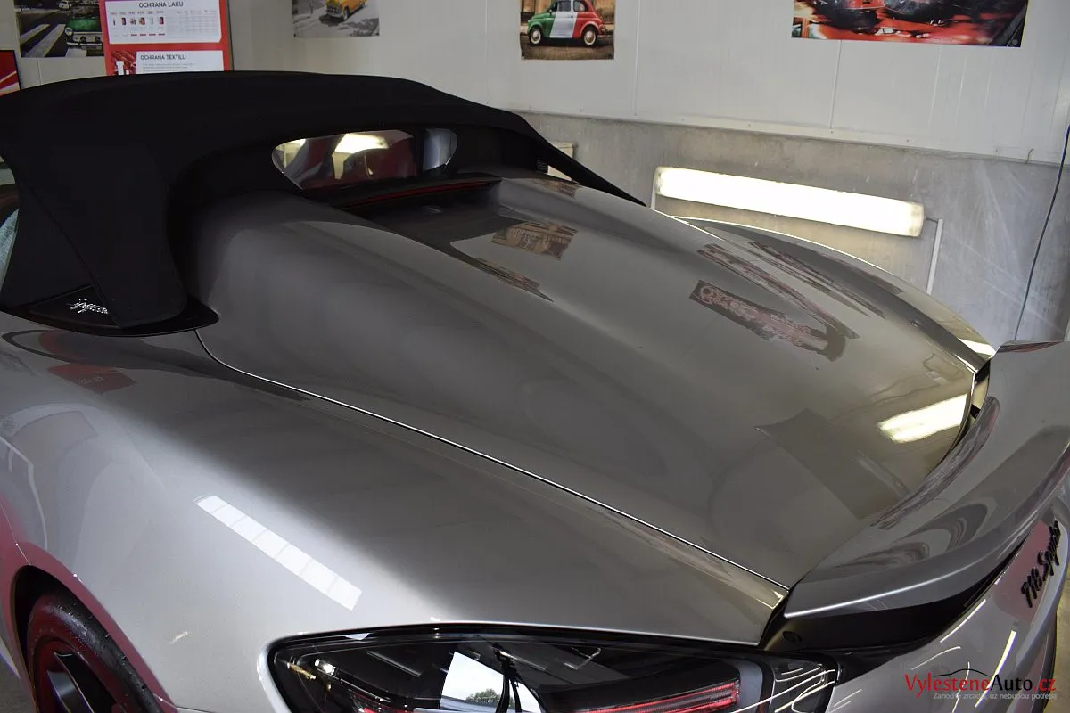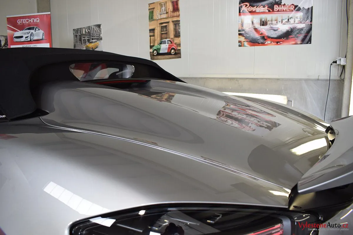 Kromě karoserie samotné jsme nanokeramikou Gtechniq ošetřili také litá kola, brzdové třmeny, podběhy, zádveří, spodní strany obou kapot, všechna skla, zrcátka, plátěnou střechu, plastové díly, klíček a koncovky výfuku.