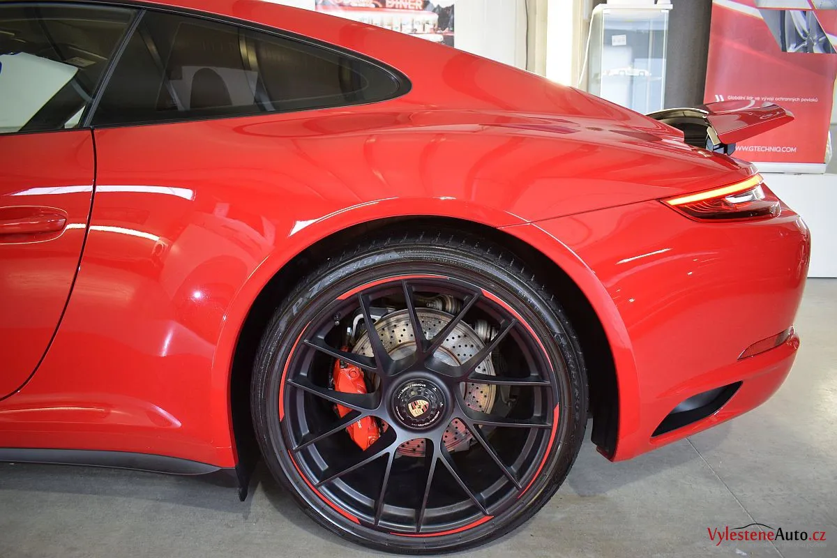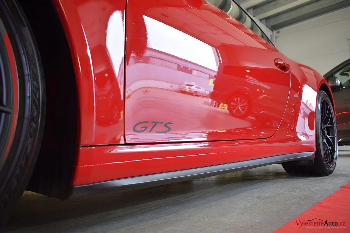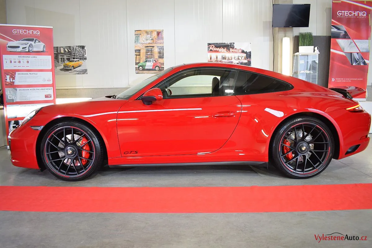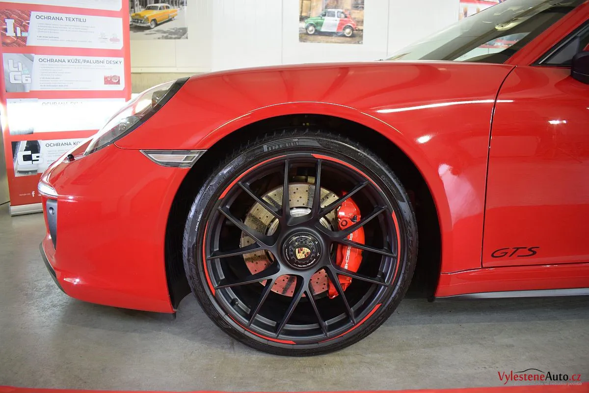 Porsche 911 GTS, to je plochý šestiválec biturbo o výkonu 450 koní, automatická převodovka PDK a oproti běžné verzi i rozšířená karoserie. Červená jí sluší...