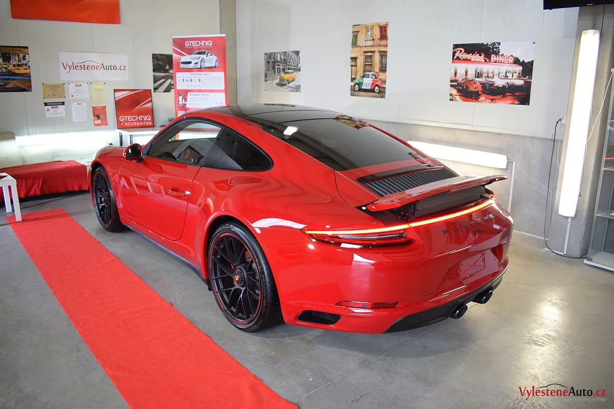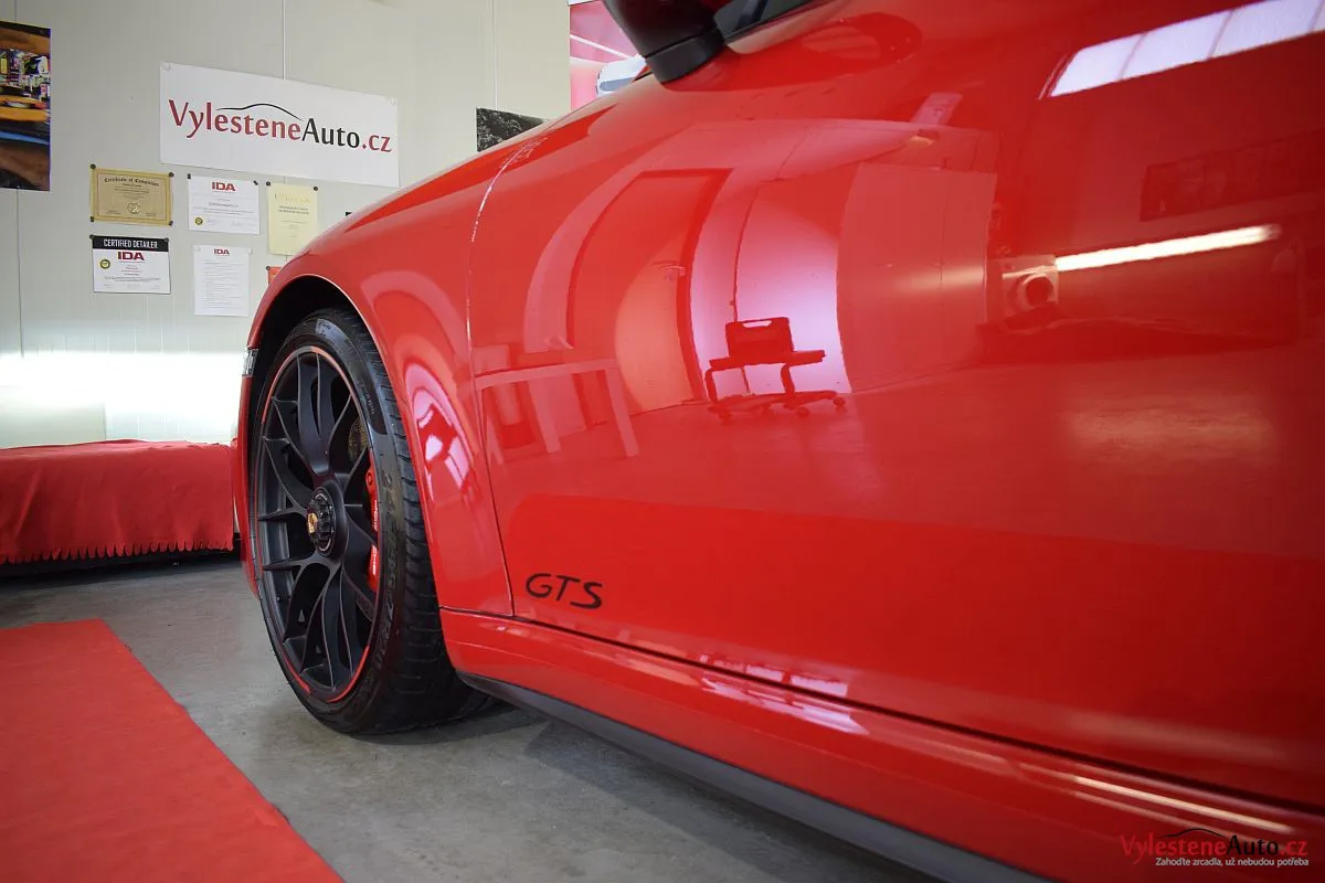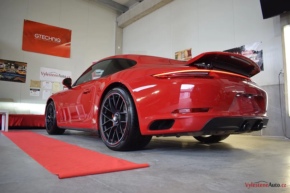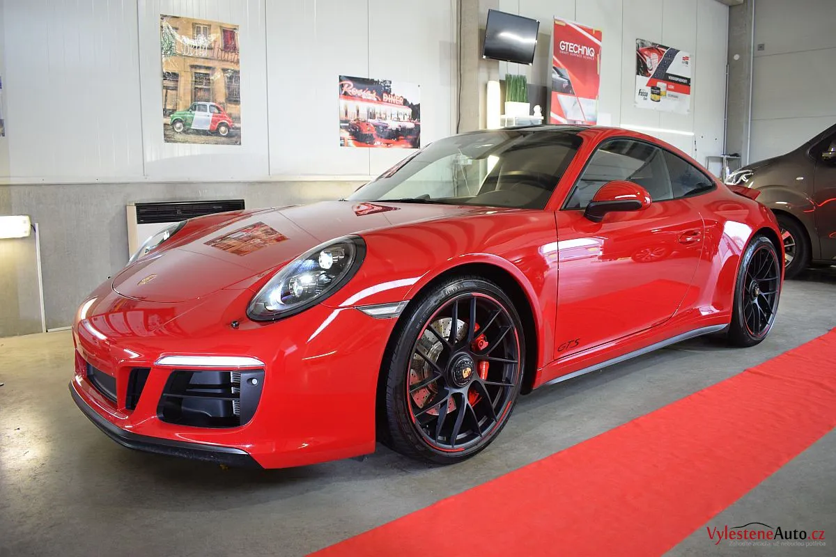 Porsche 911 GTS, to je plochý šestiválec biturbo o výkonu 450 koní, automatická převodovka PDK a oproti běžné verzi i rozšířená karoserie. Červená jí sluší...
