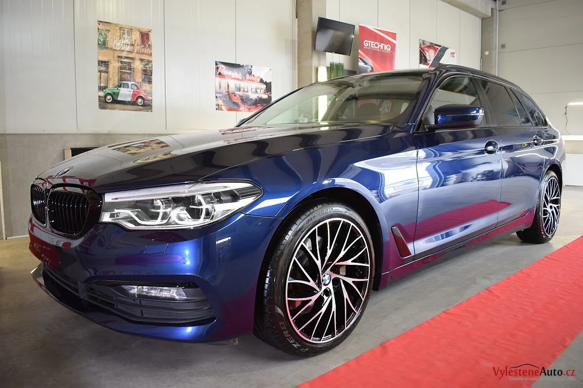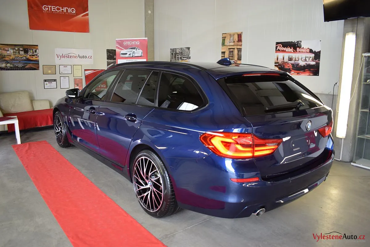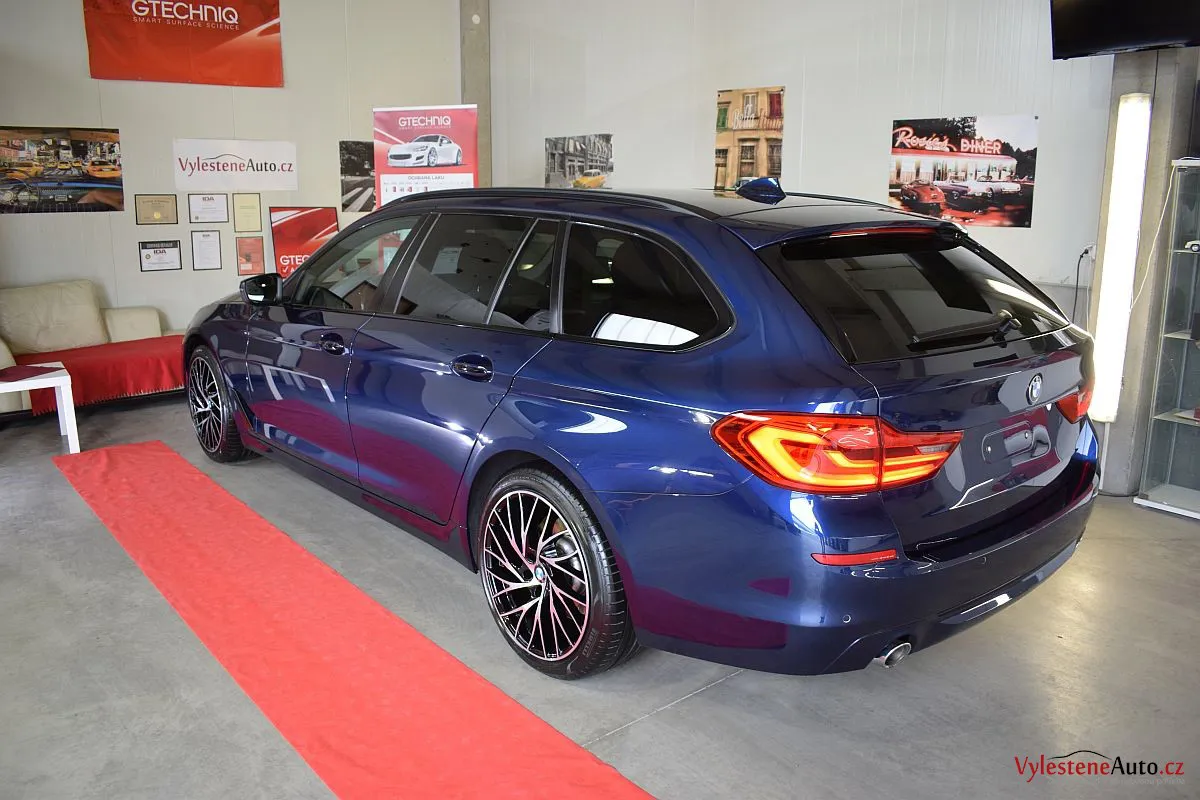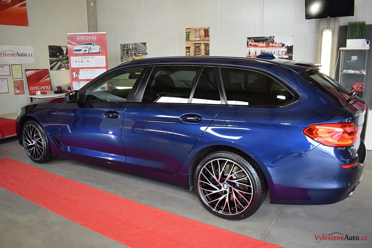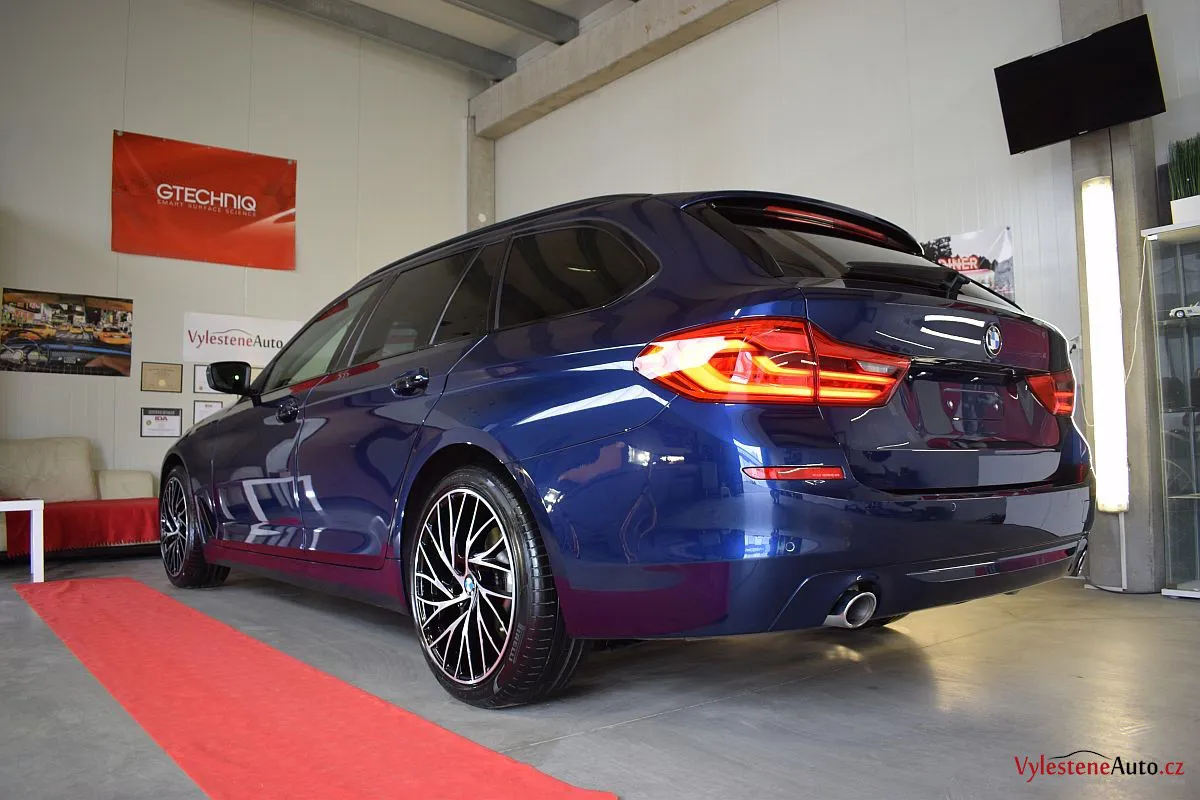 Tmavě modré BMW 530d kombi na zajímavých litých kolech si přijelo pro vícekrokovou renovaci laku a ochranu špičkovým voskem.