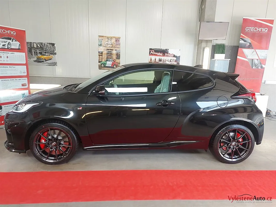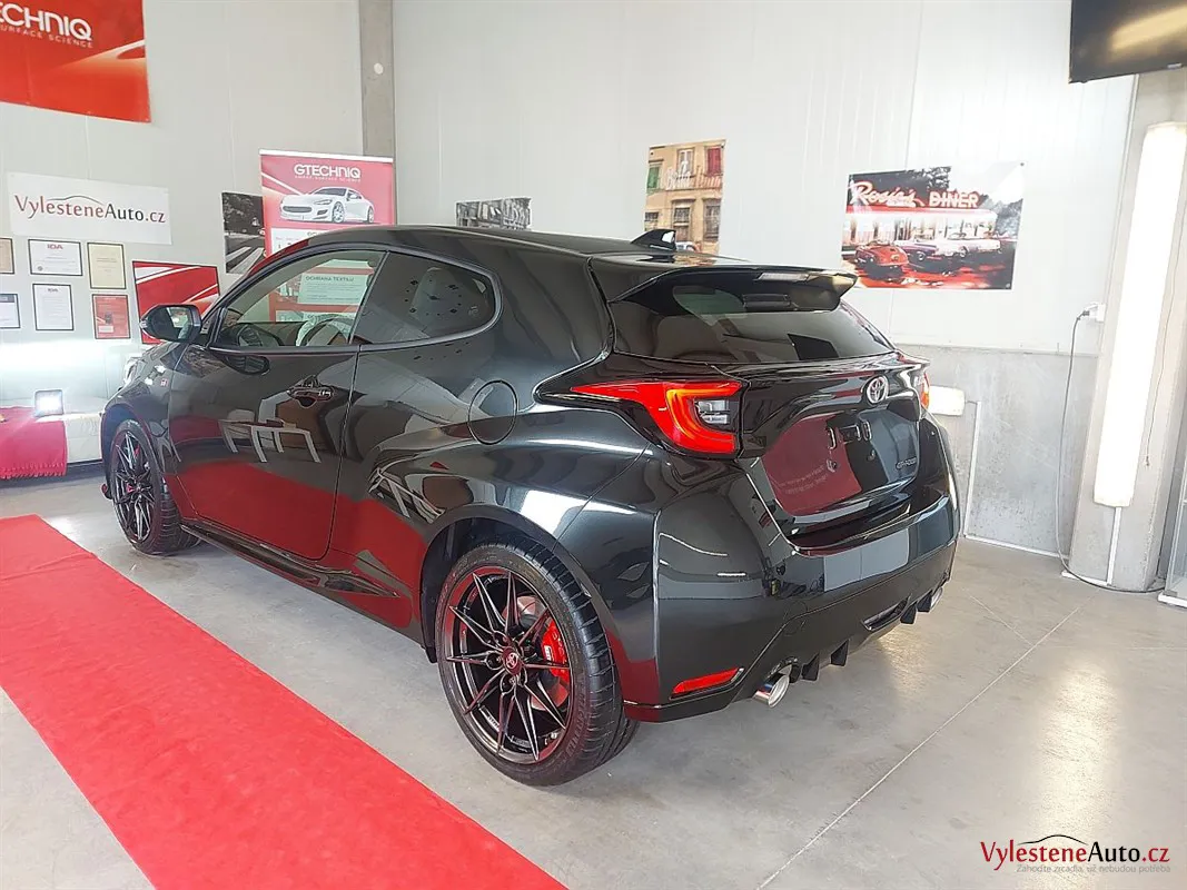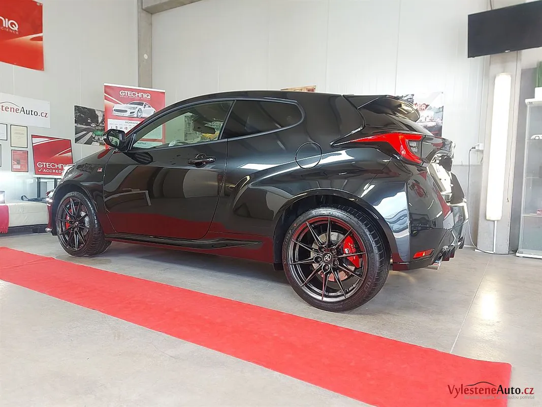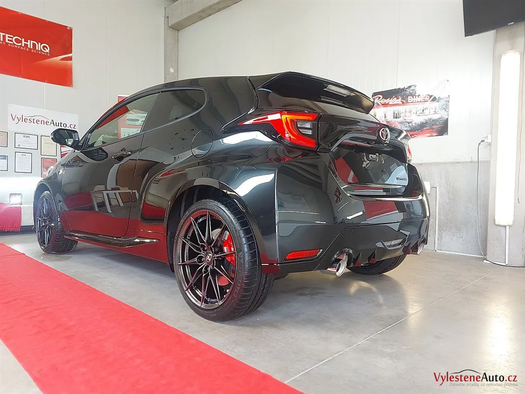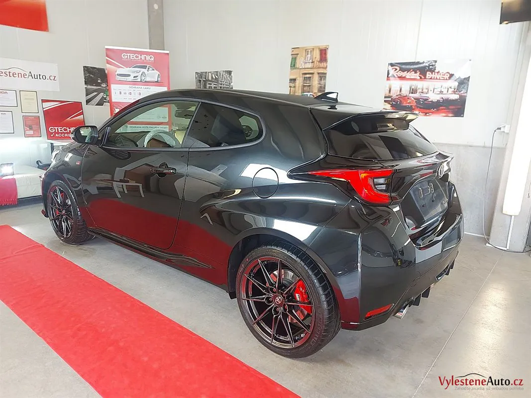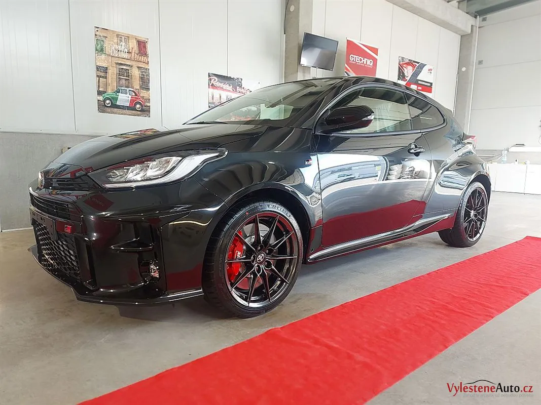 Špičková Toyota Yaris GR s tříválcovým turbomotorem, výkonem 260 koní, manuální převodovkou a pohonem všech kol. Už normálně GR působí jako zjevení, ale tenhle kousek má navíc ještě kovaná kola, závodní tlumiče a speciální brzdy.