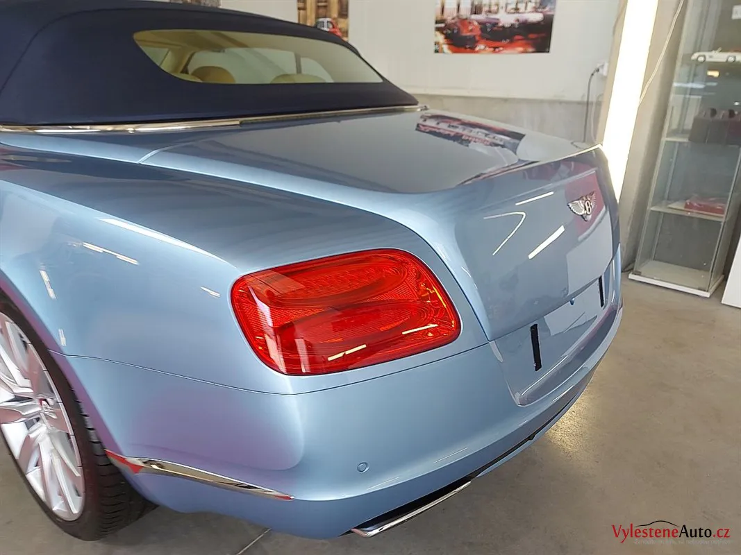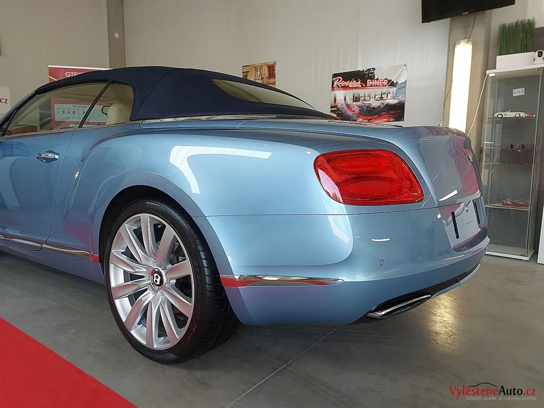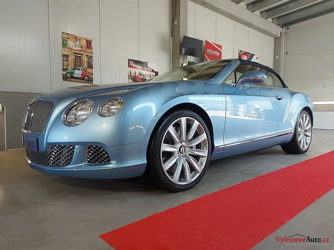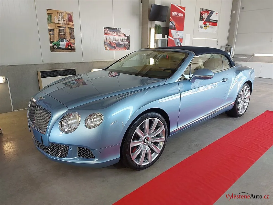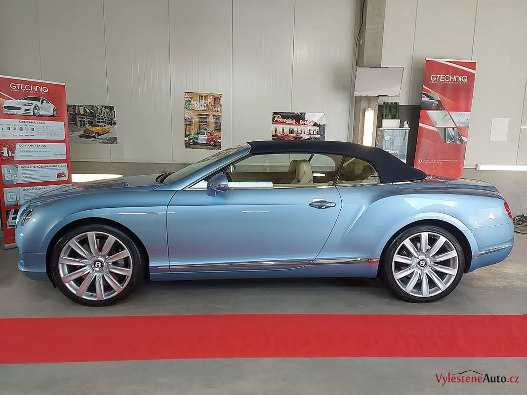 Bentley Continental GTC, nalakovaný jemnou modrou metalízou, vybavený luxusním interiérem a poháněný motorem W12 6.0 twinturbo. Provedli jsme dekontaminaci, vícekrokovou renovaci laku, leštění všech skel, zádveří, demontáž, čištění, leštění a voskování litých kol.