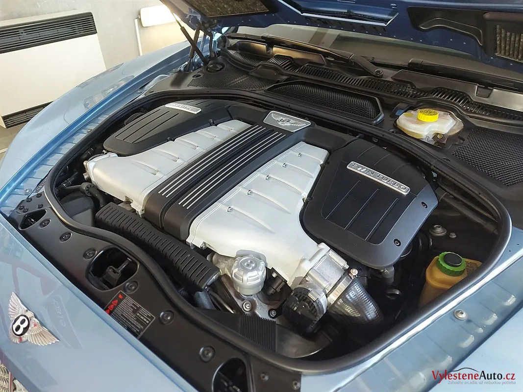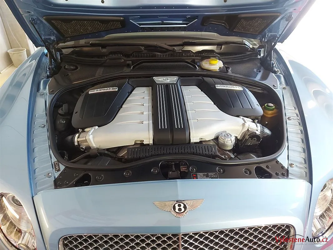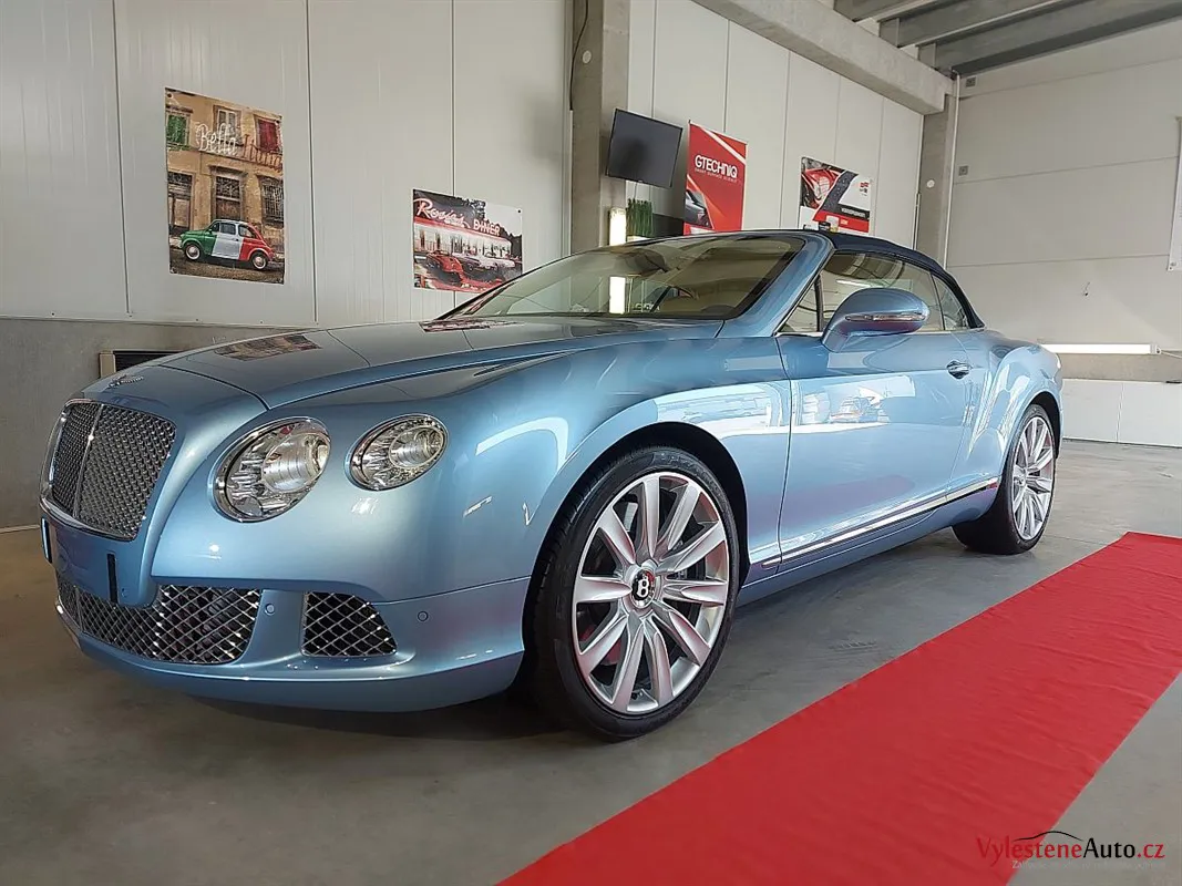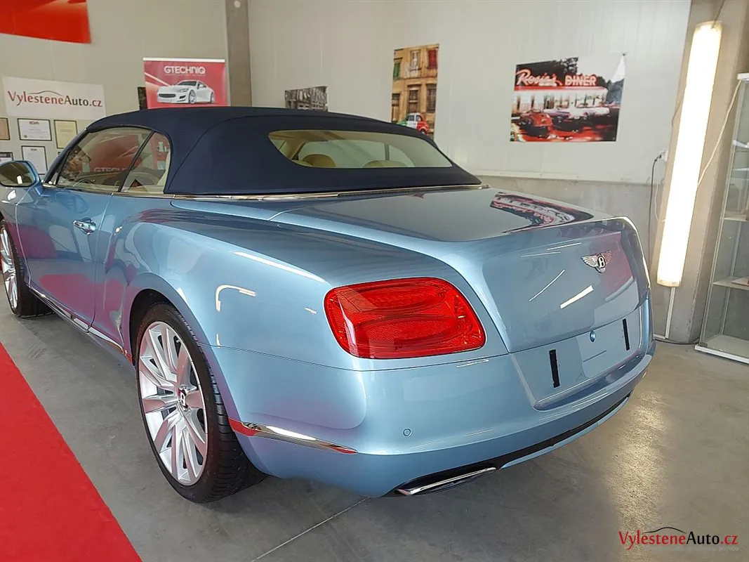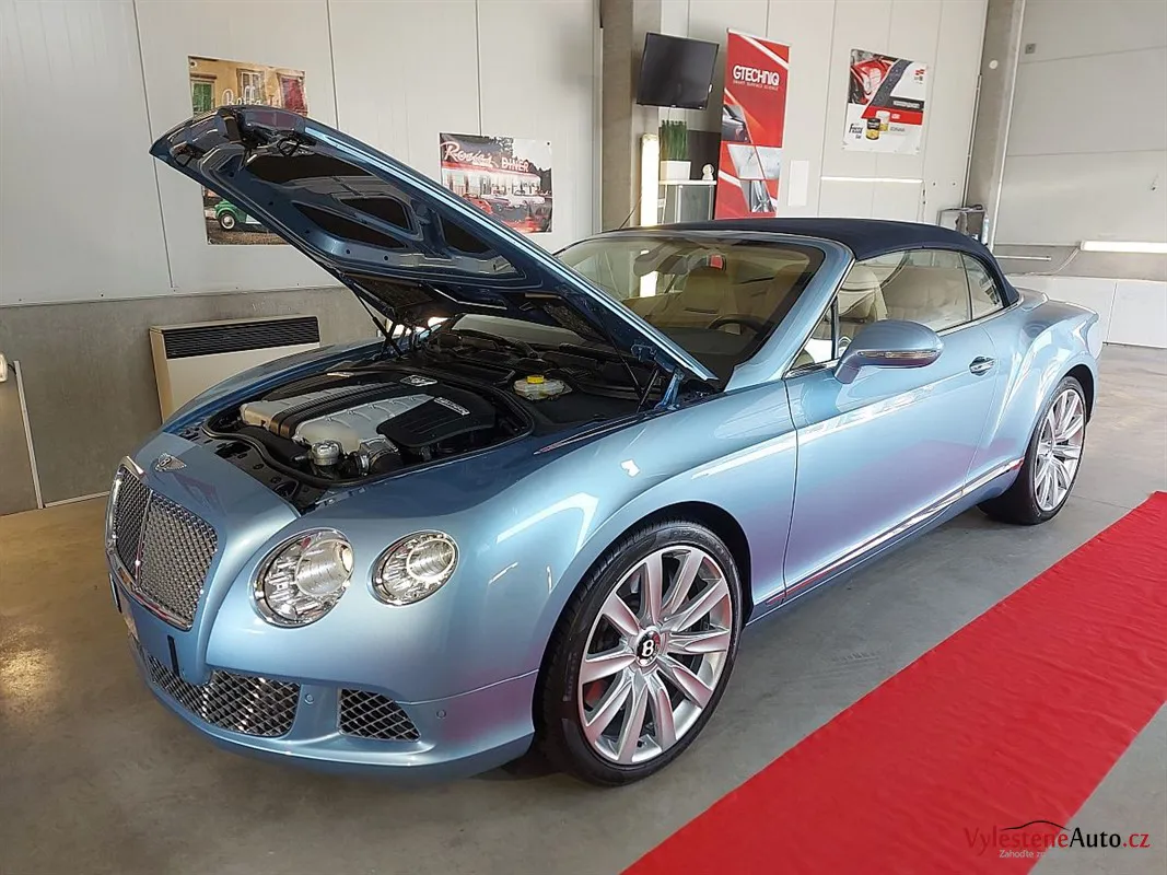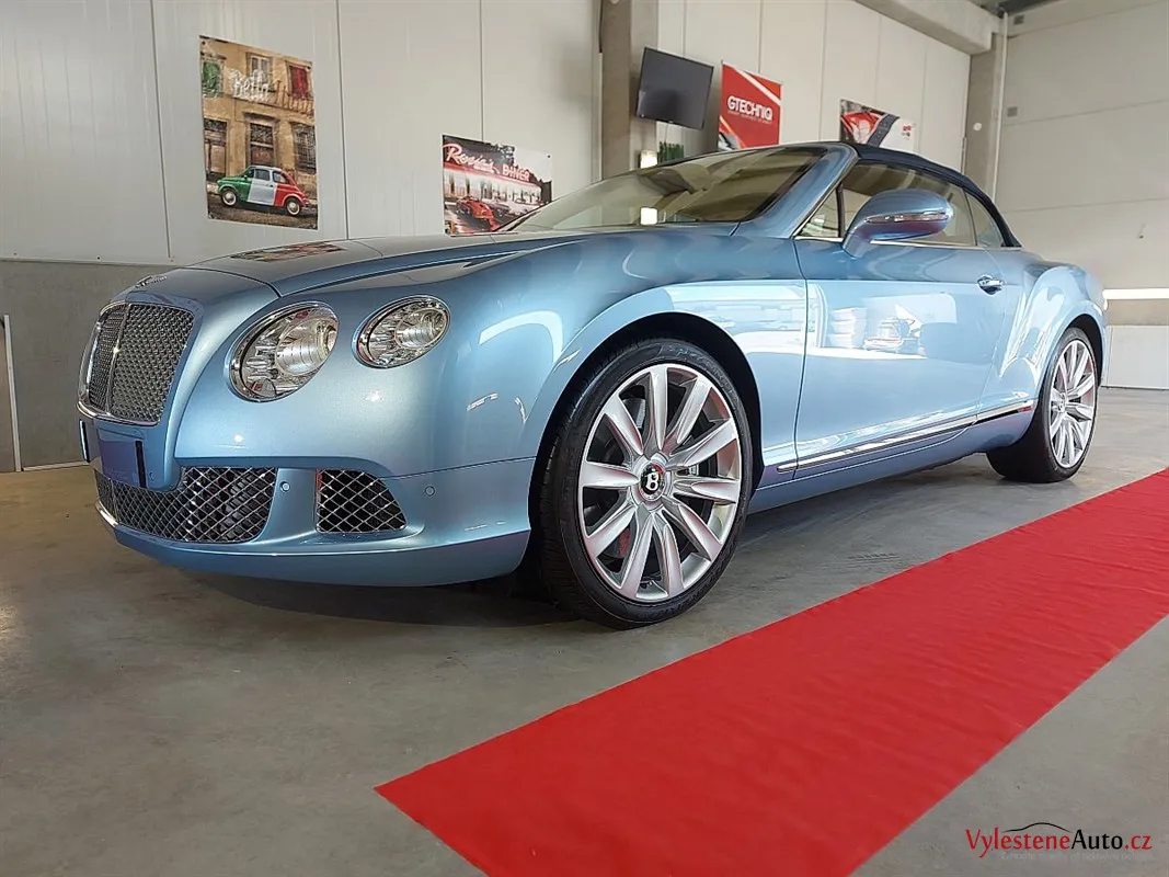 Bentley Continental GTC, nalakovaný jemnou modrou metalízou, vybavený luxusním interiérem a poháněný motorem W12 6.0 twinturbo. Provedli jsme dekontaminaci, vícekrokovou renovaci laku, leštění všech skel, zádveří, demontáž, čištění, leštění a voskování litých kol.