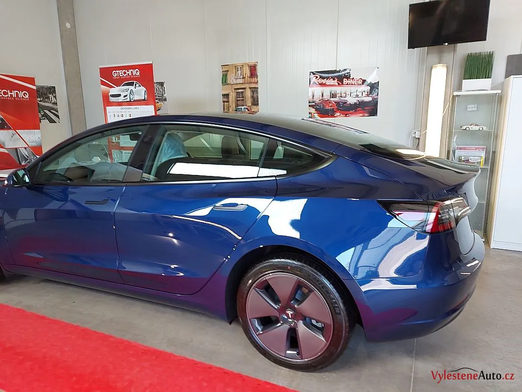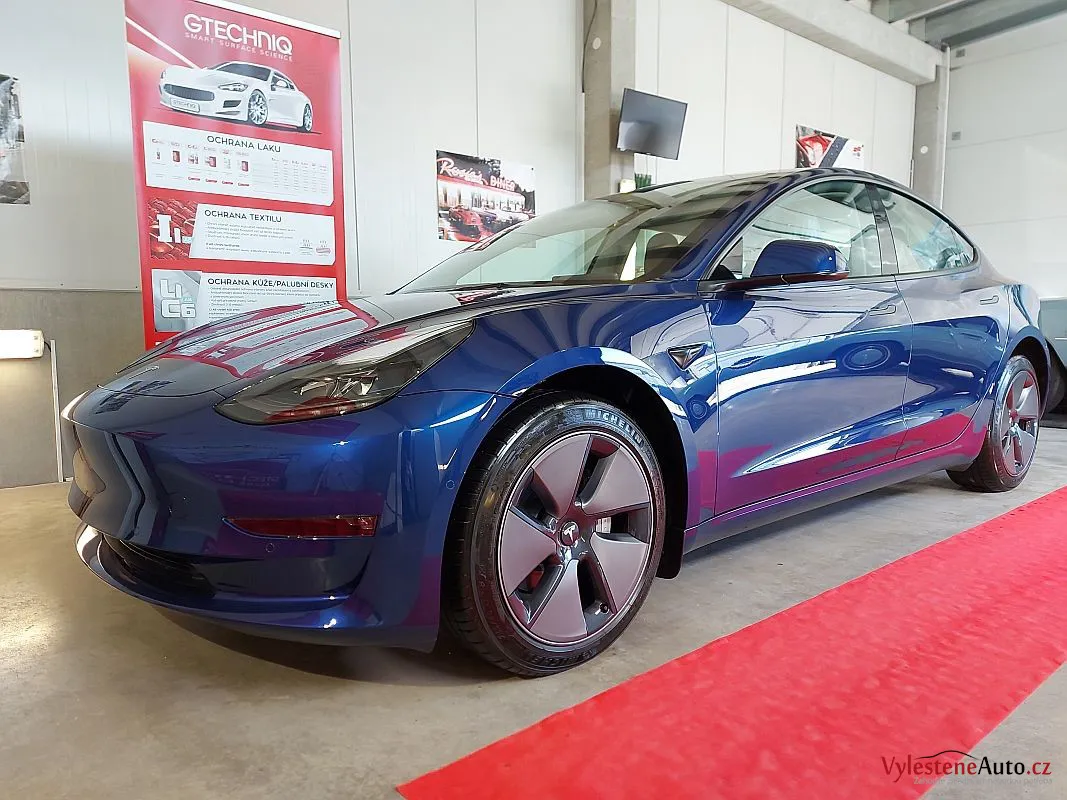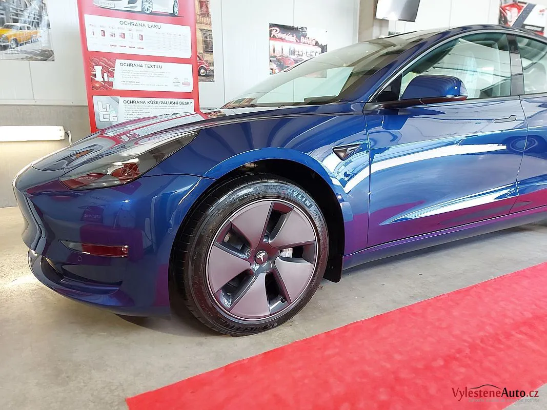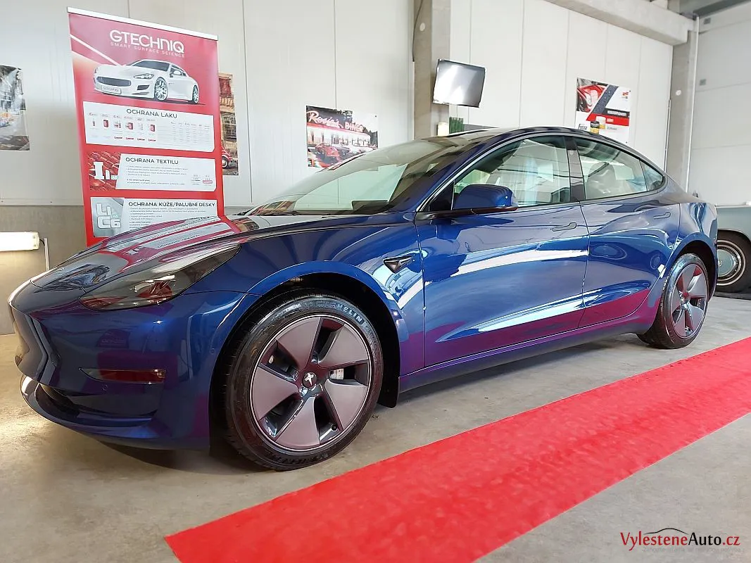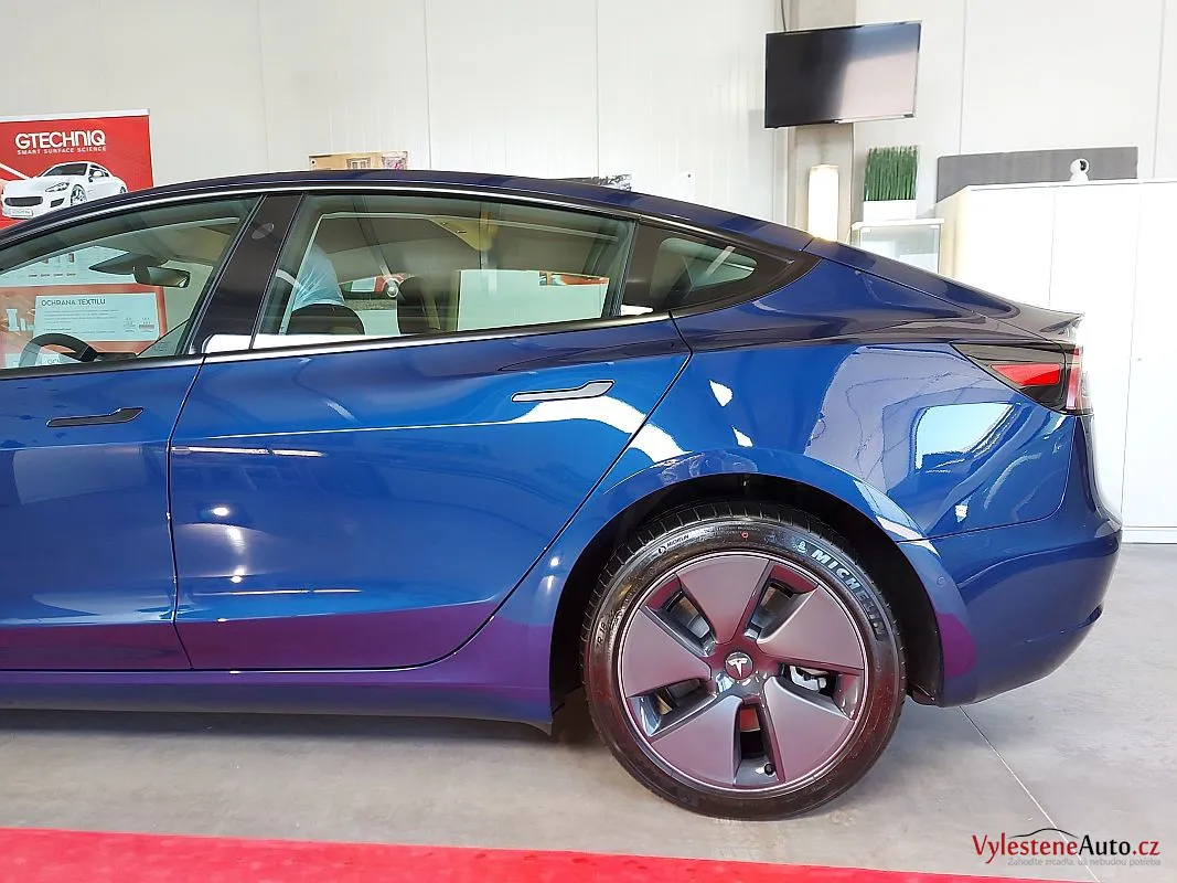Krásně modrá Tesla Model 3 po pečlivé dekontaminaci, vícekrokovém leštění laku a komplexní nanokeramické ochraně karoserie.