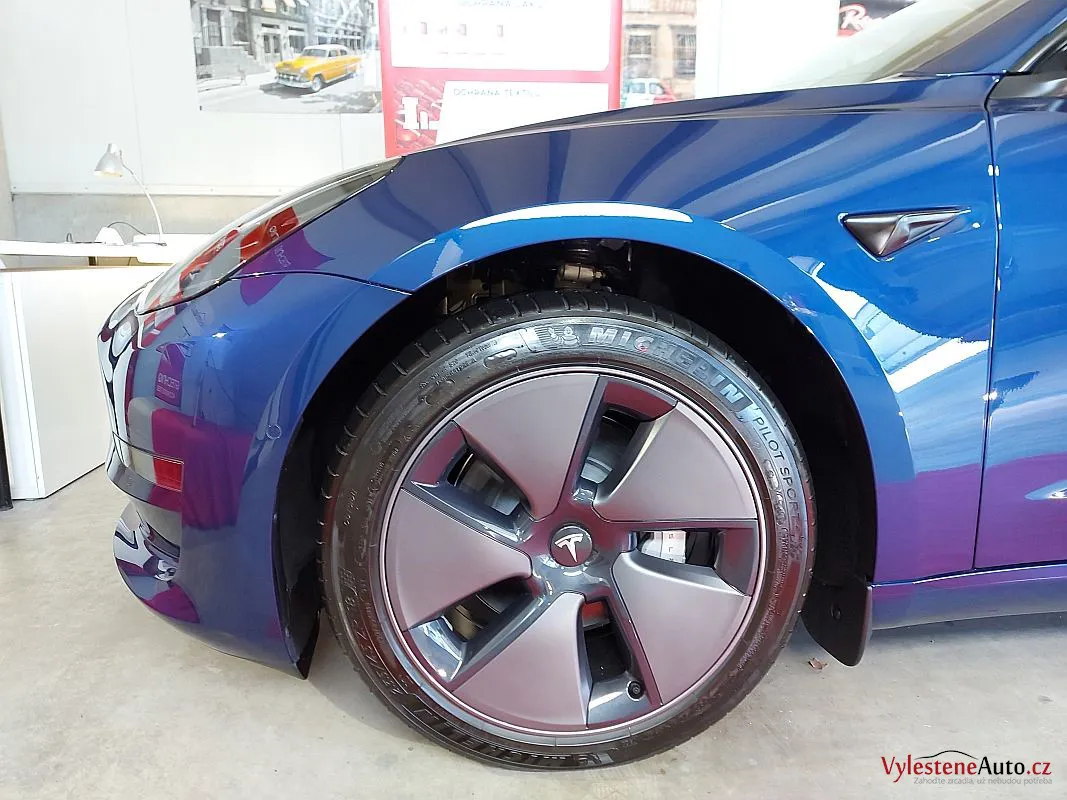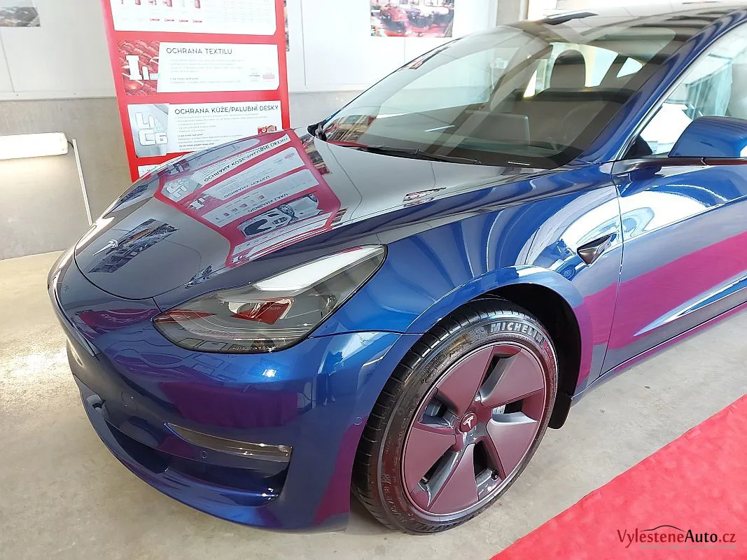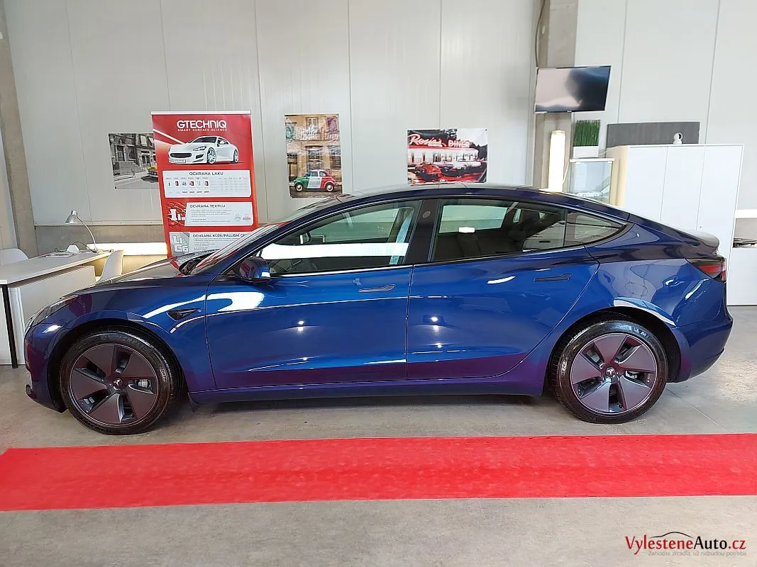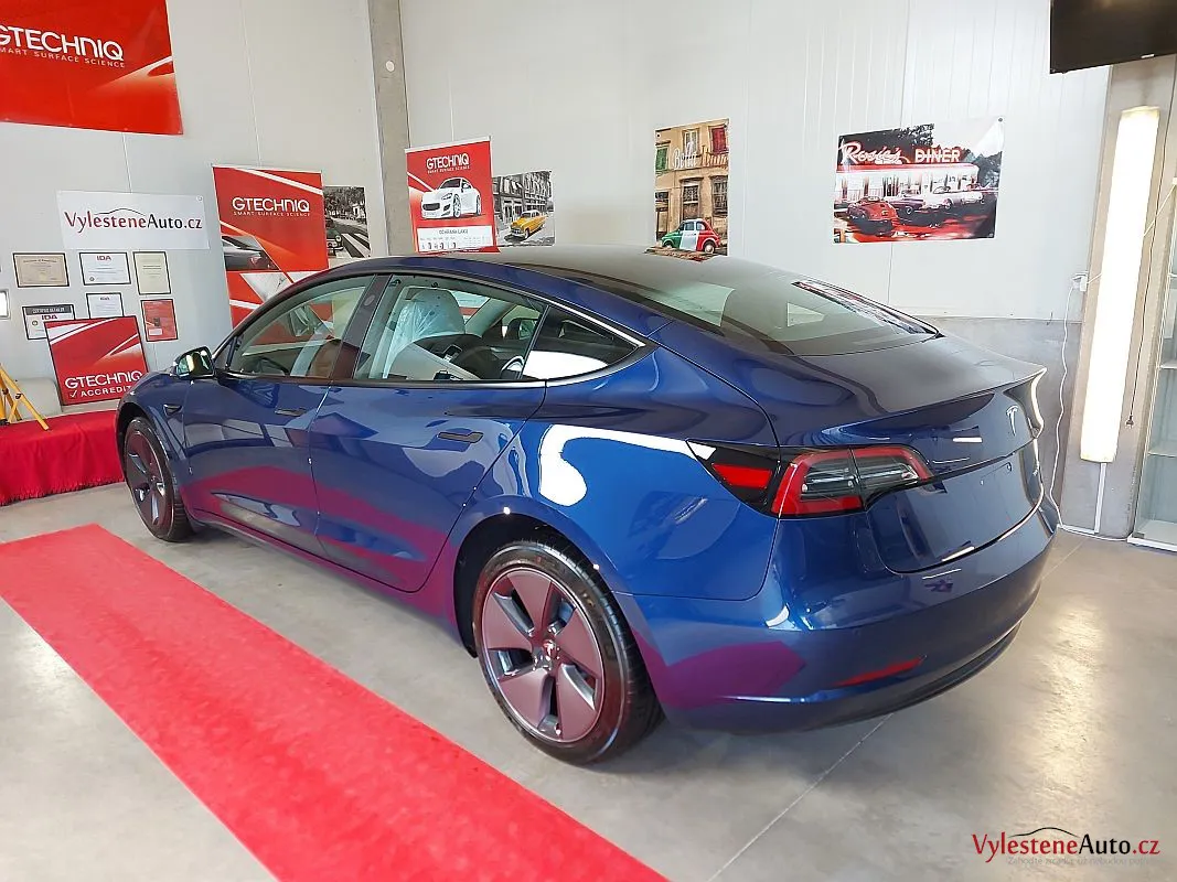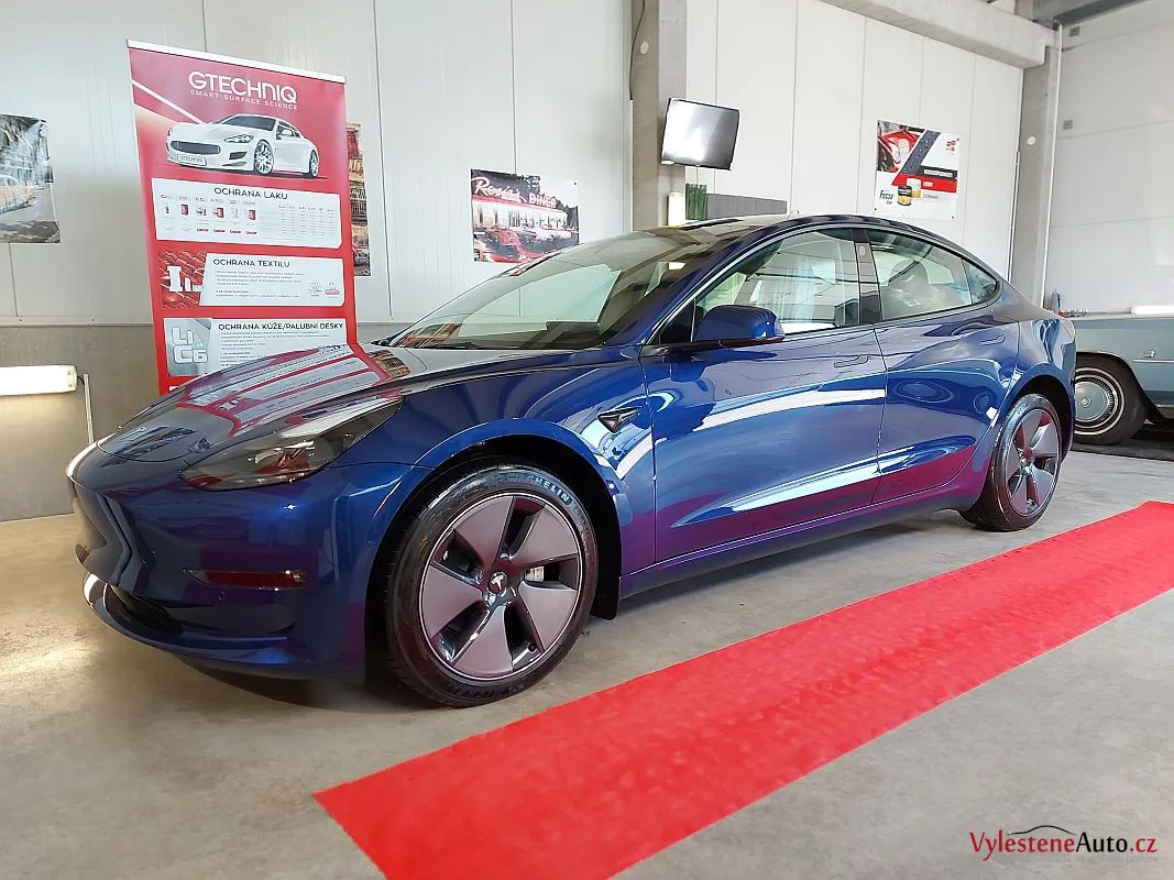 Krásně modrá Tesla Model 3 po pečlivé dekontaminaci, vícekrokovém leštění laku a komplexní nanokeramické ochraně karoserie.