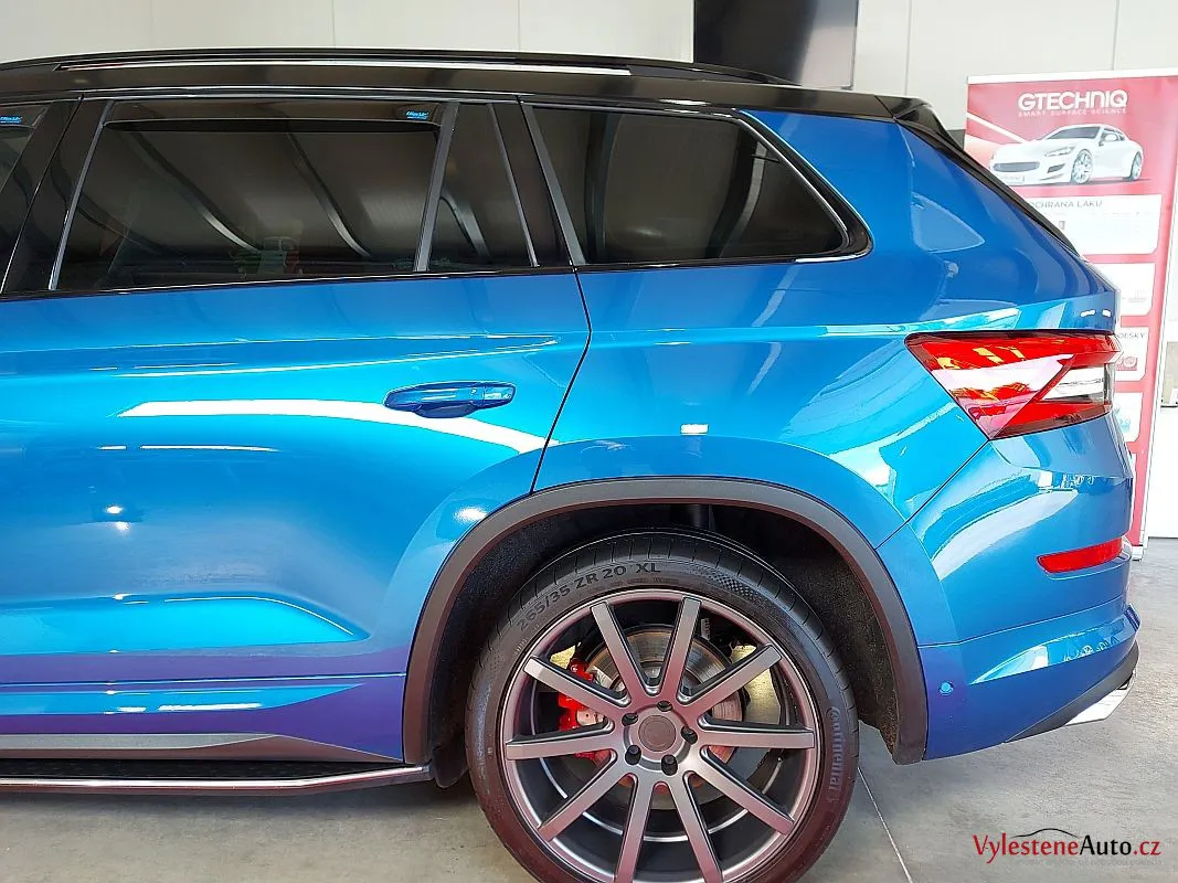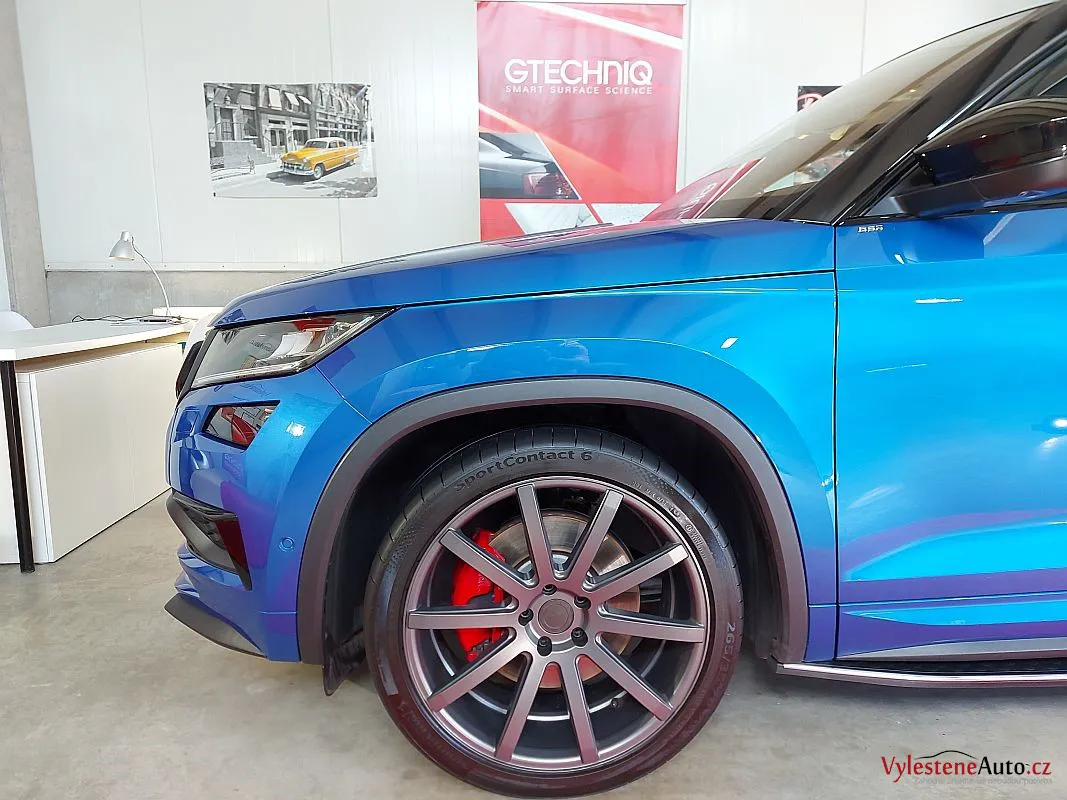 Naladěná Škoda Kodiaq s krásnou modrou metalízou, sníženým podvozkem a speciálními koly.