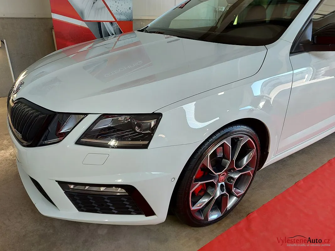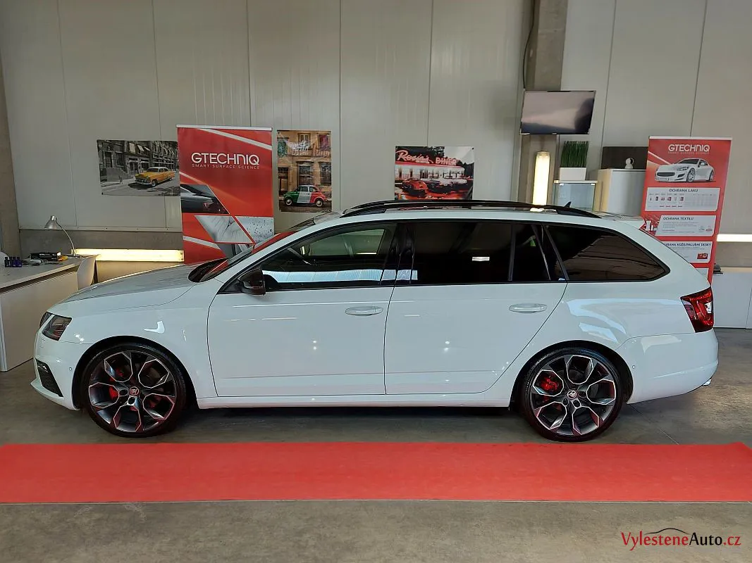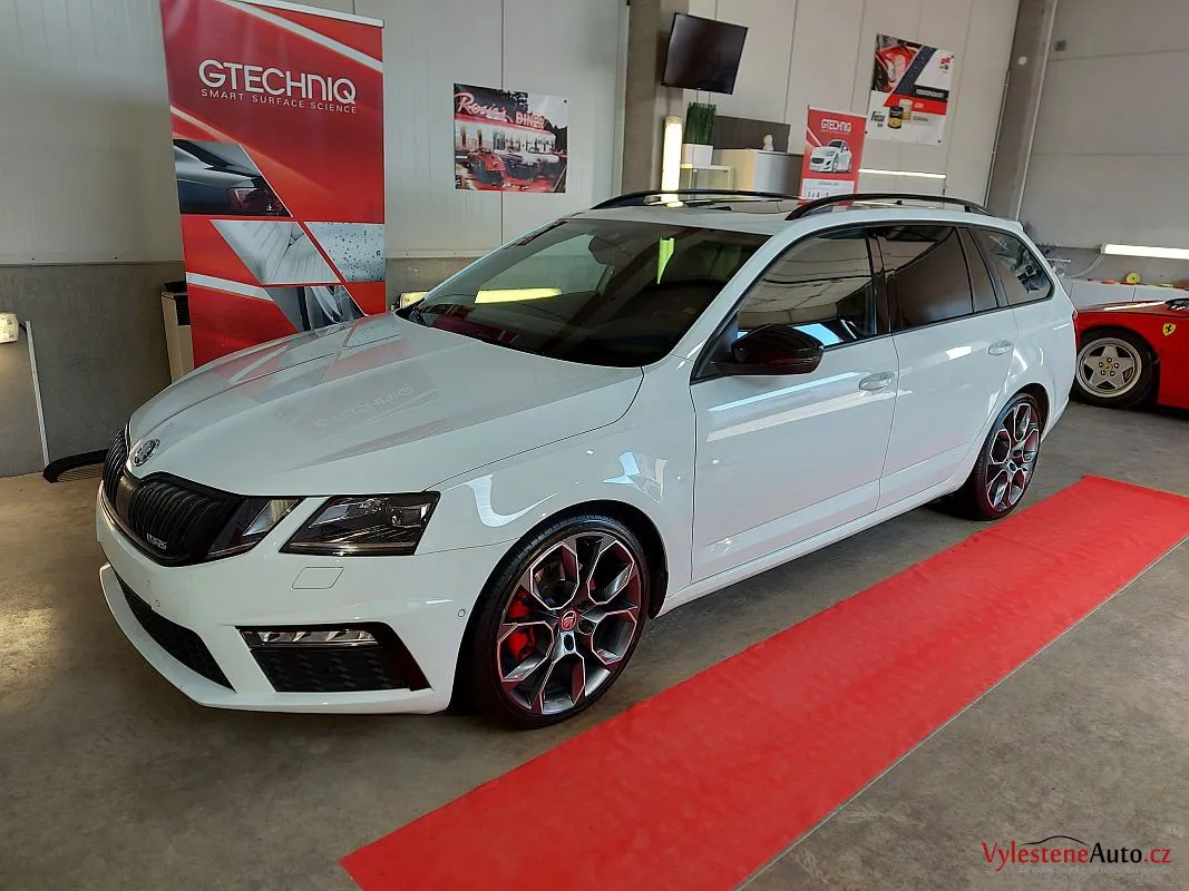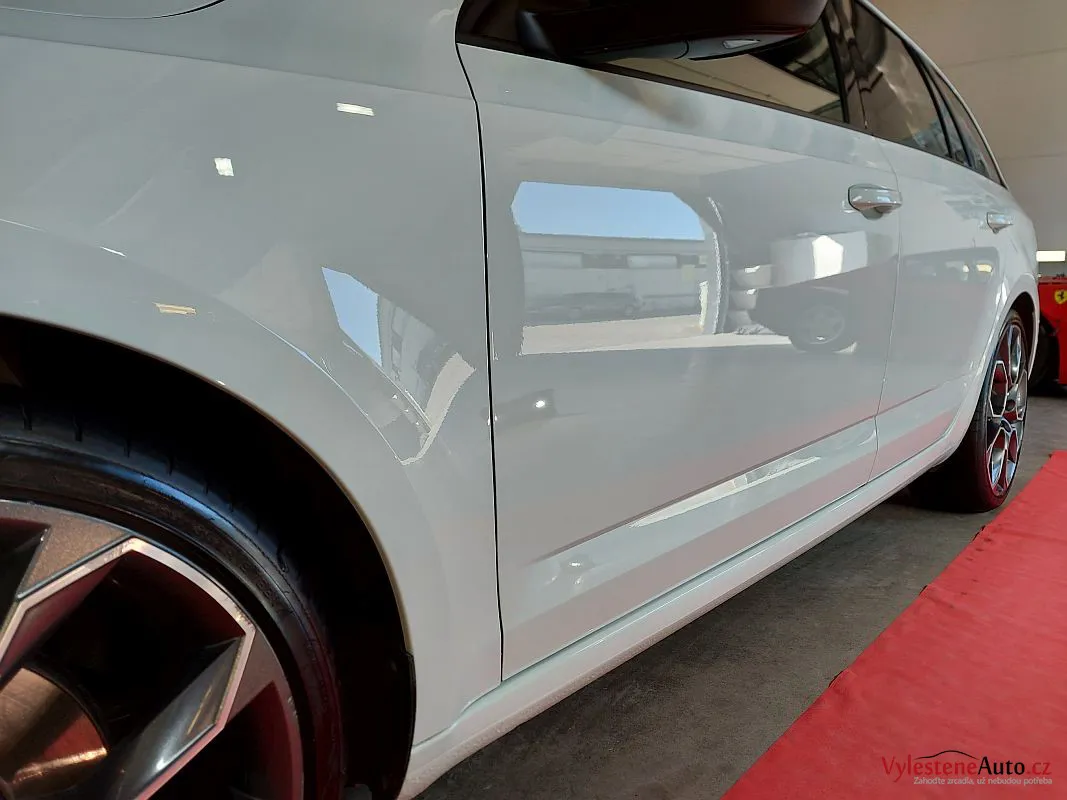 Škoda Octavia kombi RS po dekontaminaci, vícekrokové renovaci laku a ochraně špičkovou vícevrstvou keramikou s výdrží až 5 let a zárukou. Keramiku najdete také na všech sklech a zrcátkách, samozřejmostí je čištění motoru, zádveří a litých kol.