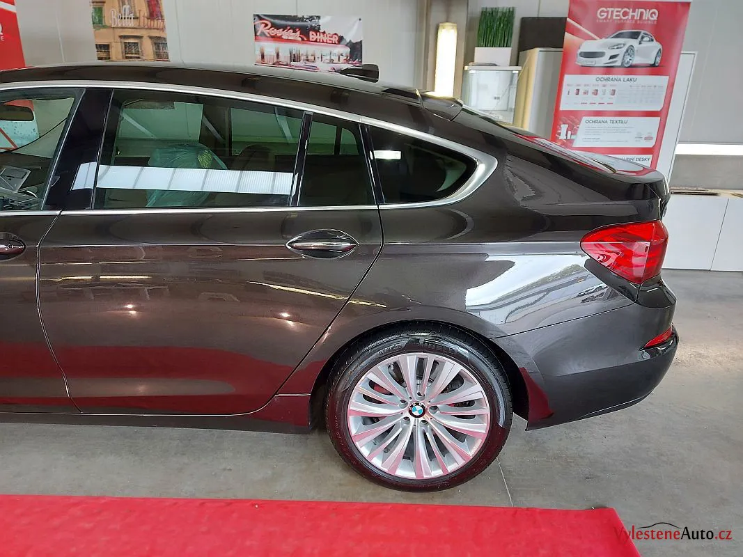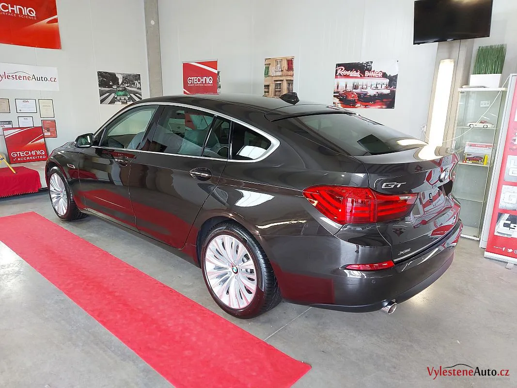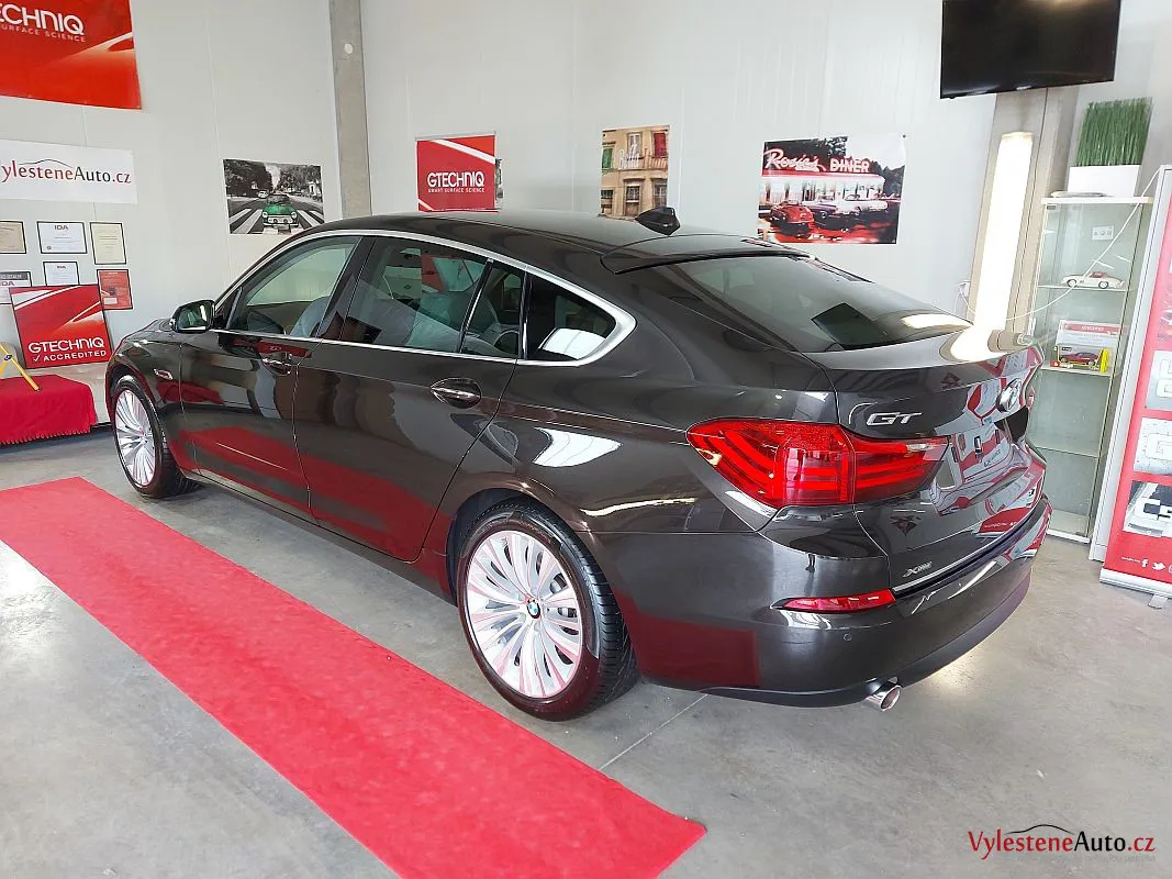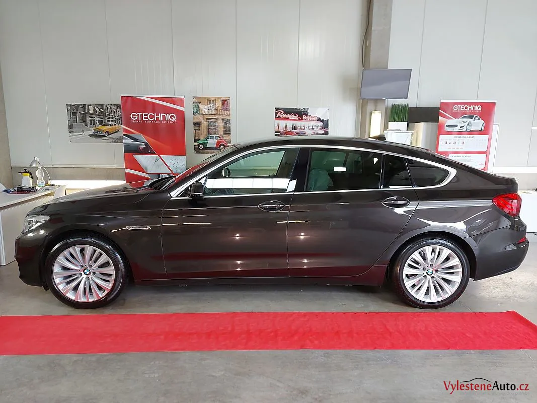 BMW 5 GT po dekontaminaci, jemném leštění laku a ochraně špičkovým voskem. Samozřejmostí je čištění litých kol, motoru i zádveří, strojní leštění všech skel a zrcátek a aplikace kvalitních tekutých stěračů.