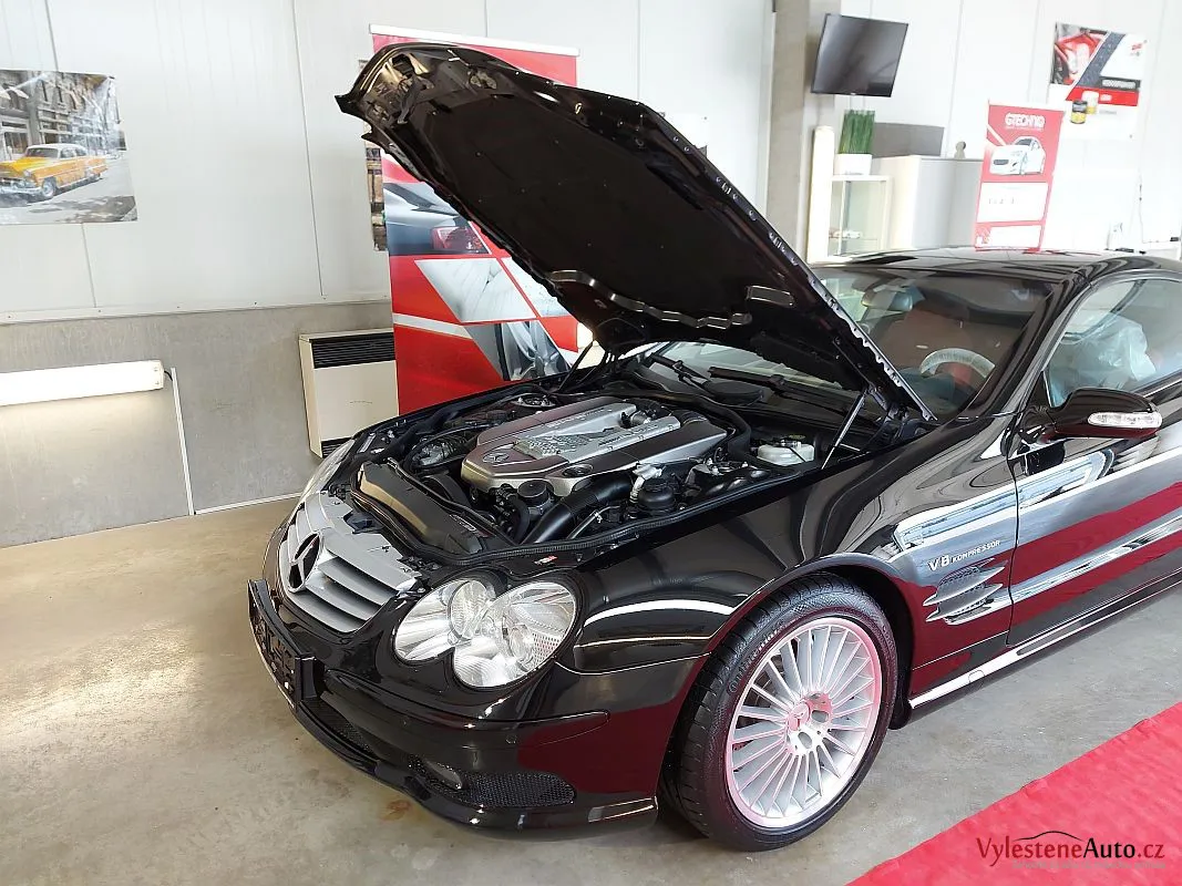 Nádherně postavený Mercedes SL55 AMG s kompresorem dopovaným motorem V8 a interiérem plným hliníkových dekorů a červené kůže.