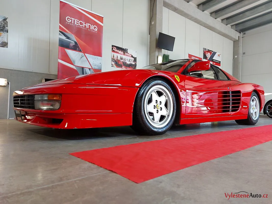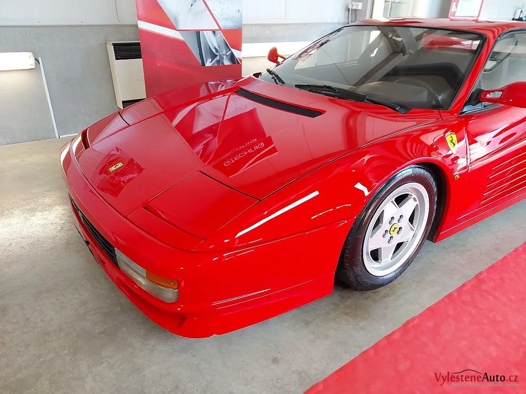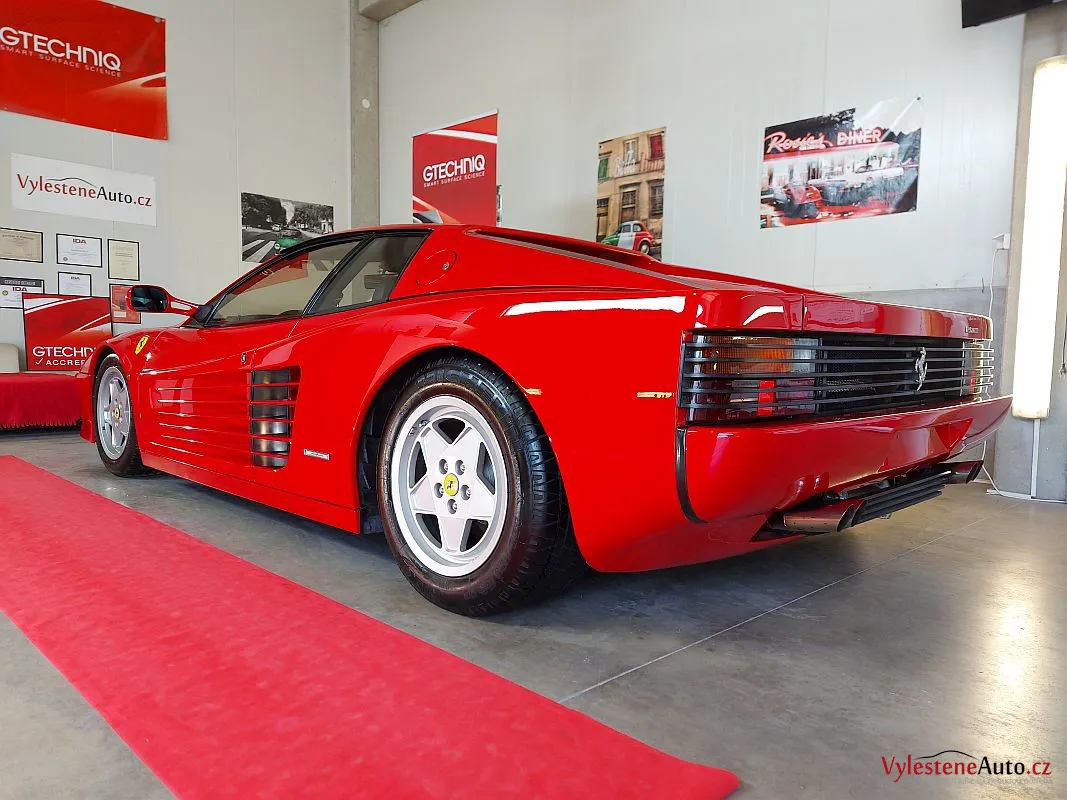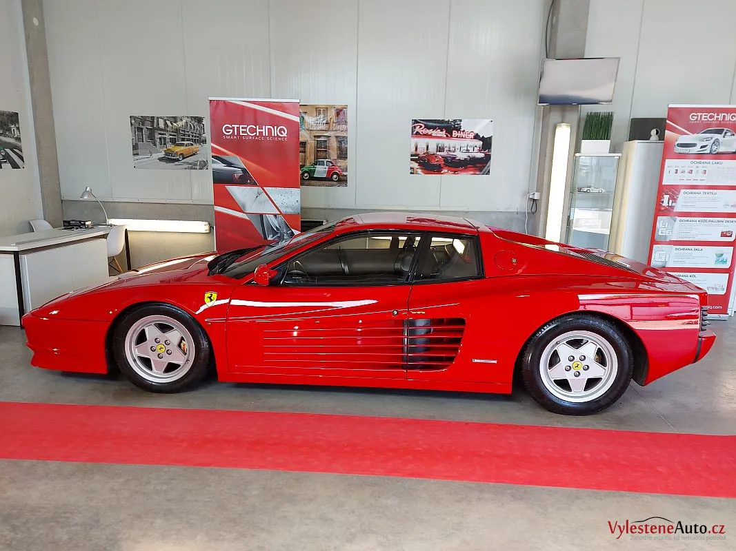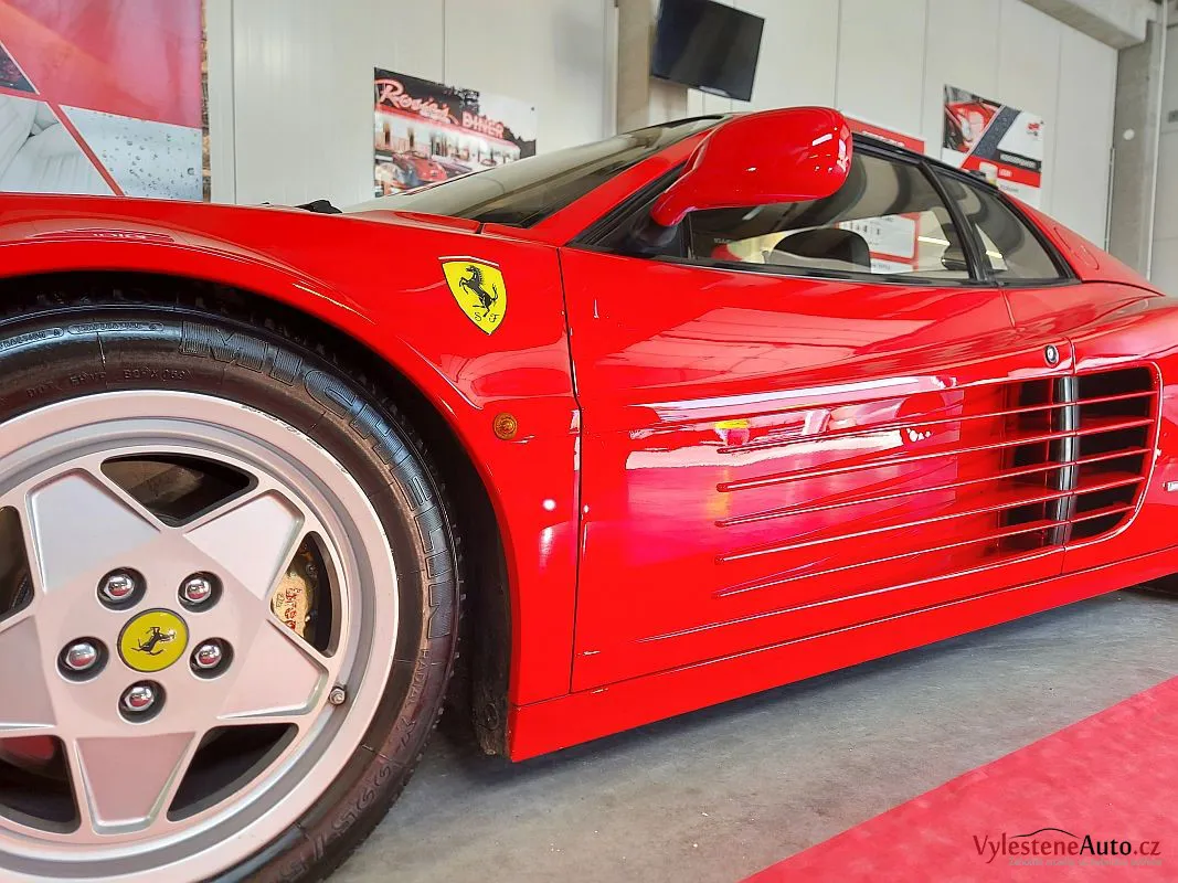 Nádherné a naživo neskutečně nizoučké Ferrari Testarossa, legenda s plochým motorem V12, červeně lakovanými ventilovými víky a spoustou úžasných detailů.