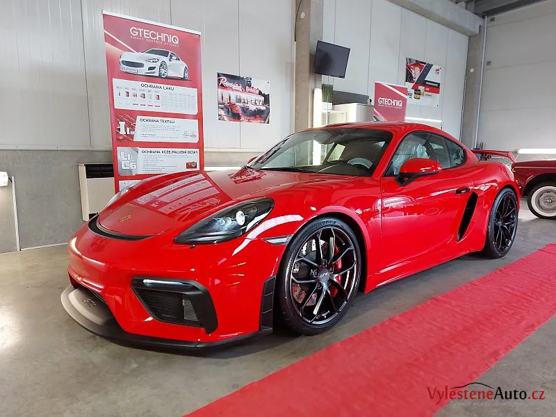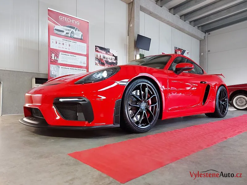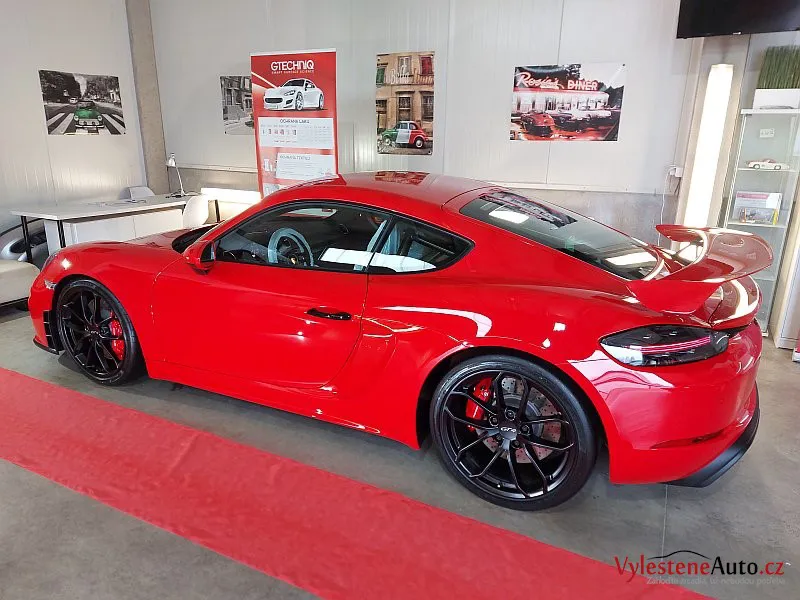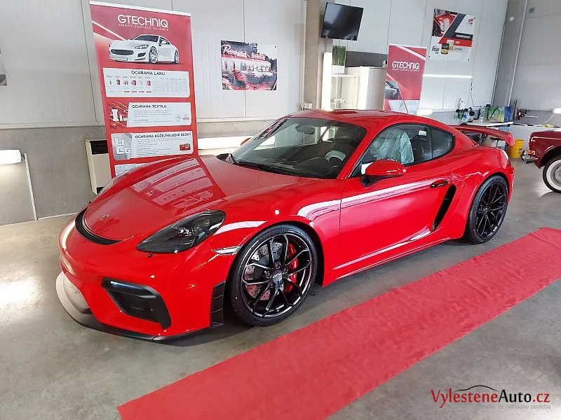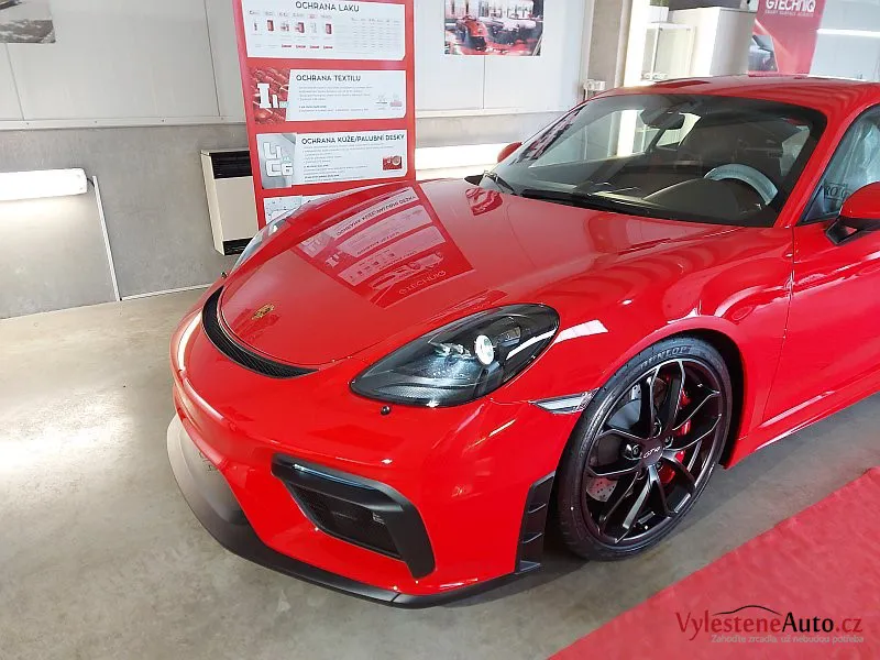 Nádherné Porsche Cayman GT4 po vícekrokovém leštění laku a ochraně špičkovou vícevrstvou keramikou. Keramiku najdete také na všech sklech, zrcátkách, litých kolech, brzdičích, krytech světlometů, matných plastových dílech, v zádveří a nebo třeba na klíčku.