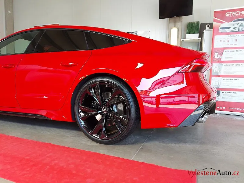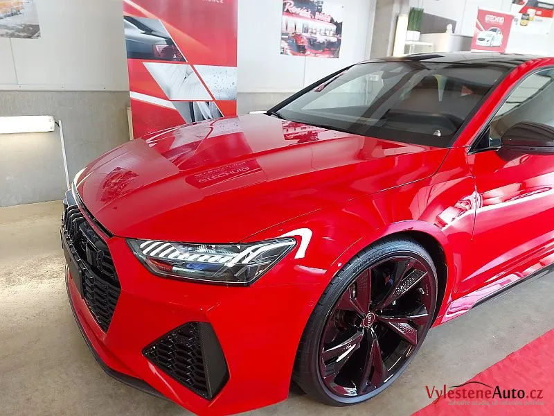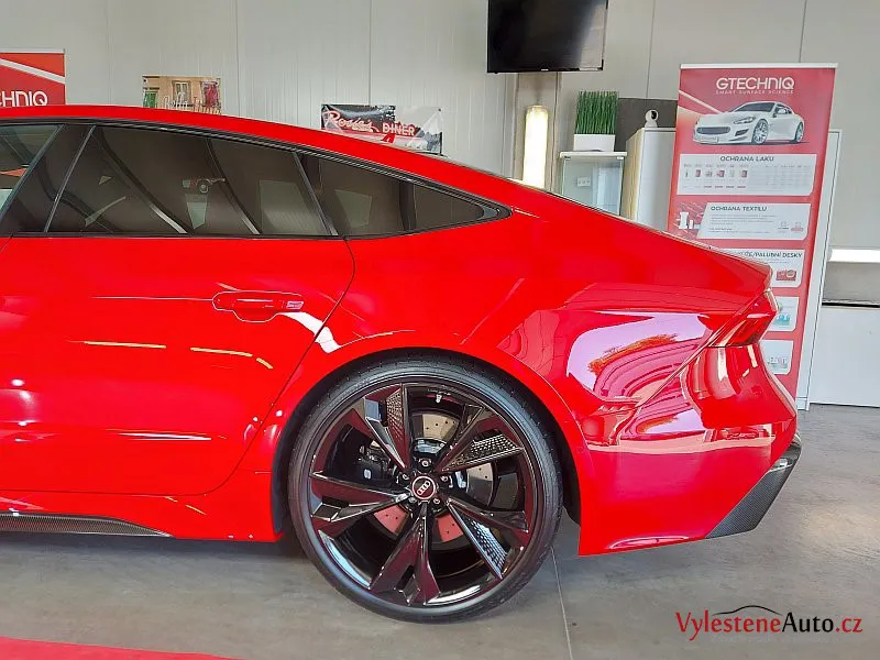Brutální Audi RS7, kterou kromě buráceni motoru V8 biturbo, zvýrazňují obrovská litá kola, ale hlavně oslnivý červený lak.