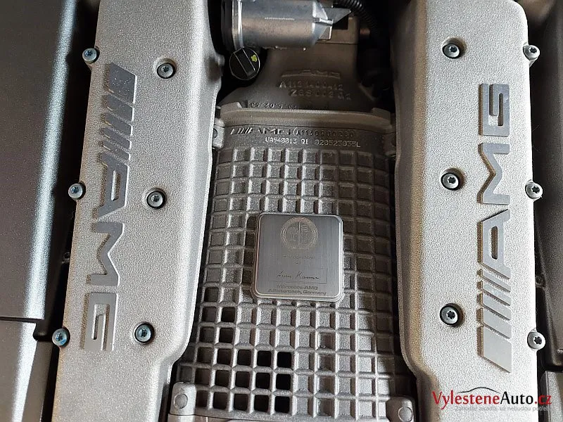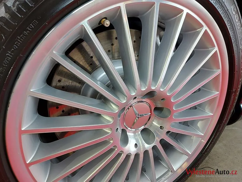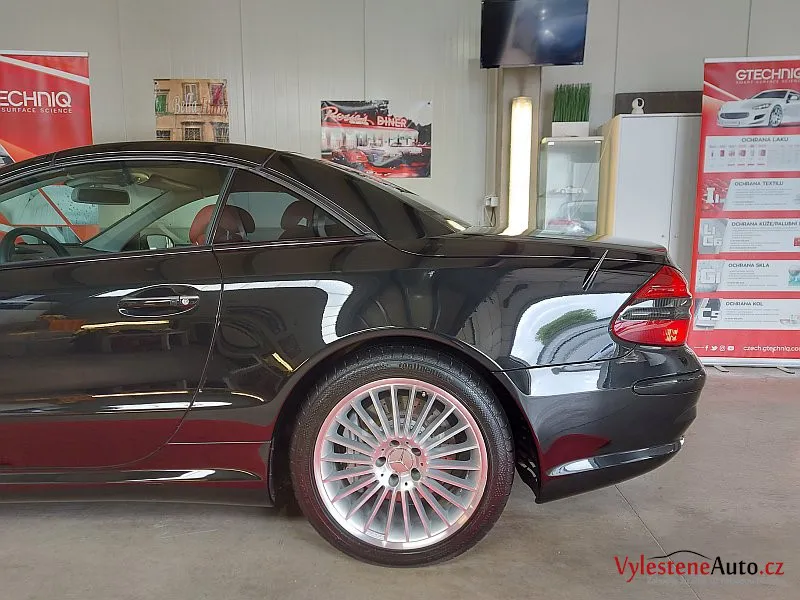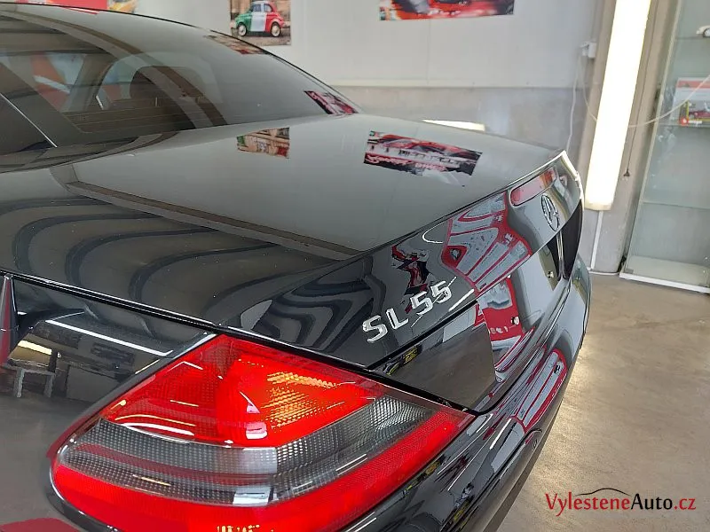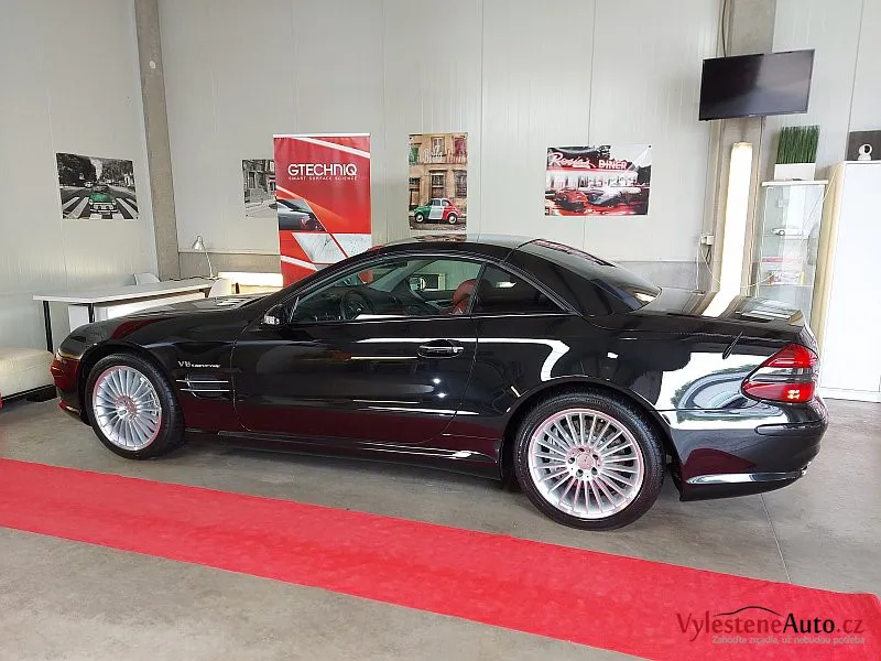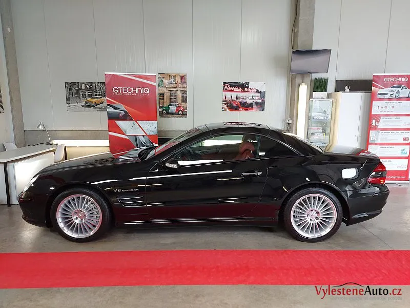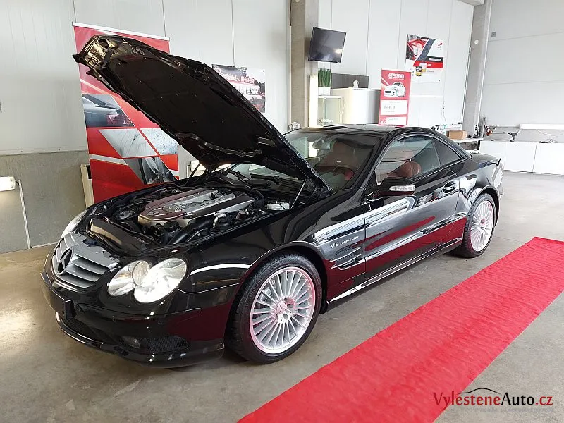 Nádherný Mercedes SL55 AMG s kompresorovým motorem V8, sklápěcí kovovou střechou a červeným koženým interiérem.