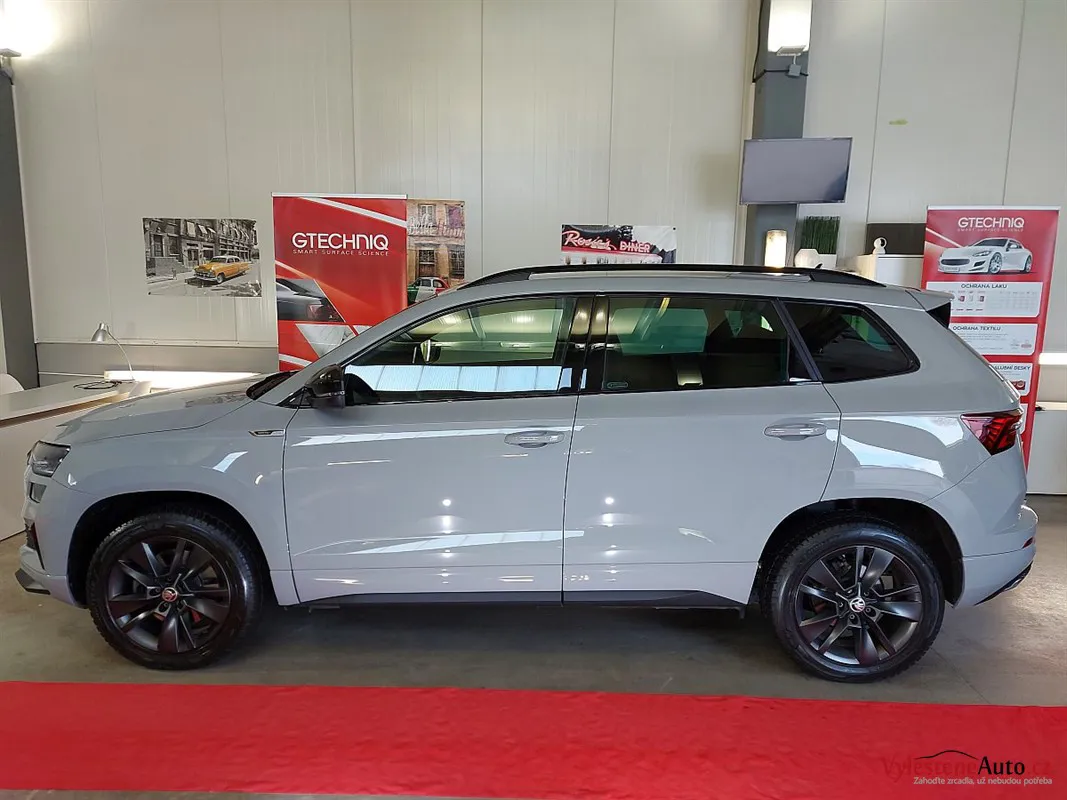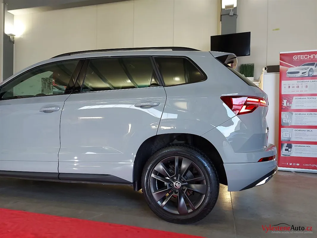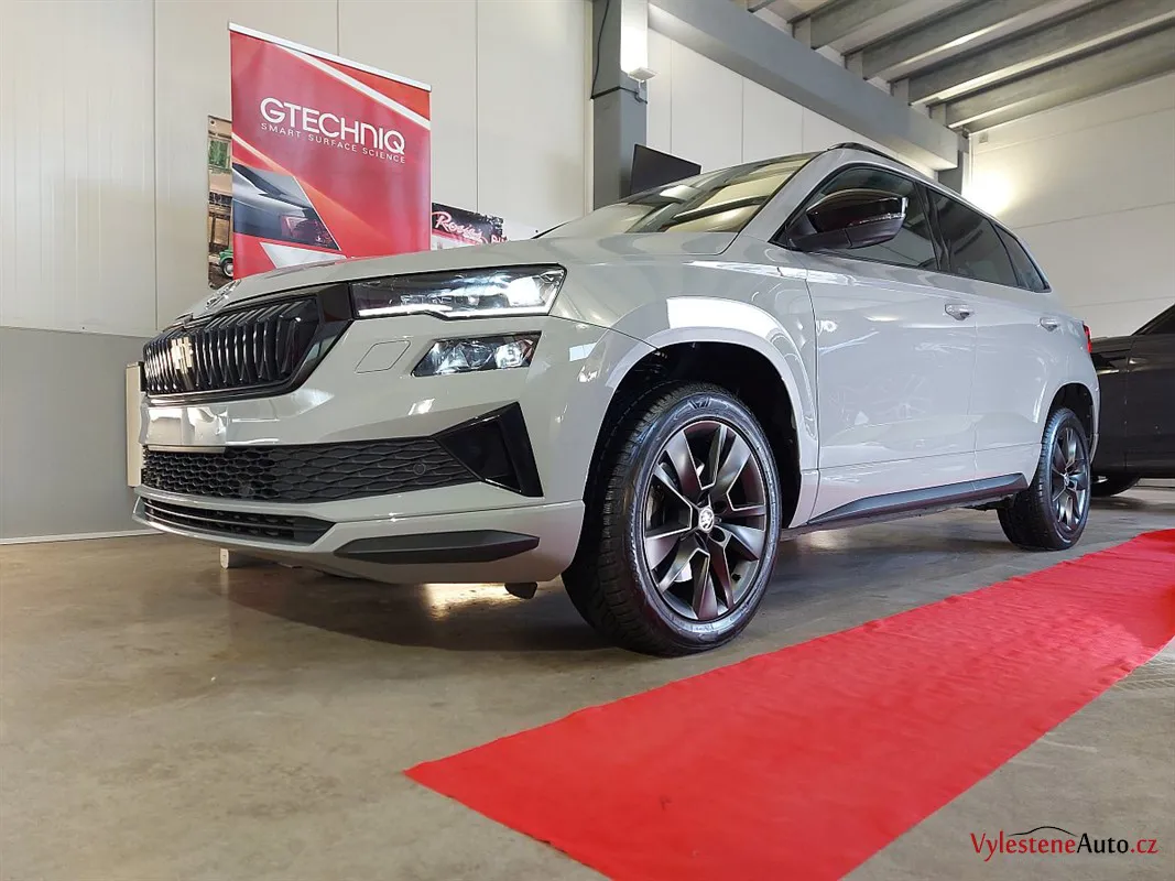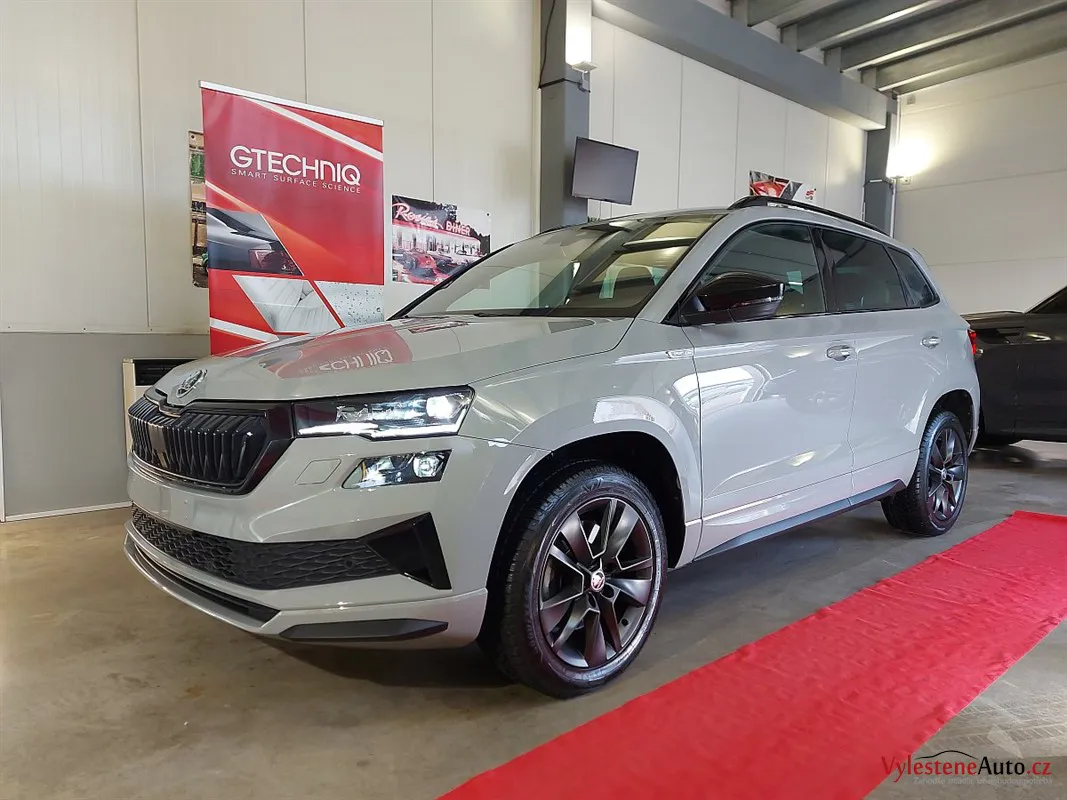 Škoda Karoq, nalakovaná moderní šedou barvou a pyšnící se nejvyšší výbavou a motorem 1.5 TSI EVO. Jedná se o předváděcí, téměř nové auto, které dealer klasicky občas nahnal do kartáčové myčky. Nový pan majitel chtěl utrpěná poškození odstranit a to ho přivedlo k nám.