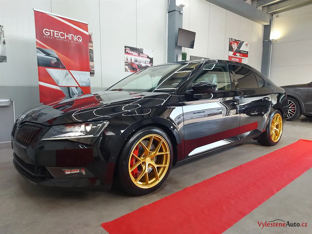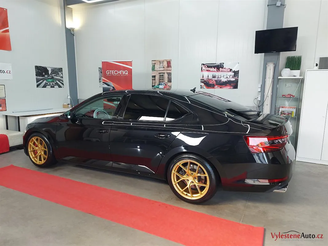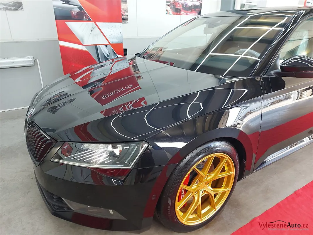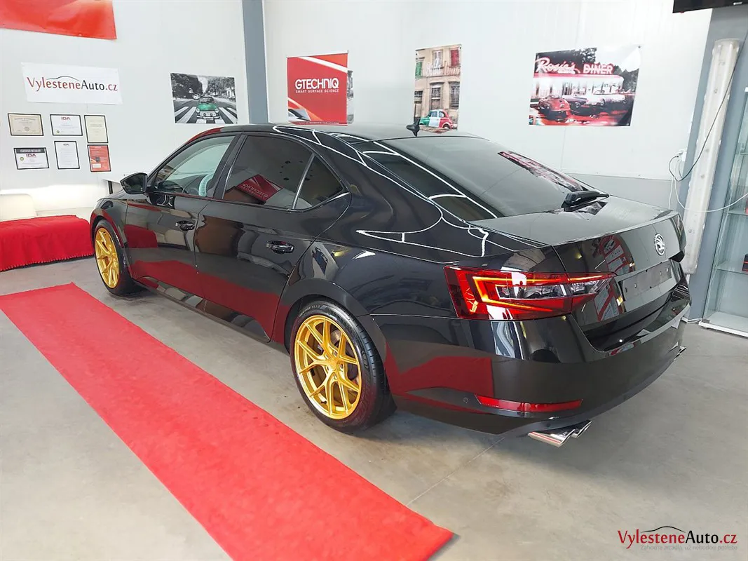 Na první pohled běžná Škoda Superb. Nenechte se ale mýlit! Právě se díváte na Škodu Superb s výkonem 450 koní, upraveným sáním, výfukem Supersprint a sníženým podvozkem. Opticky hodně vyniknou přední brzdy APR a zlatě lakovaná litá kola.