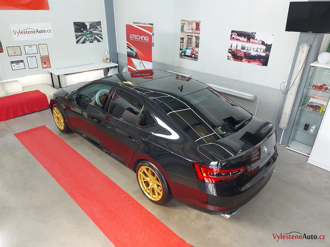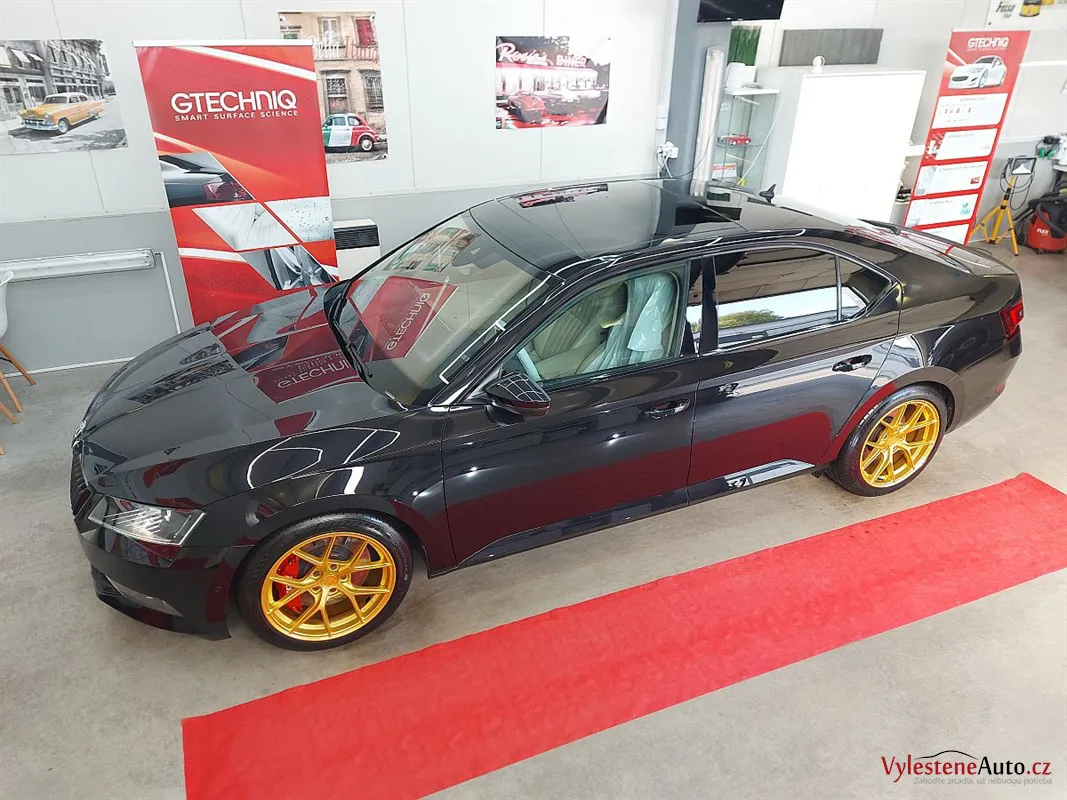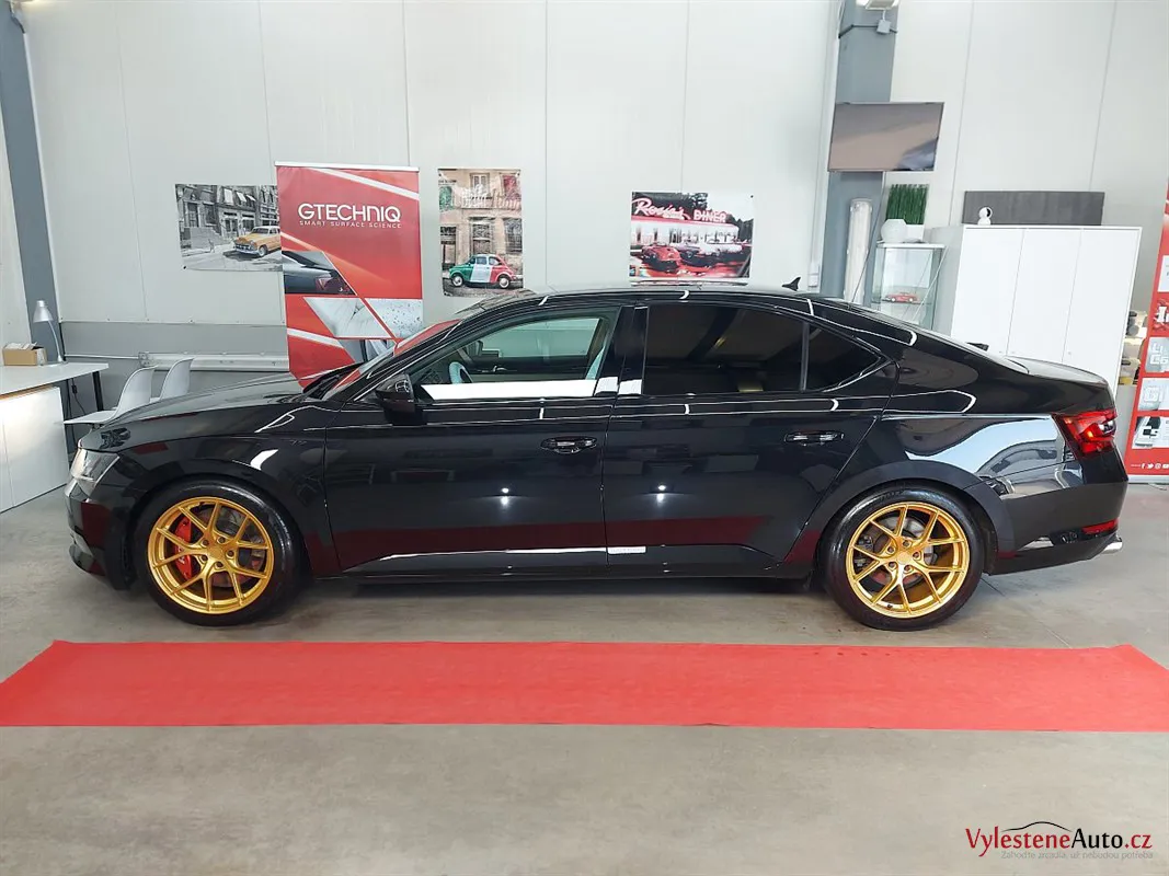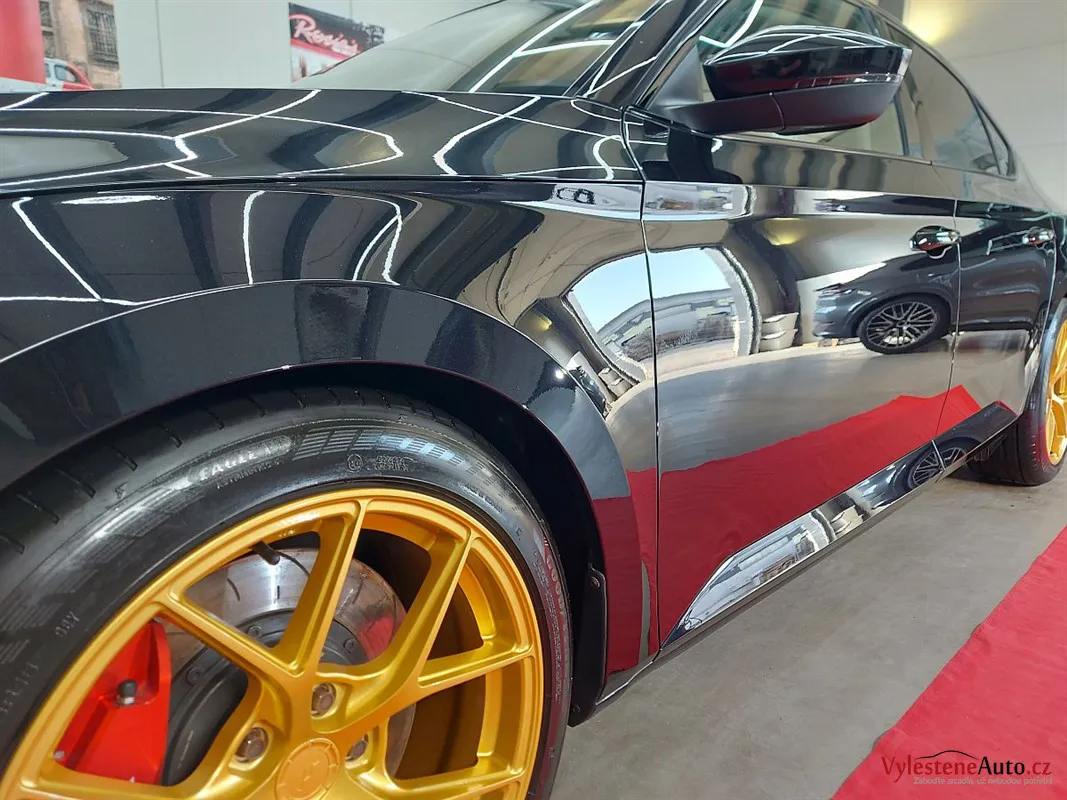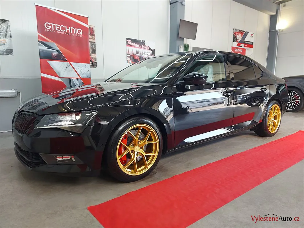 Na první pohled běžná Škoda Superb. Nenechte se ale mýlit! Právě se díváte na Škodu Superb s výkonem 450 koní, upraveným sáním, výfukem Supersprint a sníženým podvozkem. Opticky hodně vyniknou přední brzdy APR a zlatě lakovaná litá kola.