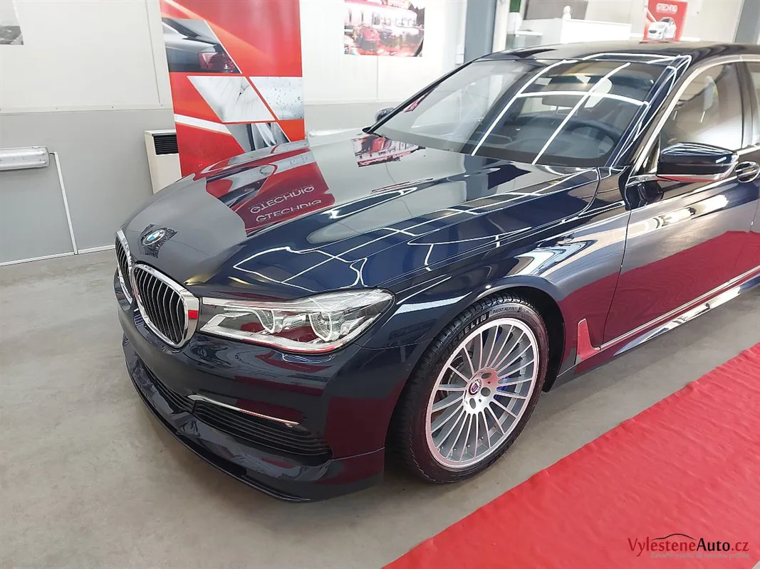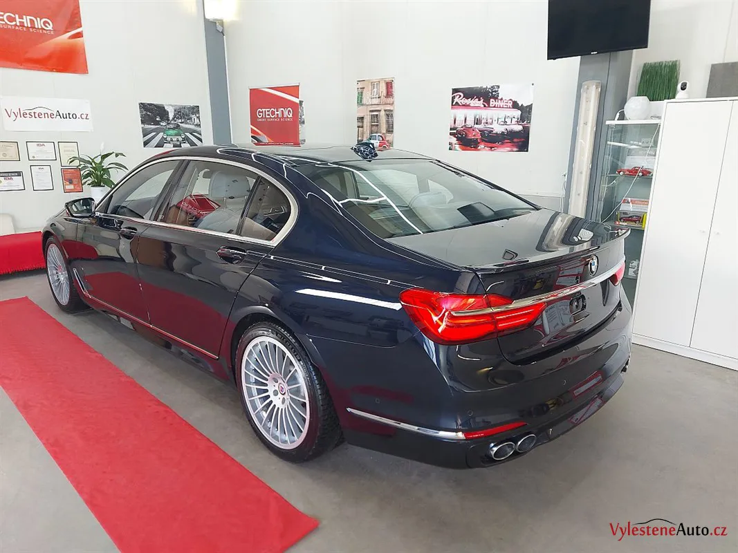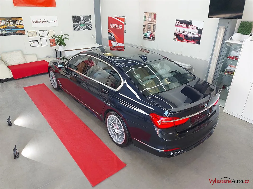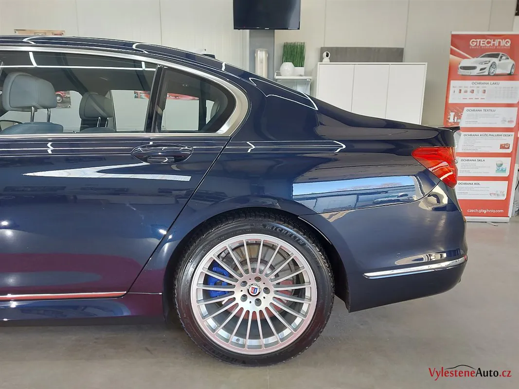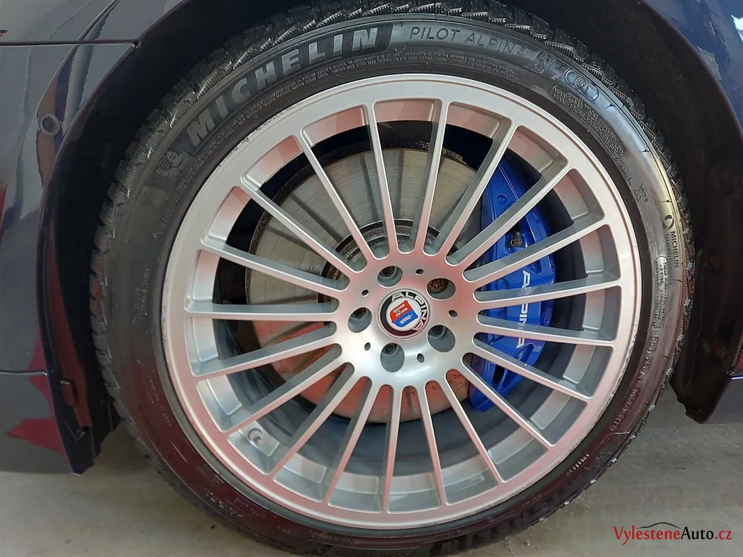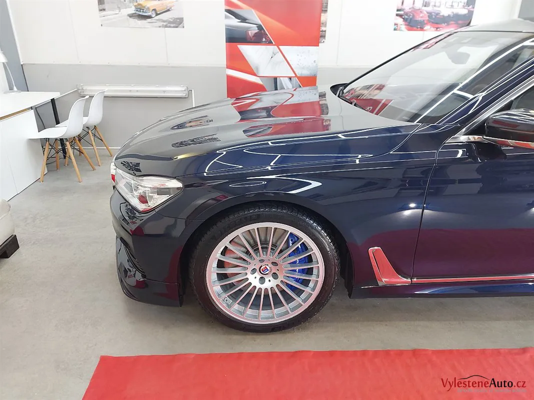 Máme tu další stroj - tentokrát fantastickou Alpinu B7 - ručně poupravený dálniční expres pro znalce s motorem V8 biturbo a výkonem 600 koní. Interiér voní kvalitní kůží a skutečnými dřevěnými dekory, exteriér zdobí lak Imperialblau, čtyři koncovky výfuku a speciální litá kola v tradičním Alpina designu. Tento kus má číslo 122 z limitované edice.